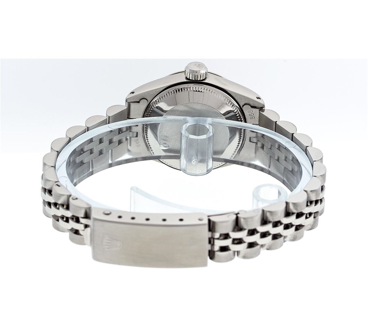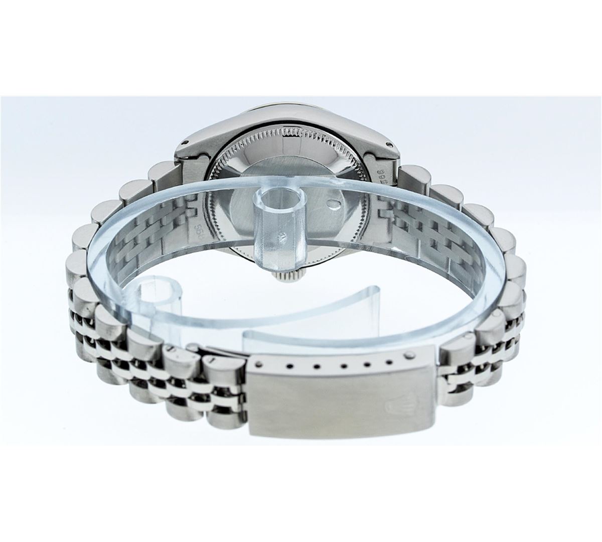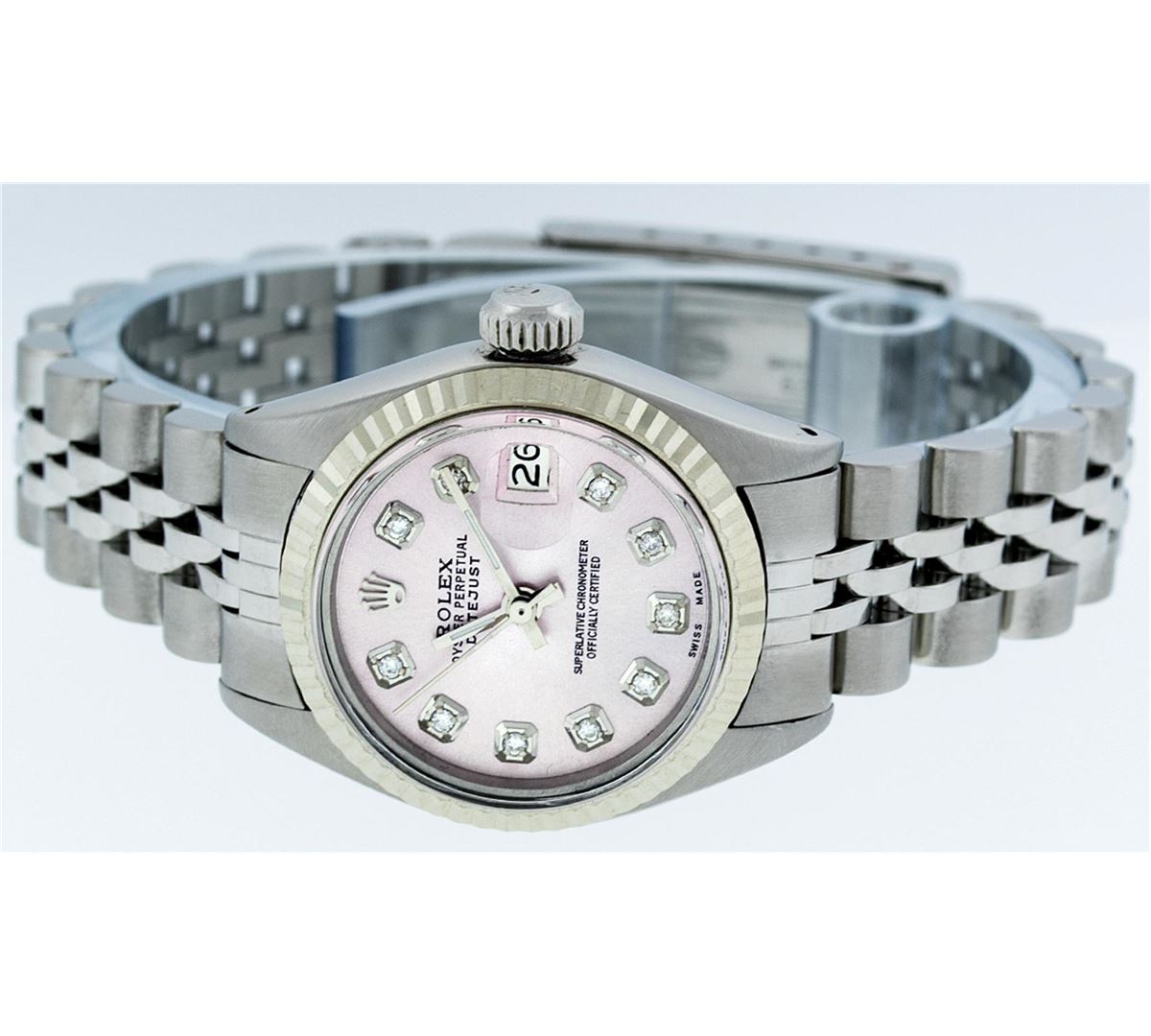 One Ladies Rolex Datejust Polished Bright with Satin Finish, Serviced & Electronically Tested, Stainless Steel Case:26mm, Stainless Steel Crown, Bezel: 14K Fluted Bezel. Custom Crystal: Acrylic Cyclops Lens. Movement: Automatic Winding Movement Caliber 2030. Dial: Ice Pink Diamond Dial. Diamond Count: 10 Diamonds In Dial, Color: G to H, Clarity: SI-VS. Date Window: 3 O'Clock Position Date Display, Model: Datejust. Condition: G-6 Extra Fine. Bracelet: Stainless Steel Jubilee Band. Bright Polish & Satin Finish. 6.0 Inch Length, Adjustable. Standard Clasp, With Rolex Logo. Comes with 6 month warranty.