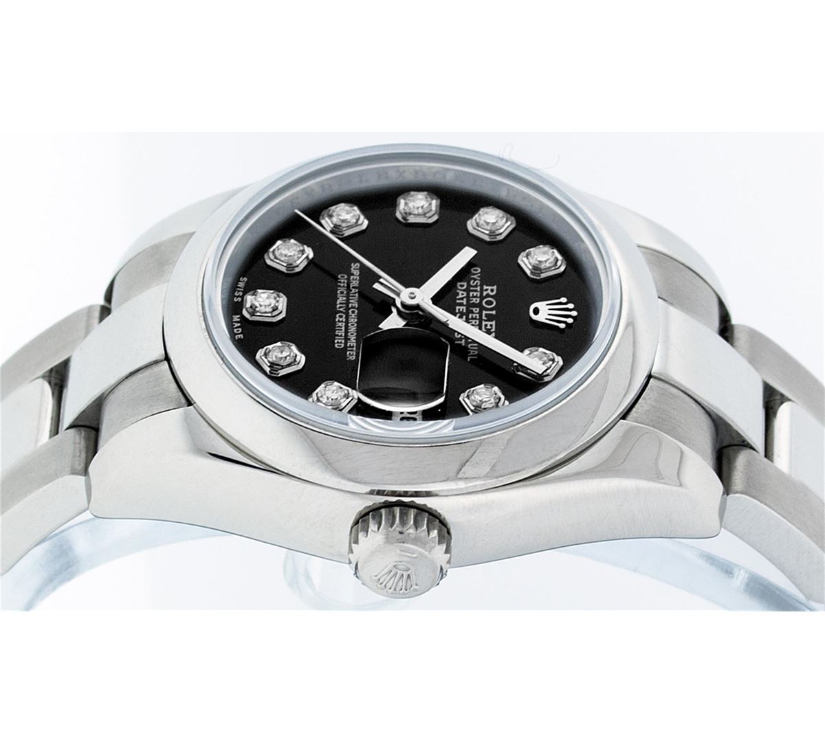 One Ladies Rolex Datejust Polished Bright with Satin Finish, Serviced & Electronically Tested, Stainless Steel Case:26mm, Stainless Steel Crown, Bezel: Stainless Steel Bezel. Custom Crystal: Synthetic Sapphire Cyclops Lens. Movement: Automatic Winding Movement Caliber 2235. Custom Dial: Refinished Black Diamond VVS, Diamond Count: 10 Diamonds in Dial G To H In Color, Clarity: VVS. Date Window: 3 O'Clock Position Date Display, Model: No Hole Quickset Datejust 179160. Condition: G-6 Extra Fine. Bracelet: Stainless Steel Oyster. Bright Polish & Satin Finish. 6.0 Inch Length, Adjustable. Standard Clasp, With Rolex Logo. Comes with 6 month warranty.