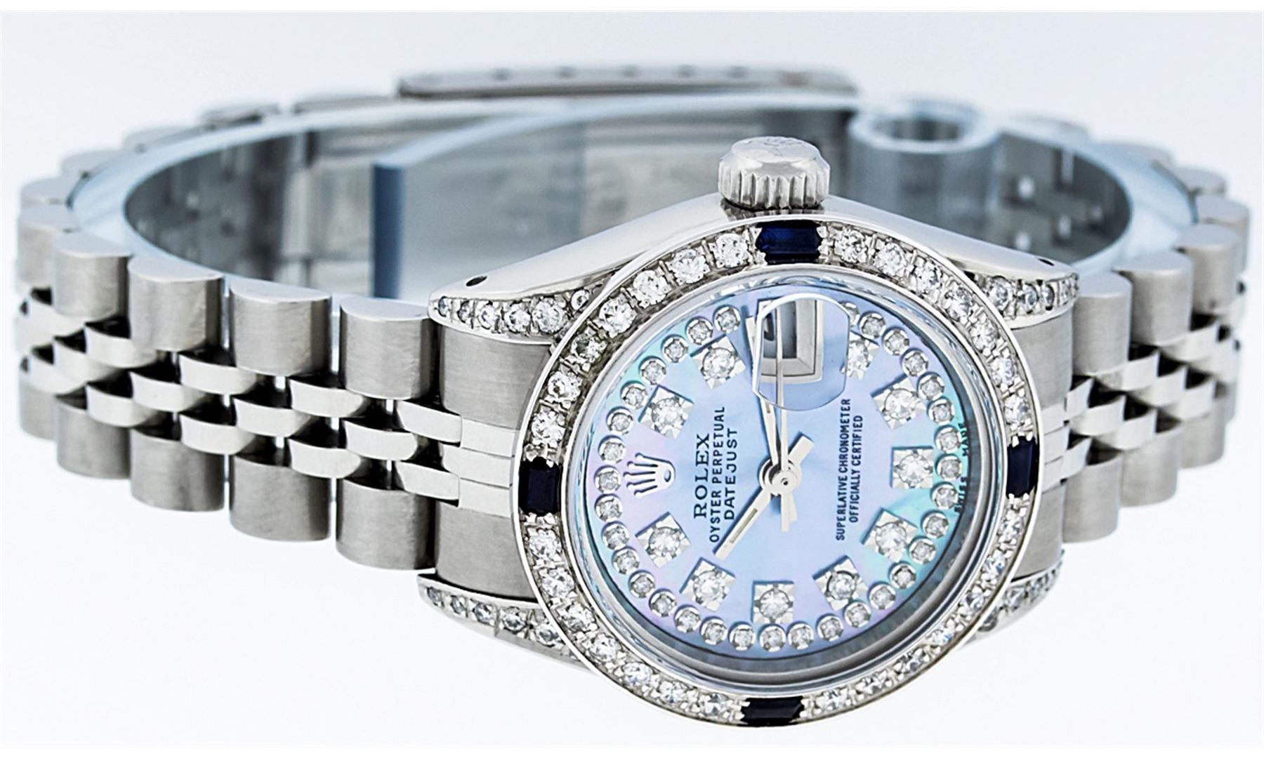 One Ladies Rolex Datejust Polished Bright with Satin Finish, Serviced & Electronically Tested, Stainless Steel Case:26mm, Stainless Steel Crown, Diamond Lugs: 16 Diamonds On Lugs, Clarity: SI-VS, Color: G to H. Custom Bezel: 18K White Gold Sapphire Bezel, Diamond Count: 28 Diamonds + 4 Sapphires, Total Weight 1.00 Carat, Clarity: SI-VS, Color: G to H. Custom Crystal: Synthetic Sapphire Cyclops Lens. Movement: Automatic Winding Movement Caliber 2030. Custom Dial: Refinished Blue MOP With String Diamond Dial, 43 Diamonds in Dial G To H In Color, Clarity: VVS. Date Window: 3 O'Clock Position Date Display, Non Quickset, Model: Datejust. Condition: G-6 Extra Fine. Bracelet: Stainless Steel Jubilee. Bright Polish & Satin Finish. 6.0 Inch Length, Adjustable. Standard Clasp, With Rolex Logo.