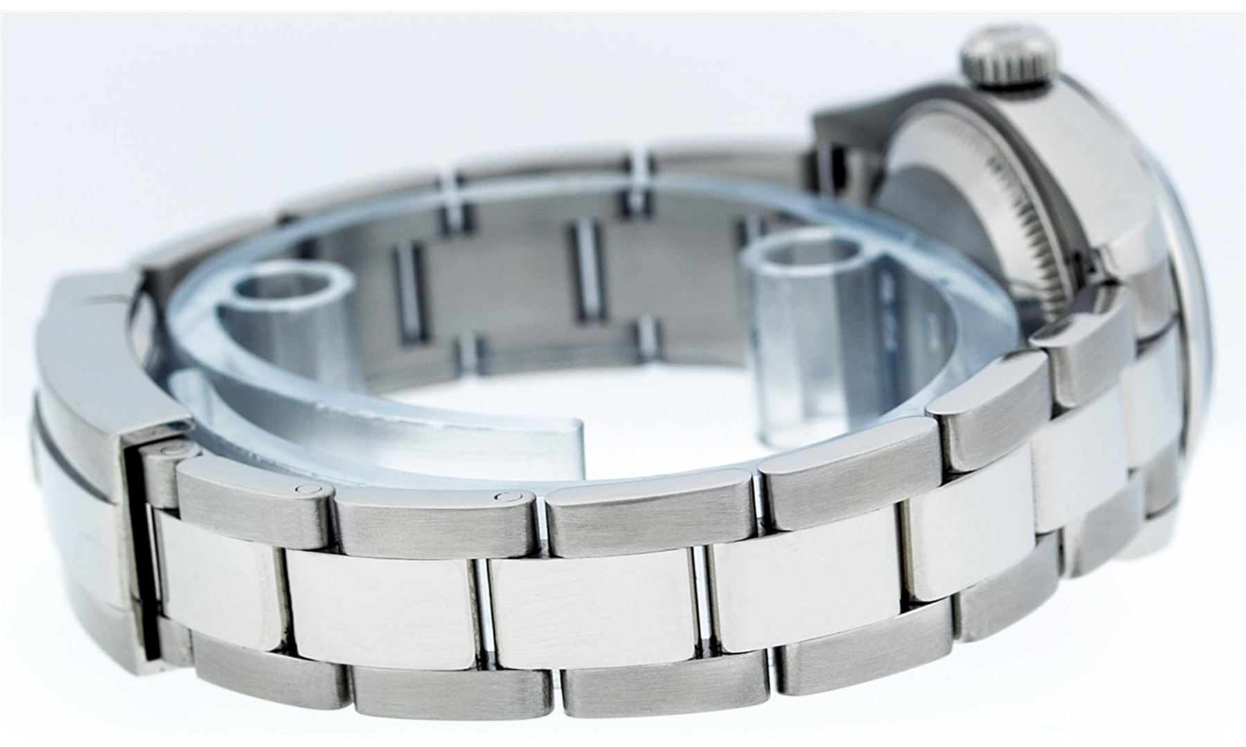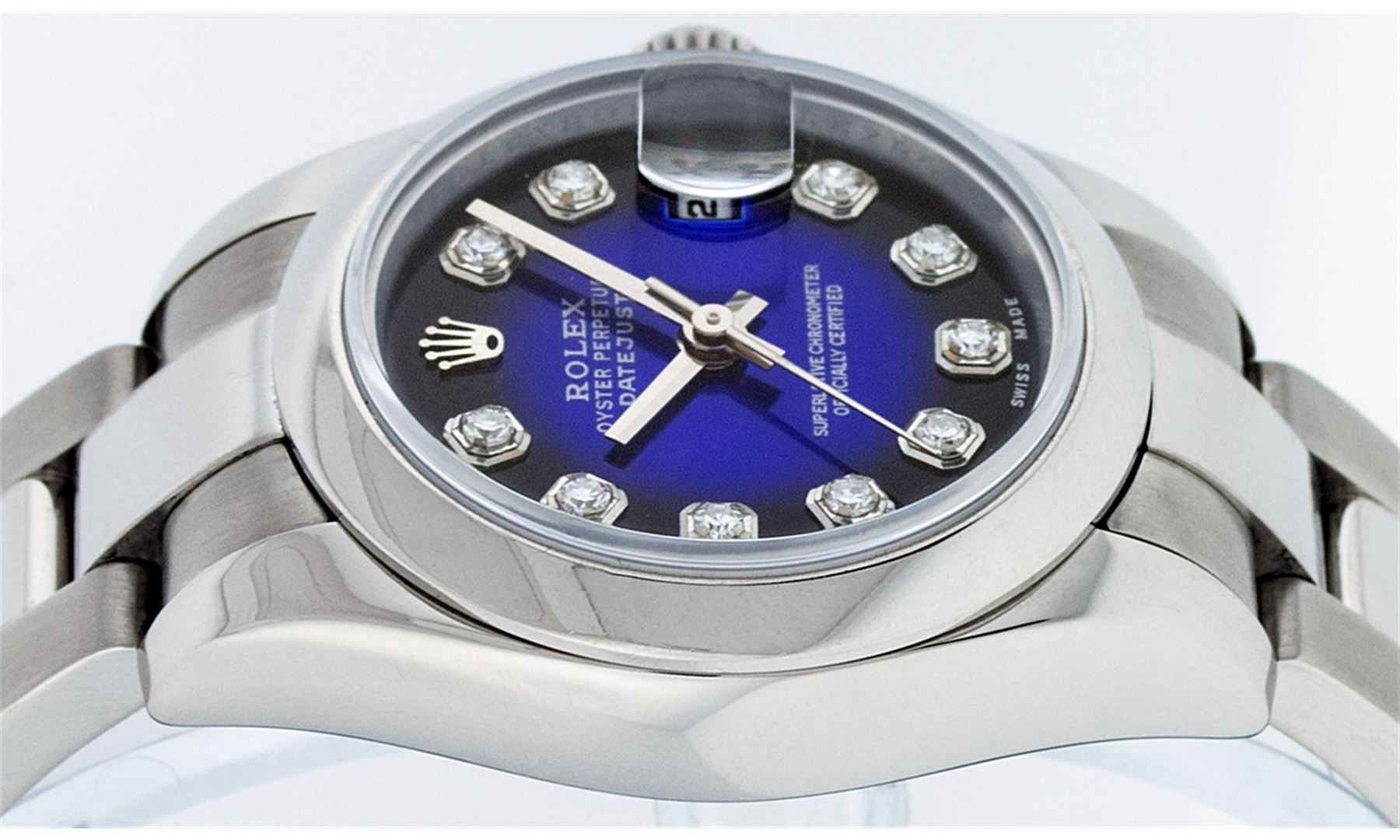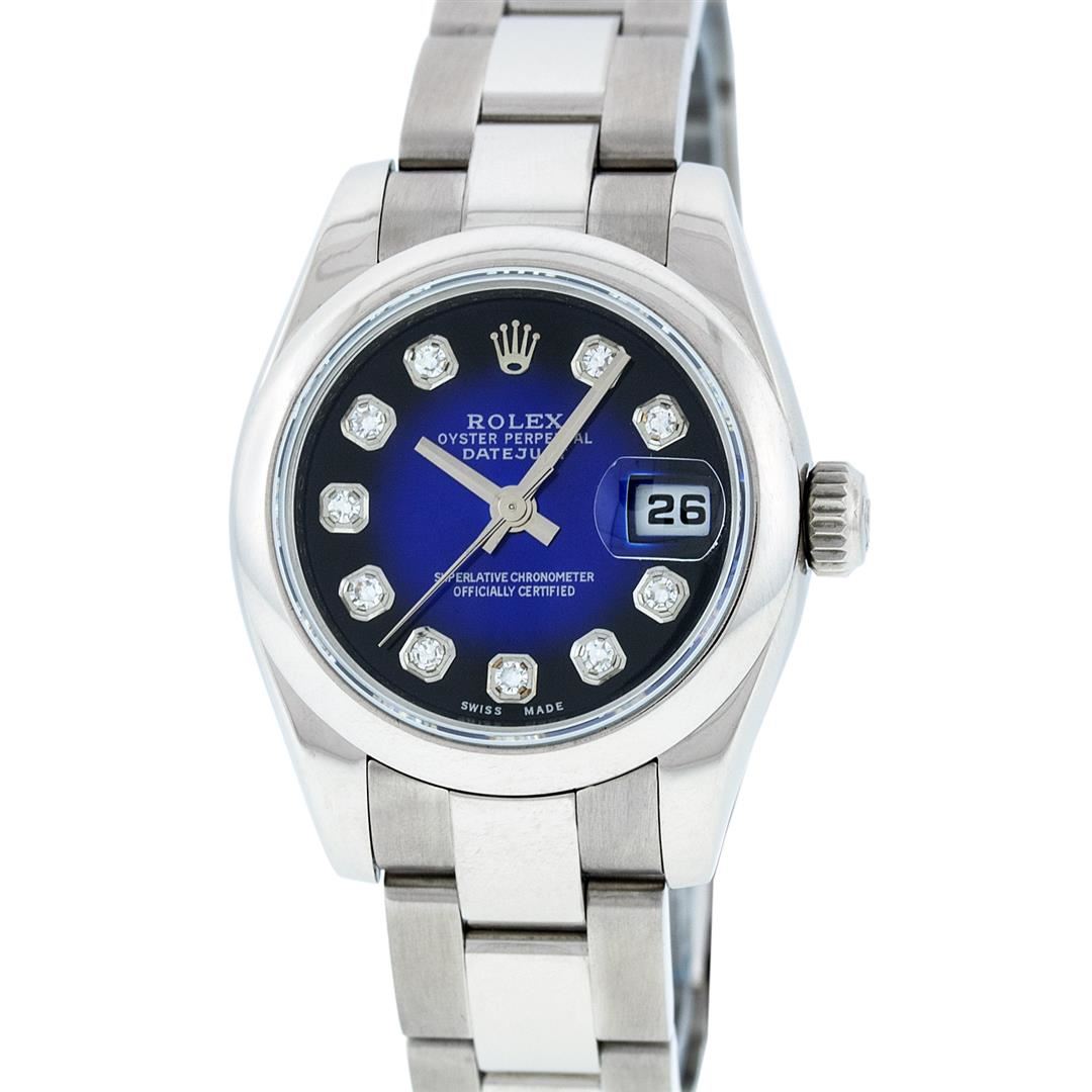 One Ladies Rolex Datejust Polished Bright with Satin Finish, Serviced & Electronically Tested, Stainless Steel Case:26mm, Stainless Steel Crown, Bezel: Stainless Steel Bezel. Custom Crystal: Synthetic Sapphire Cyclops Lens. Movement: Automatic Winding Movement Caliber 2235. Custom Dial: Refinished Blue Vignette Diamond VVS, Diamond Count: 10 Diamonds in Dial G To H In Color, Clarity: VVS. Date Window: 3 O'Clock Position Date Display, Model: No Hole Datejust 179160. Condition: G-6 Extra Fine. Bracelet: Stainless Steel Oyster. Bright Polish & Satin Finish. 6.0 Inch Length, Adjustable. Standard Clasp, With Rolex Logo. Comes with 6 month warranty.