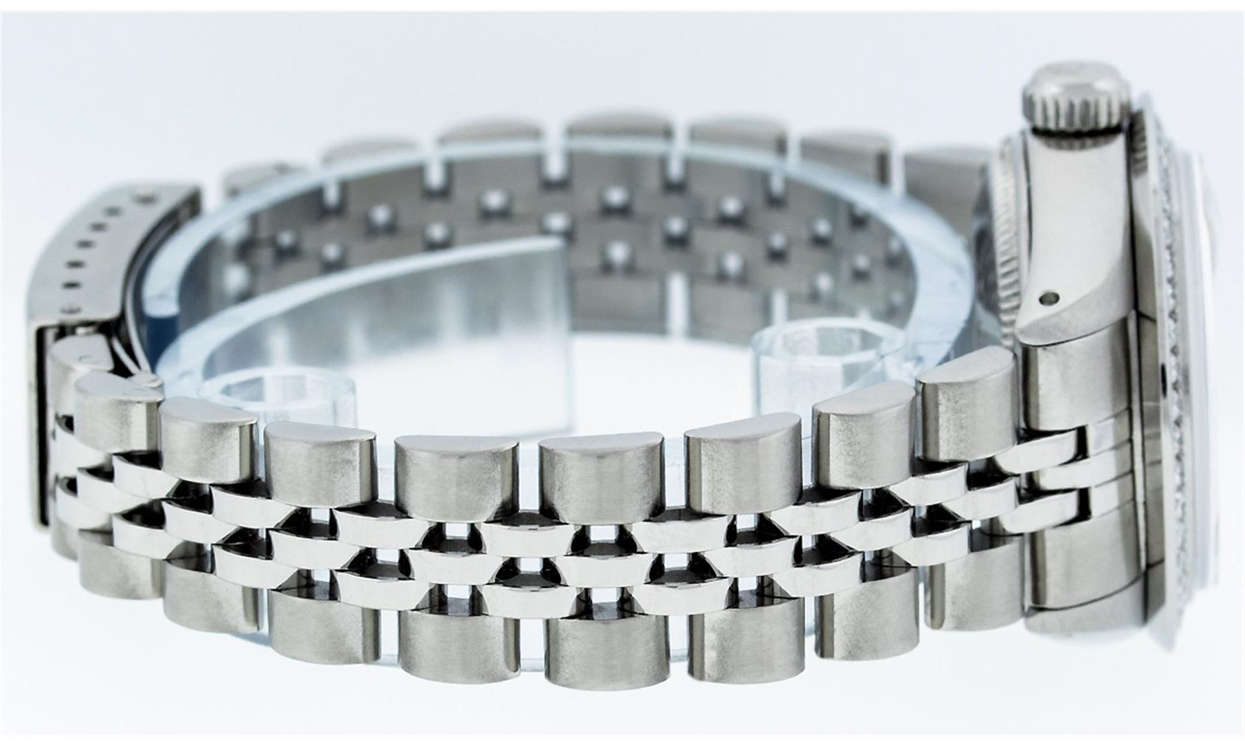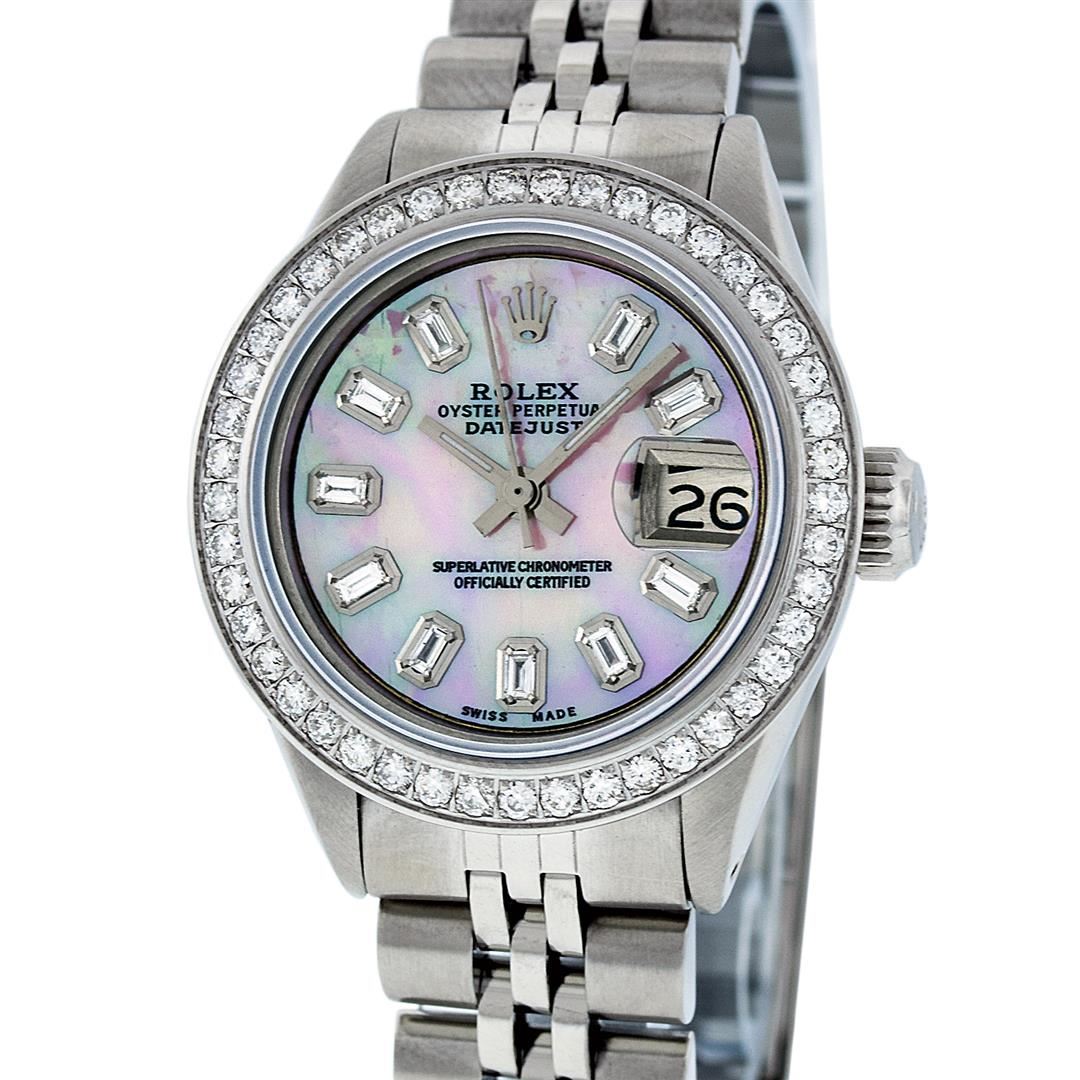 One Ladies Rolex Datejust Polished Bright with Satin Finish, Serviced & Electronically Tested, Stainless Steel Case:26mm, Stainless Steel Crown, Custom Bezel: Stainless Steel Beadset Diamond Bezel, Diamond Count: 44 Diamonds Total Weight 1.00 Carat, Clarity: SI-VS, Color: G to H. Custom Crystal: Synthetic Sapphire Cyclops Lens. Movement: Automatic Winding Movement Caliber 2030. Custom Dial: Refinished Pink Mother Of Pearl With Baguette Diamond Hour Markers, Diamond Count: 10 Baguette Diamonds in Dial G To H In Color, Clarity: SI-VS. Date Window: 3 O'Clock Position Date Display, Non Quickset, Model: Datejust. Condition: G-6 Extra Fine. Bracelet: Stainless Steel Jubilee Band. Bright Polish & Satin Finish. 6.0 Inch Length, Adjustable. Standard Clasp, With Rolex Logo.