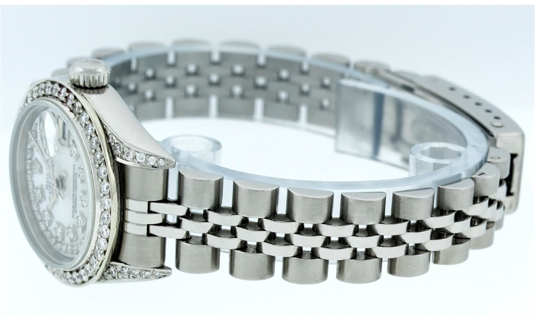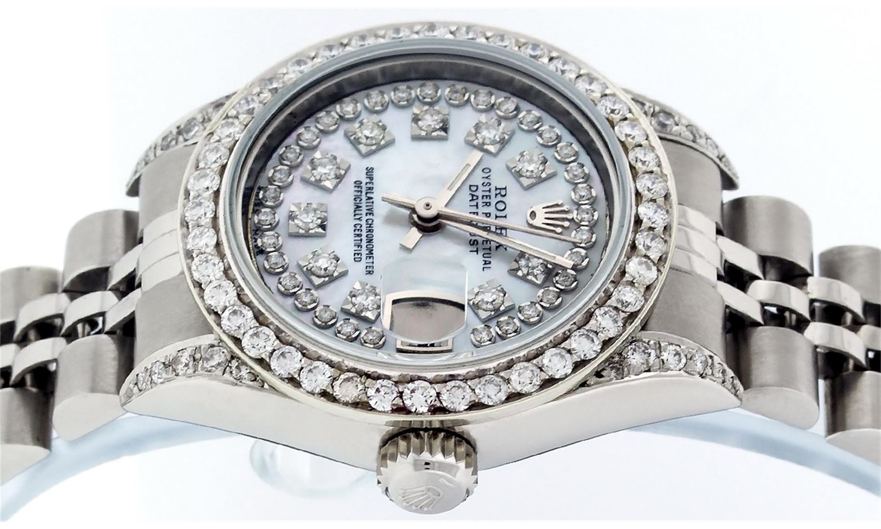One Ladies Stainless Steel Rolex Datejust Polished Bright with Satin Finish, Serviced & Electronically Tested, Stainless Steel Case:26mm, Stainless Steel Crown, Diamond Lugs: 16 Diamonds On Lugs, Clarity: SI-VS, Color: G to H. Custom Bezel: Stainless Steel Beadset Bezel, Diamond Count: 40 Diamonds, Total Weight 1.00 Carat, Clarity: SI-VS, Color: G to H. Custom Crystal: Synthetic Sapphire Cyclops Lens. Movement: Automatic Winding Movement Caliber 2235. Custom Dial: Refinished Mother Of Pearl With String Diamond Dial VVS, 43 Diamonds in Dial G To H In Color, Clarity: VVS. Date Window: 3 O'Clock Position Date Display, Model: No Hole Datejust Quickset. Condition: G-6 Extra Fine The Watch Is In Very Good Condition Free Of All Scratches And Dents. . Bracelet: Stainless Steel Jubilee Band. Bright Polish & Satin Finish. 6.0 Inch Length, Adjustable. Standard Clasp, With Rolex Logo.