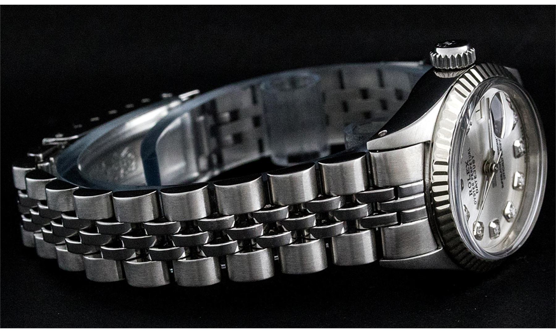 One Ladies Rolex Datejust Polished Bright with Satin Finish, Serviced & Electronically Tested, Stainless Steel Case:26mm, Stainless Steel Crown, Bezel: 14K White Gold Fluted. Custom Crystal: Acrylic Cyclops Lens. Movement: Automatic Winding Movement Caliber 2030. Custom Dial: Silver With Diamond Hour Markers, Diamond Count: 10 Diamonds, Clarity: SI-VS, Color: G to H. Date Window: 3 O'Clock Position Date Display, Model: Datejust. Condition: G-6 Extra Fine. Bracelet: Stainless Steel Jubilee Band. Bright Polish & Satin Finish. 6.0 Inch Length, Adjustable. Standard Clasp, With Rolex Logo. Comes with 6 month warranty.