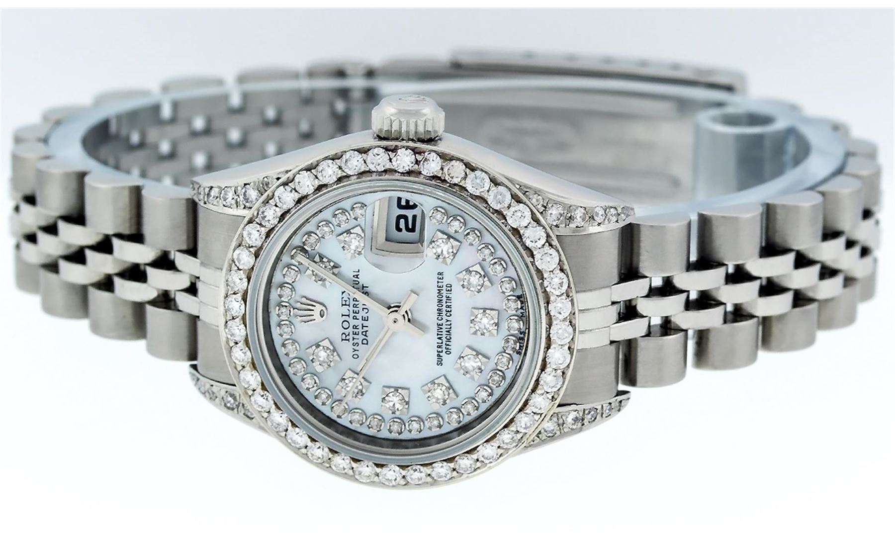 One Ladies Stainless Steel Rolex Datejust Polished Bright with Satin Finish, Serviced & Electronically Tested, Stainless Steel Case:26mm, Stainless Steel Crown, Diamond Lugs: 16 Diamonds On Lugs, Clarity: SI-VS, Color: G to H. Custom Bezel: Stainless Steel Beadset Bezel, Diamond Count: 40 Diamonds, Total Weight 1.00 Carat, Clarity: SI-VS, Color: G to H. Custom Crystal: Synthetic Sapphire Cyclops Lens. Movement: Automatic Winding Movement Caliber 2235. Custom Dial: Refinished Mother Of Pearl With String Diamond Dial VVS, 43 Diamonds in Dial G To H In Color, Clarity: VVS. Date Window: 3 O'Clock Position Date Display, Model: No Hole Datejust Quickset. Condition: G-6 Extra Fine The Watch Is In Very Good Condition Free Of All Scratches And Dents. . Bracelet: Stainless Steel Jubilee Band. Bright Polish & Satin Finish. 6.0 Inch Length, Adjustable. Standard Clasp, With Rolex Logo.