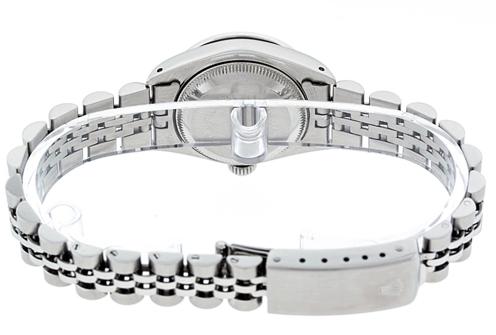 One Ladies Rolex Datejust Polished Bright with Satin Finish, Serviced & Electronically Tested, Stainless Steel Case:26mm, Stainless Steel Crown, Diamond Lugs: 16 Diamonds On Lugs, Clarity: SI-VS, Color: G to H. Custom Bezel: 18K White Gold Beadset Bezel, Diamond Count: 32 Diamonds, Total Weight 1.00 Carat, Clarity: SI-VS, Color: G to H. Custom Crystal: Synthetic Sapphire Cyclops Lens. Movement: Automatic Winding Movement Caliber 2030. Custom Dial: Refinished Purple String With Diamond Dial, 43 Diamonds in Dial G To H In Color, Clarity: VVS. Date Window: 3 O'Clock Position Date Display, Model: Datejust Condition: G-6 Extra Fine. Bracelet: Stainless Steel Jubilee. Bright Polish & Satin Finish. 6.0 Inch Length, Adjustable. Standard Clasp, With Rolex Logo. Comes with 6 month warranty.