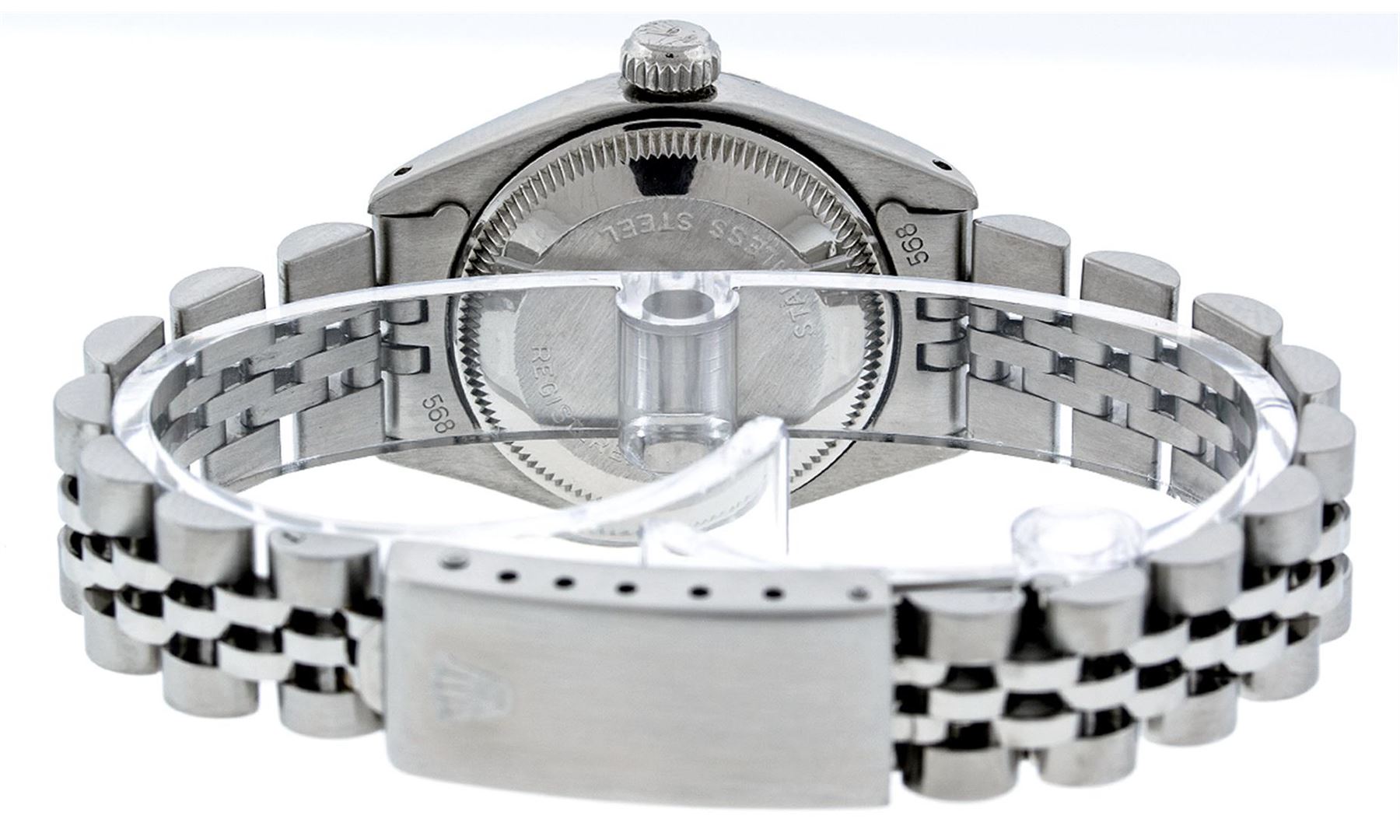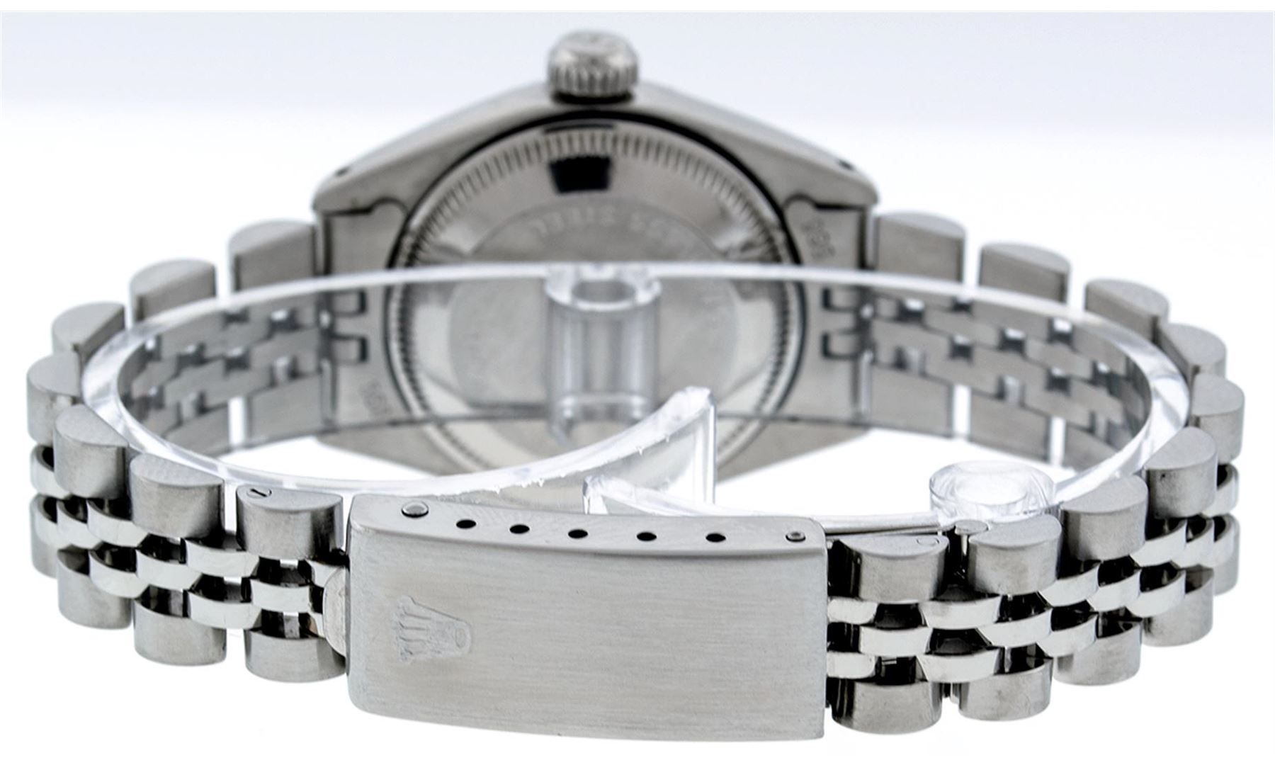 One Ladies Rolex Datejust Polished Bright with Satin Finish, Serviced & Electronically Tested, Stainless Steel Case:26mm, Stainless Steel Crown, Bezel: 14K White Gold Fluted. Custom Crystal: Acrylic Cyclops Lens. Movement: Automatic Winding Movement Caliber 2030. Custom Dial: Slate Grey With Diamond Hour Markers, Diamond Count: 10 Diamonds, Clarity: SI-VS, Color: G to H. Date Window: 3 O'Clock Position Date Display, Model: Datejust. Condition: G-6 Extra Fine. Bracelet: Stainless Steel Jubilee Band. Bright Polish & Satin Finish. 6.0 Inch Length, Adjustable. Standard Clasp, With Rolex Logo. Comes with 6 month warranty.