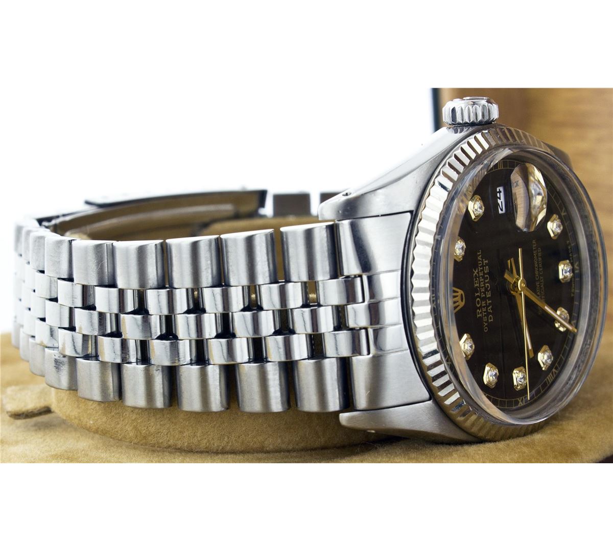 One Gents Rolex Datejust Polished, Serviced & Electronically Tested, Stainless Steel Case:36mm, Stainless Steel Crown, Custom Bezel: 18K White Gold Fluted Bezel. Custom Crystal: Synthetic Sapphire Cyclops Lens. Movement: Automatic Winding Movement Caliber 3035. Custom Dial: Black Diamond Dial, Diamond Count: 10 Diamonds, Clarity: SI-VS, Color: G to H. Date Window: 3 O'Clock Position Date Display, Quickset, Model: 16014 Condition: G-6 Extra Fine. Bracelet: Stainless Steel Jubilee. Bright Polish & Satin Finish. 6.5 Inch Length, Adjustable. Standard Clasp, With Rolex Logo.