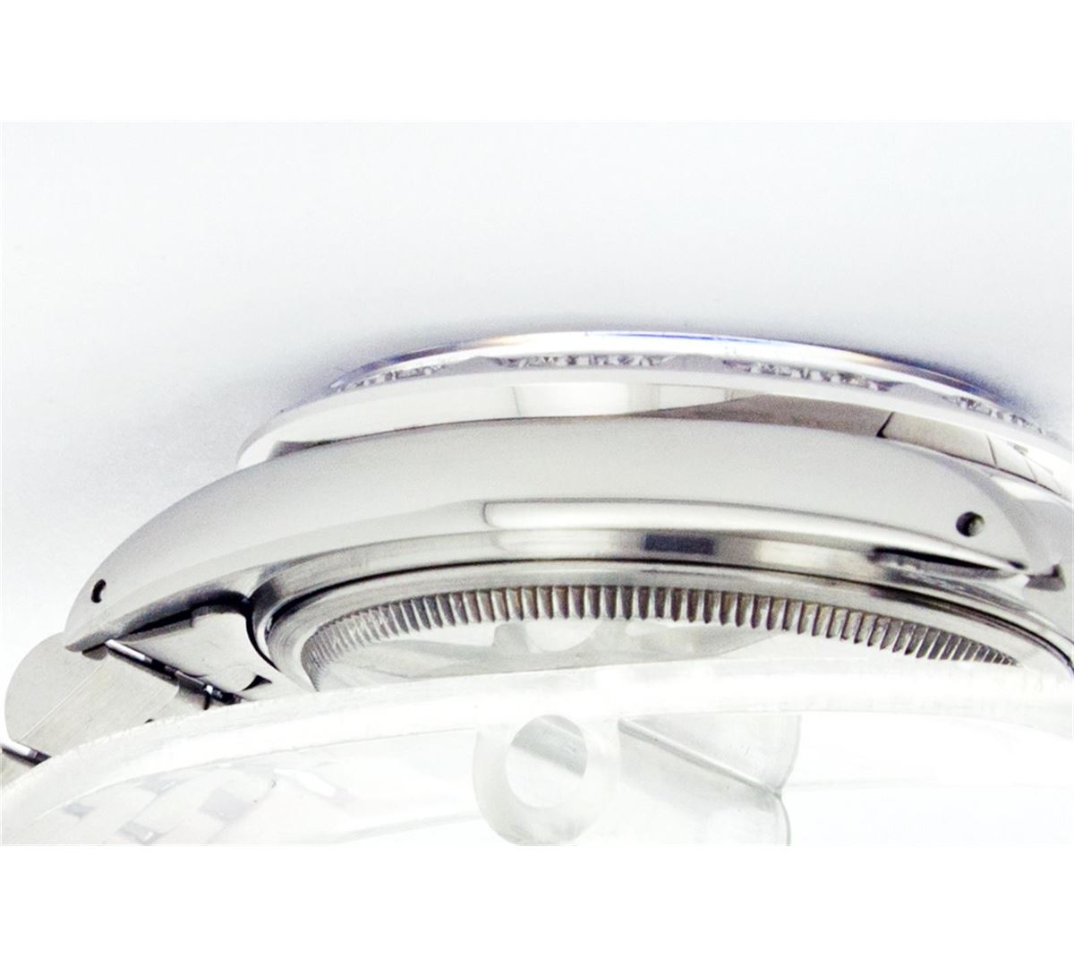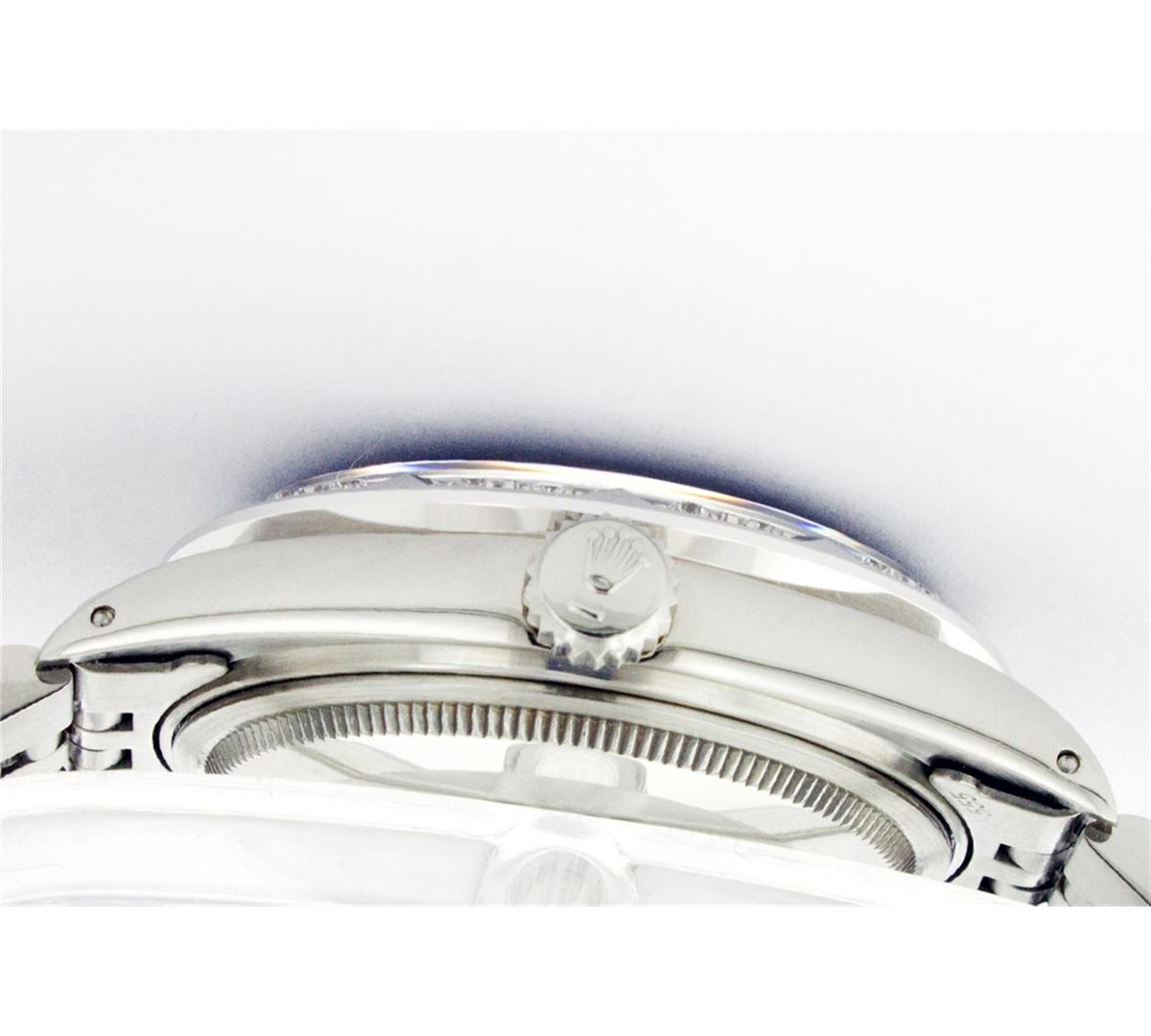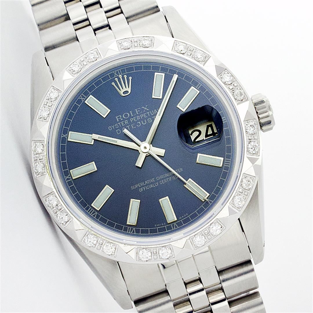 One Mens Rolex Datejust Polished Bright with Satin Finish, Serviced & Electronically Tested, Stainless Steel Case:36mm, Stainless Steel Crown, Custom Bezel: 18K White Gold Pyramid Diamond Bezel, Diamond Count: 24 Diamonds Total Weight .70 Carat, Clarity: SI-VS, Color: G to H. Custom Crystal: Synthetic Sapphire Cyclops Lens. Movement: Automatic Winding Movement Caliber 3035. Custom Dial: Blue Index Dial. Date Window: 3 O'Clock Position Date Display, Quickset, Model: 16014 Condition: G-6 Extra Fine. Bracelet: Stainless Steel Jubilee. Bright Polish & Satin Finish. 6.5 Inch Length, Adjustable. Standard Clasp, With Rolex Logo.