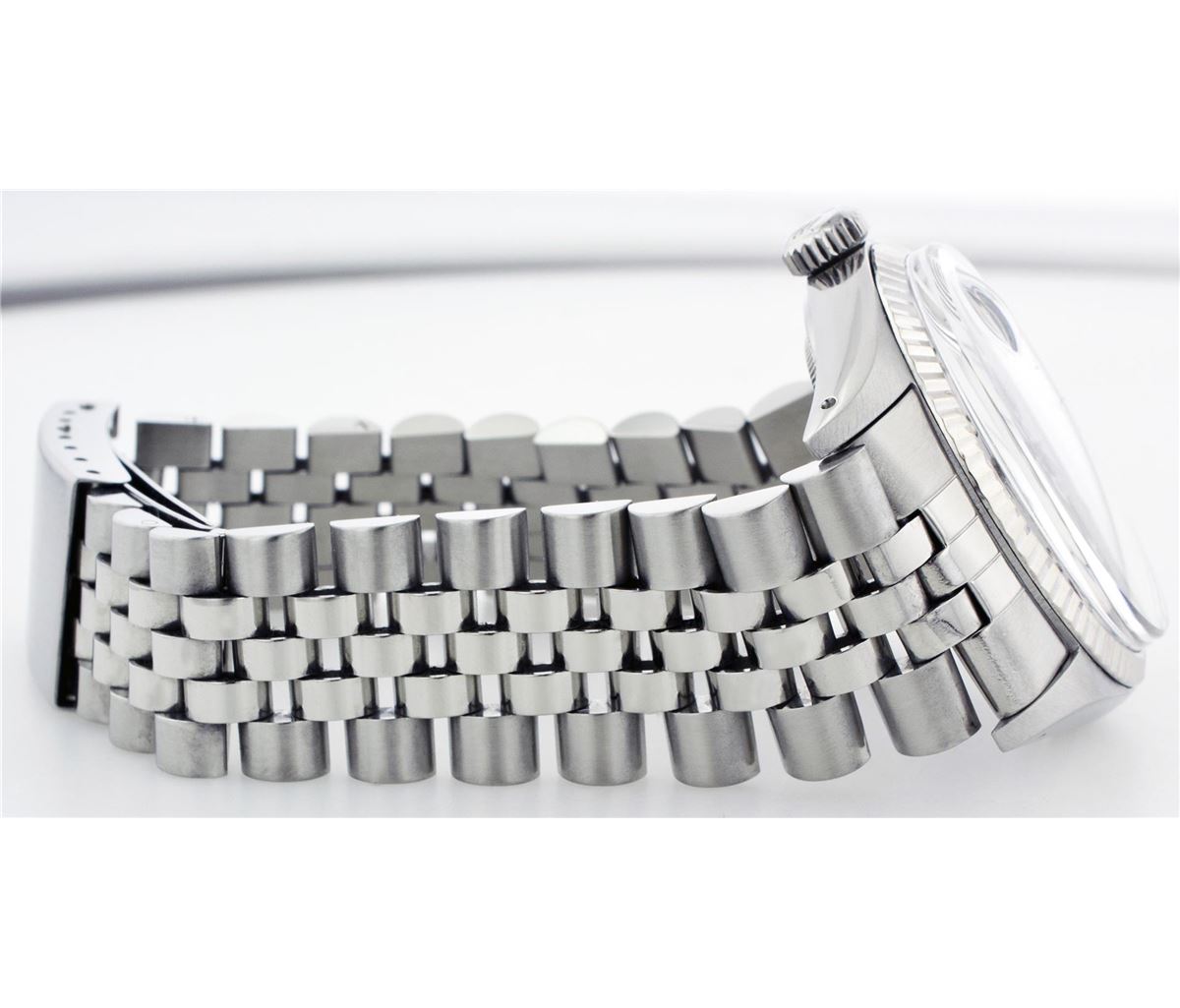One Gents Rolex Datejust Polished, Serviced & Electronically Tested, Stainless Steel Case:36mm, Stainless Steel Crown, Bezel: 18K White Gold Fluted Bezel. Custom Crystal: Acrylic Cyclops Lens. Movement: Automatic Winding Movement Caliber 3035. Custom Dial: Grey Dial With Diamond Hour Markers, Diamond Count: 10 Diamonds, Clarity: SI-VS, Color: G To H. Date Window: 3 O'Clock Position Date Display, Quickset, Model: 16014 Condition: G-6 Extra Fine. Bracelet: Stainless Steel Jubilee. Bright Polish & Satin Finish. 6.5 Inch Length, Adjustable. Standard Clasp, With Rolex Logo.