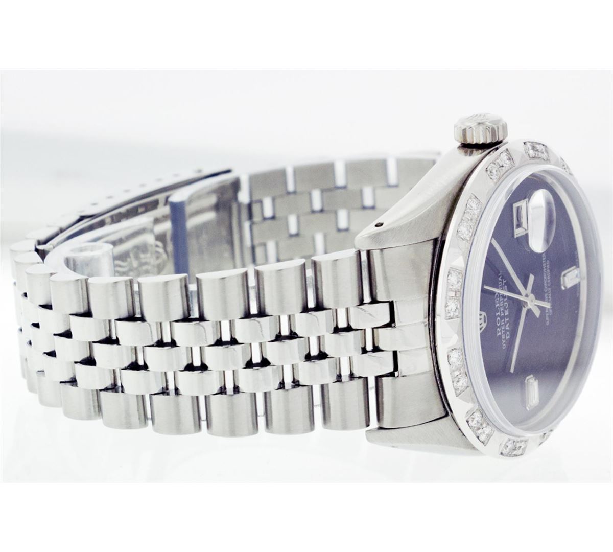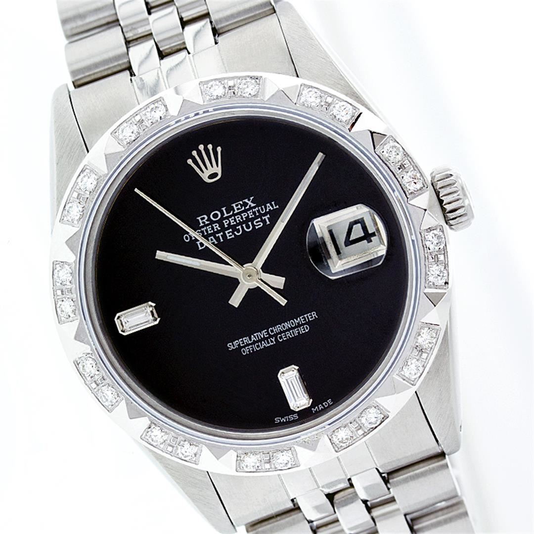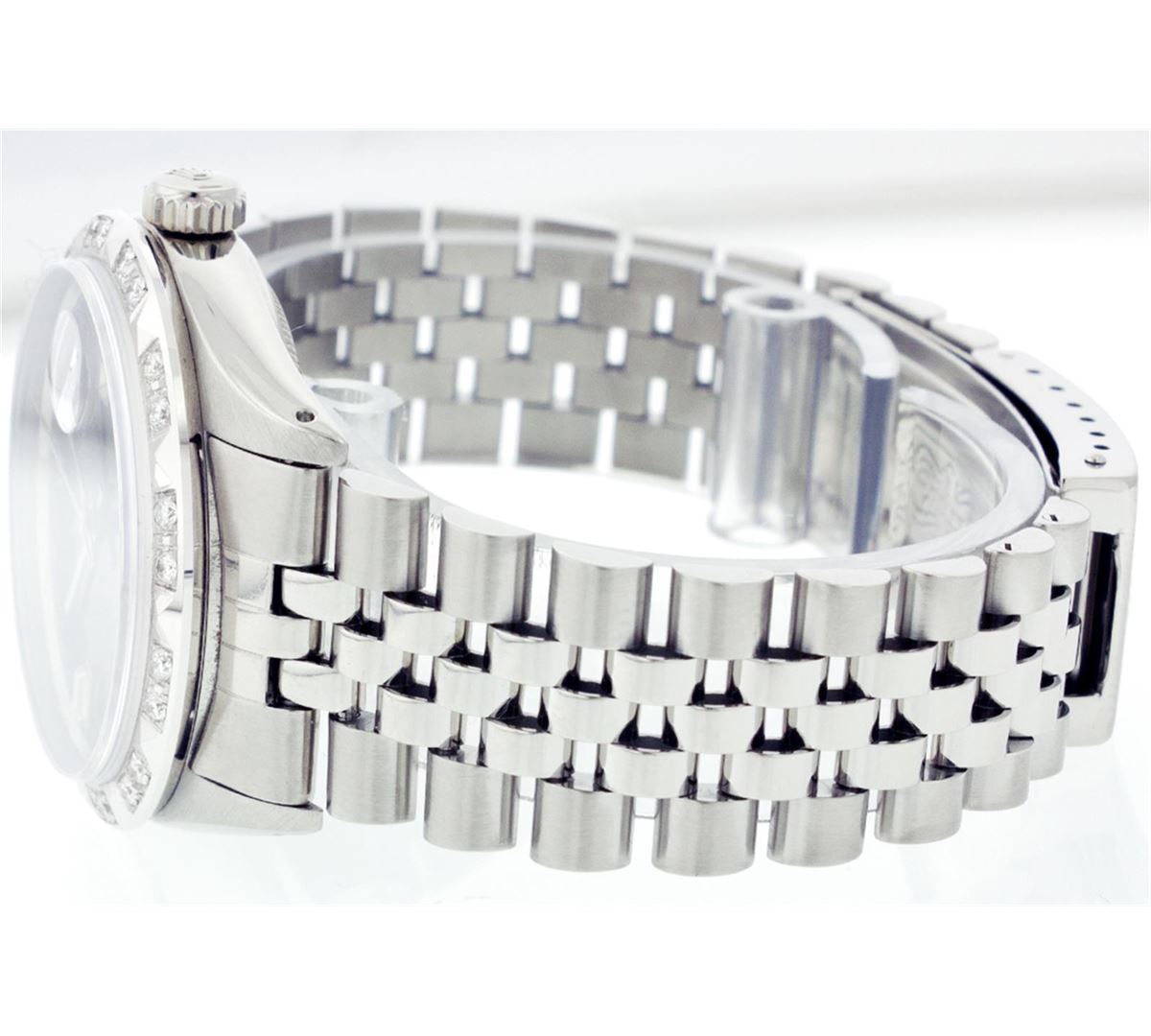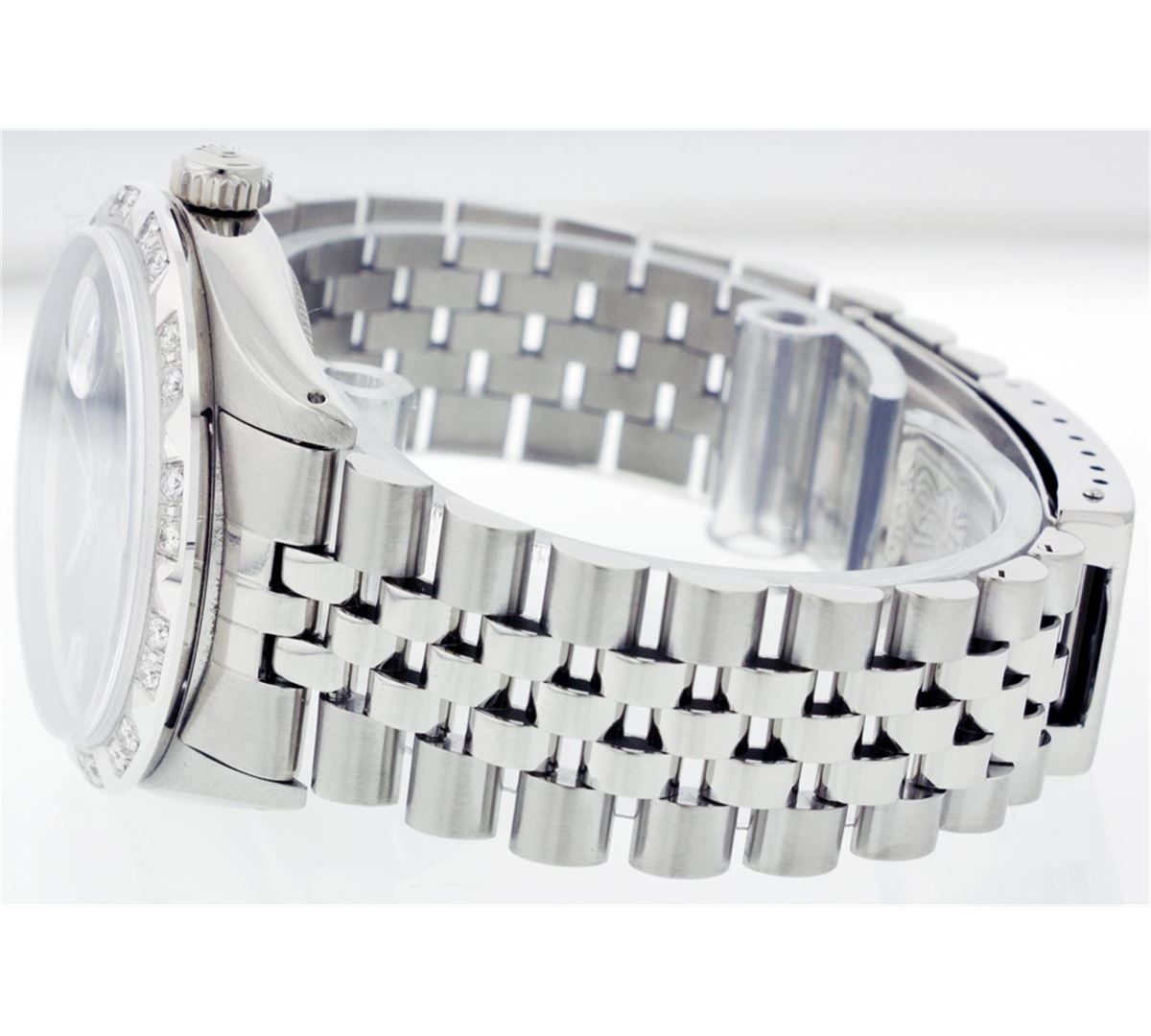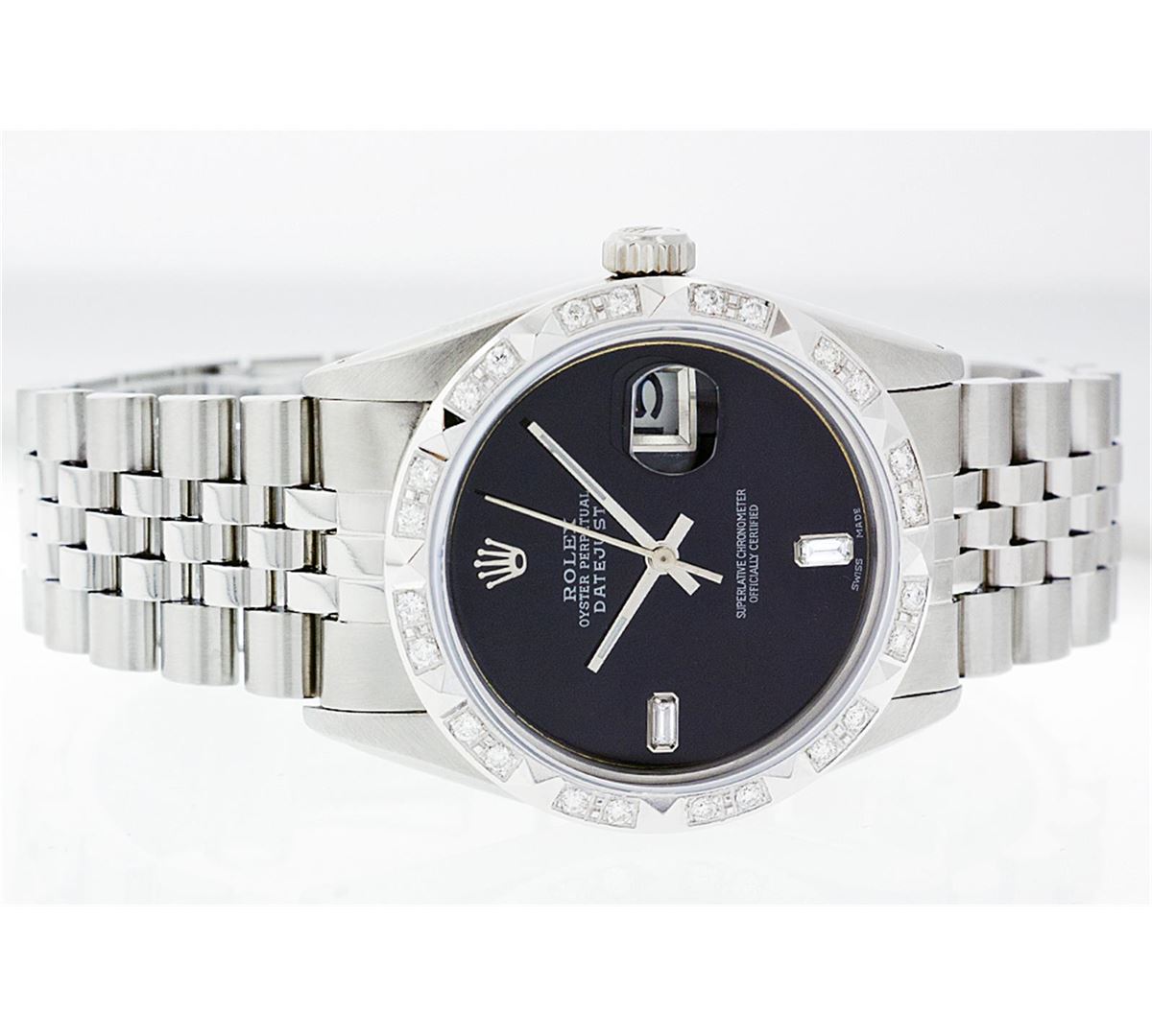 One Mens Rolex Datejust Polished Bright with Satin Finish, Serviced & Electronically Tested, Stainless Steel Case:36mm, Stainless Steel Crown, Custom Bezel: 18K White Gold Pyramid Diamond Bezel, Diamond Count: 24 Diamonds Total Weight .70 Carat, Clarity: SI-VS, Color: G to H. Custom Crystal: Synthetic Sapphire Cyclops Lens. Movement: Automatic Winding Movement Caliber 3035. Custom Dial: Black Dial With 2 Baguette Diamonds, 2 Diamond Dial G To H In Color, Clarity: SI-VS. Date Window: 3 O'Clock Position Date Display, Quickset, Model: 16014 Condition: G-6 Extra Fine. Bracelet: Stainless Steel Jubilee. Bright Polish & Satin Finish. 6.5 Inch Length, Adjustable. Standard Clasp, With Rolex Logo.