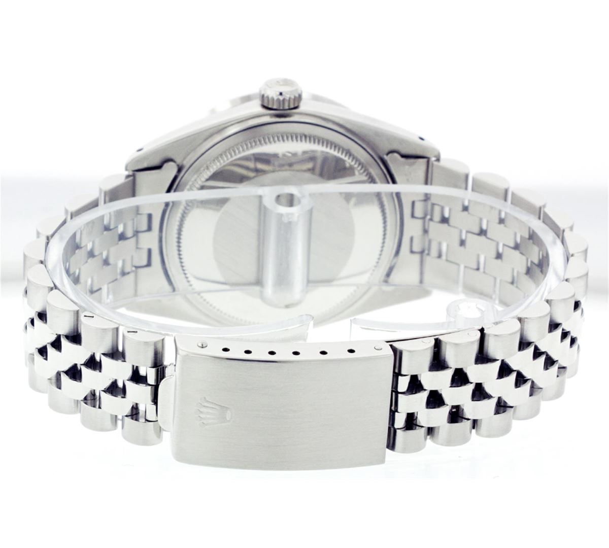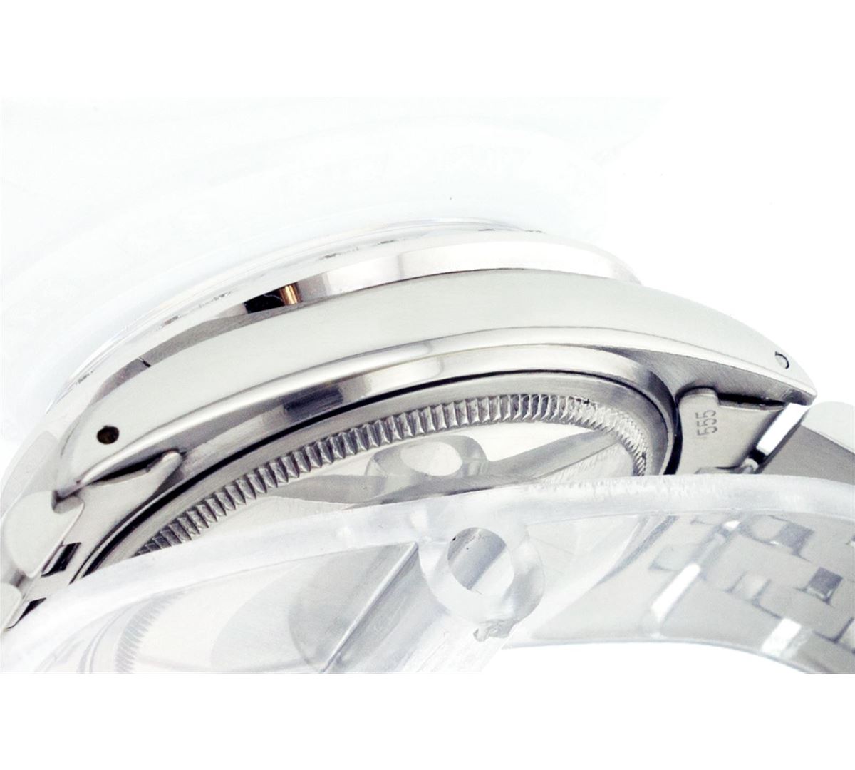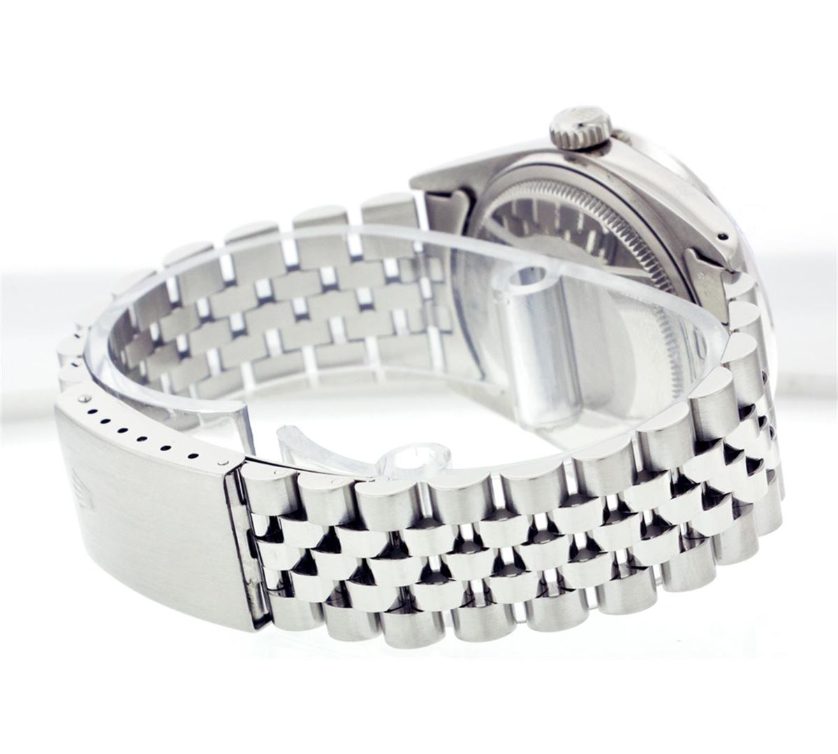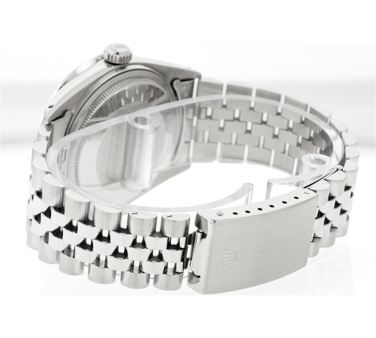 One Mens Rolex Datejust Polished Bright with Satin Finish, Serviced & Electronically Tested, Stainless Steel Case:36mm, Stainless Steel Crown, Custom Bezel: 18K White Gold Pyramid Diamond Bezel, Diamond Count: 24 Diamonds Total Weight .70 Carat, Clarity: SI-VS, Color: G to H. Custom Crystal: Synthetic Sapphire Cyclops Lens. Movement: Automatic Winding Movement Caliber 3035. Custom Dial: Black Dial With 2 Baguette Diamonds, 2 Diamond Dial G To H In Color, Clarity: SI-VS. Date Window: 3 O'Clock Position Date Display, Quickset, Model: 16014 Condition: G-6 Extra Fine. Bracelet: Stainless Steel Jubilee. Bright Polish & Satin Finish. 6.5 Inch Length, Adjustable. Standard Clasp, With Rolex Logo.