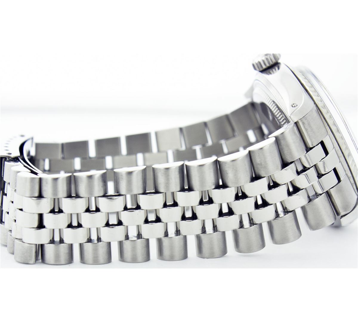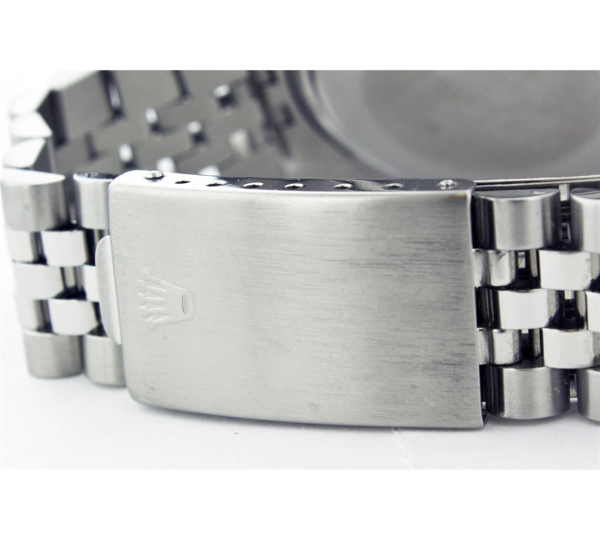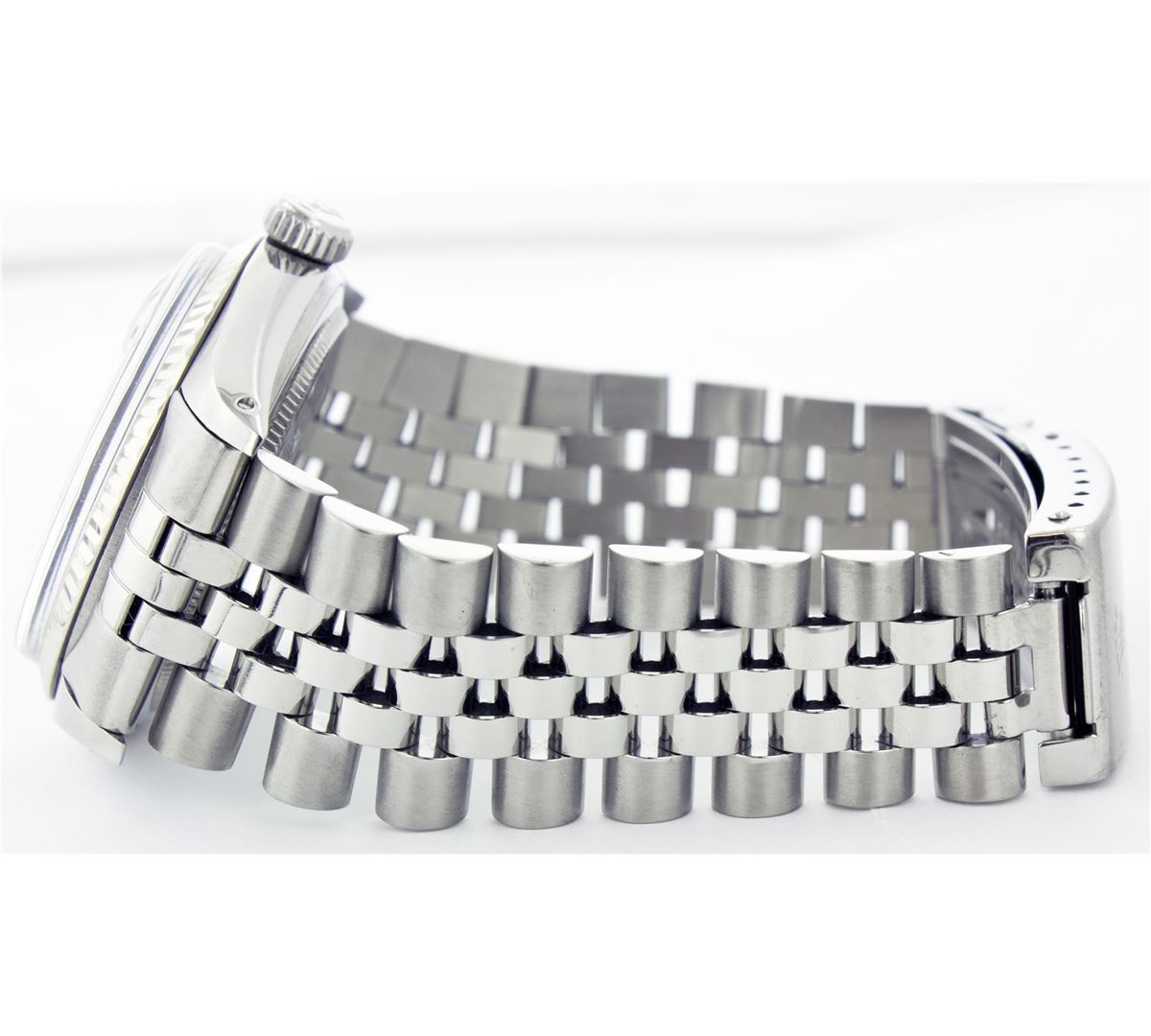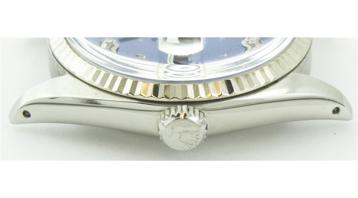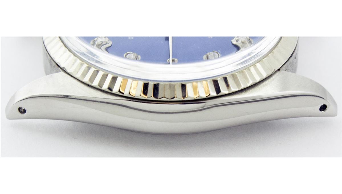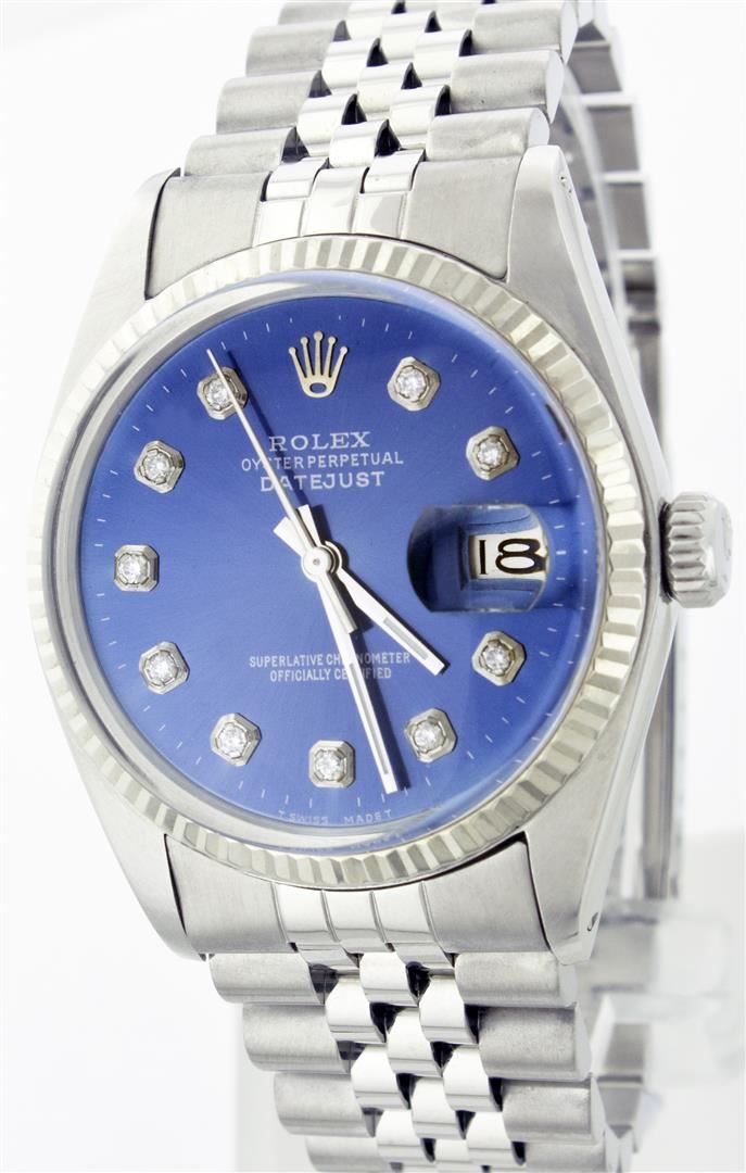 One Gents Rolex Datejust Polished, Serviced & Electronically Tested, Stainless Steel Case:36mm, Stainless Steel Crown, Bezel: 18K White Gold Fluted Bezel. Custom Crystal: Acrylic Cyclops Lens. Movement: Automatic Winding Movement Caliber 3035. Custom Dial: Blue Dial With Diamond Hour Markers, Diamond Count: 10 Diamonds, Clarity: SI-VS, Color: G To H. Date Window: 3 O'Clock Position Date Display, Quickset, Model: 16014 Condition: G-6 Extra Fine. Bracelet: Stainless Steel Jubilee. Bright Polish & Satin Finish. 6.5 Inch Length, Adjustable. Standard Clasp, With Rolex Logo.