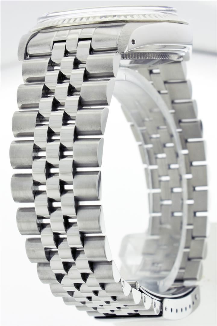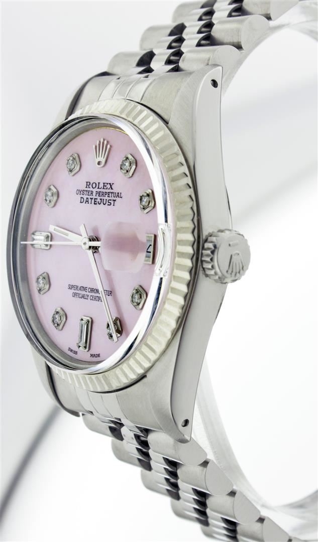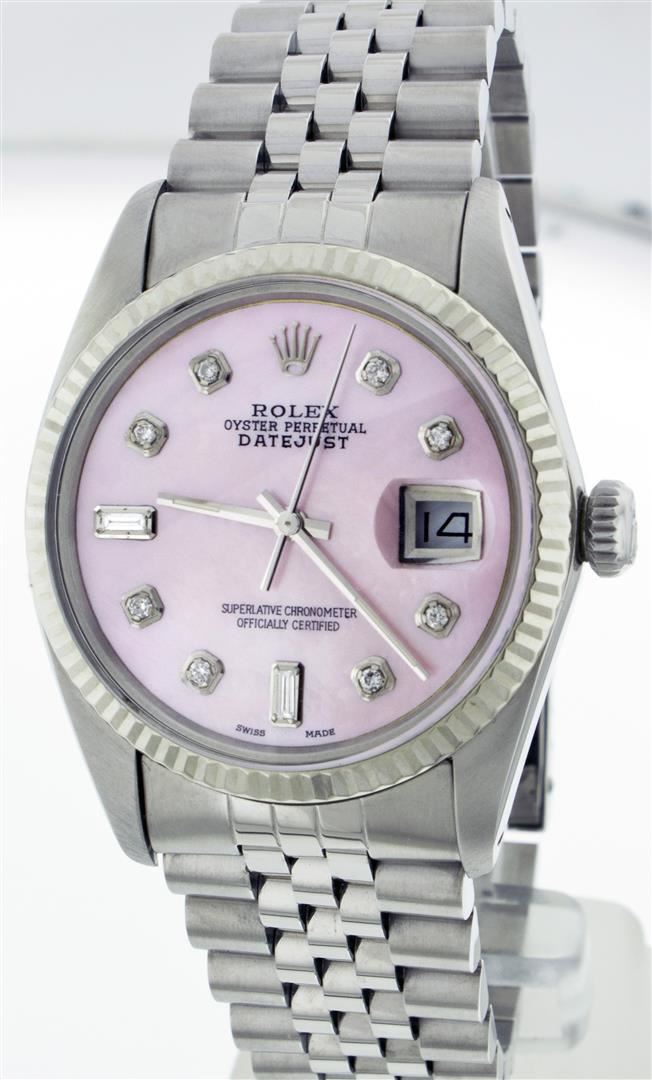 One Gents Rolex Datejust Polished, Serviced & Electronically Tested, Stainless Steel Case:36mm, Stainless Steel Crown, Bezel: 18K White Gold Fluted Bezel. Custom Crystal: Acrylic Cyclops Lens. Movement: Automatic Winding Movement Caliber 3035. Custom Dial: Pink Mother Of Pearl With Diamond Hour Markers, Diamond Count: 8 Diamonds + 2 Baguette, Clarity: SI-VS, Color: G To H. Date Window: 3 O'Clock Position Date Display, Quickset, Model: 16014 Condition: G-6 Extra Fine. Bracelet: Stainless Steel Jubilee. Bright Polish & Satin Finish. 6.5 Inch Length, Adjustable. Standard Clasp, With Rolex Logo.
