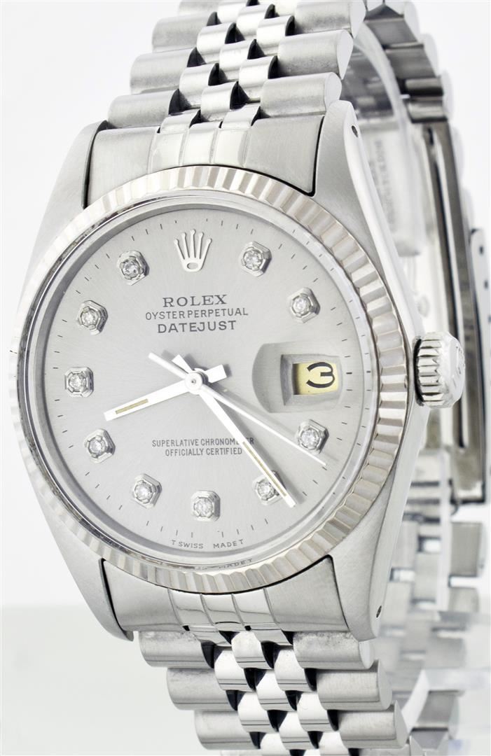 One Gents Rolex Datejust Polished, Serviced & Electronically Tested, Stainless Steel Case:36mm, Stainless Steel Crown, Bezel: 18K White Gold Fluted Bezel. Custom Crystal: Acrylic Cyclops Lens. Movement: Automatic Winding Movement Caliber 3035. Custom Dial: Grey Dial With Diamond Hour Markers, Diamond Count: 10 Diamonds, Clarity: SI-VS, Color: G To H. Date Window: 3 O'Clock Position Date Display, Quickset, Model: 16014 Condition: G-6 Extra Fine. Bracelet: Stainless Steel Jubilee. Bright Polish & Satin Finish. 6.5 Inch Length, Adjustable. Standard Clasp, With Rolex Logo.