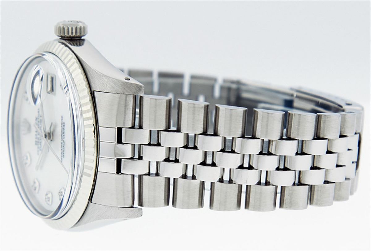 One Gents Rolex Datejust Polished, Serviced & Electronically Tested, Stainless Steel Case:36mm, Stainless Steel Crown, Custom Bezel: 18K White Gold Fluted Bezel. Custom Crystal: Acrylic Cyclops Lens. Movement: Automatic Winding Movement Caliber 3035. Custom Dial: Mother Of Pearl With Diamond Hour Markers, Diamond Count: 10 Diamonds In Dial, Clarity: SI-VS, Color: G to H. Date Window: 3 O'Clock Position Date Display, Quickset, Model: 16014 Condition: G-6 Extra Fine. Bracelet: Stainless Steel Jubilee. Bright Polish & Satin Finish. 6.5 Inch Length, Adjustable. Standard Clasp, With Rolex Logo.