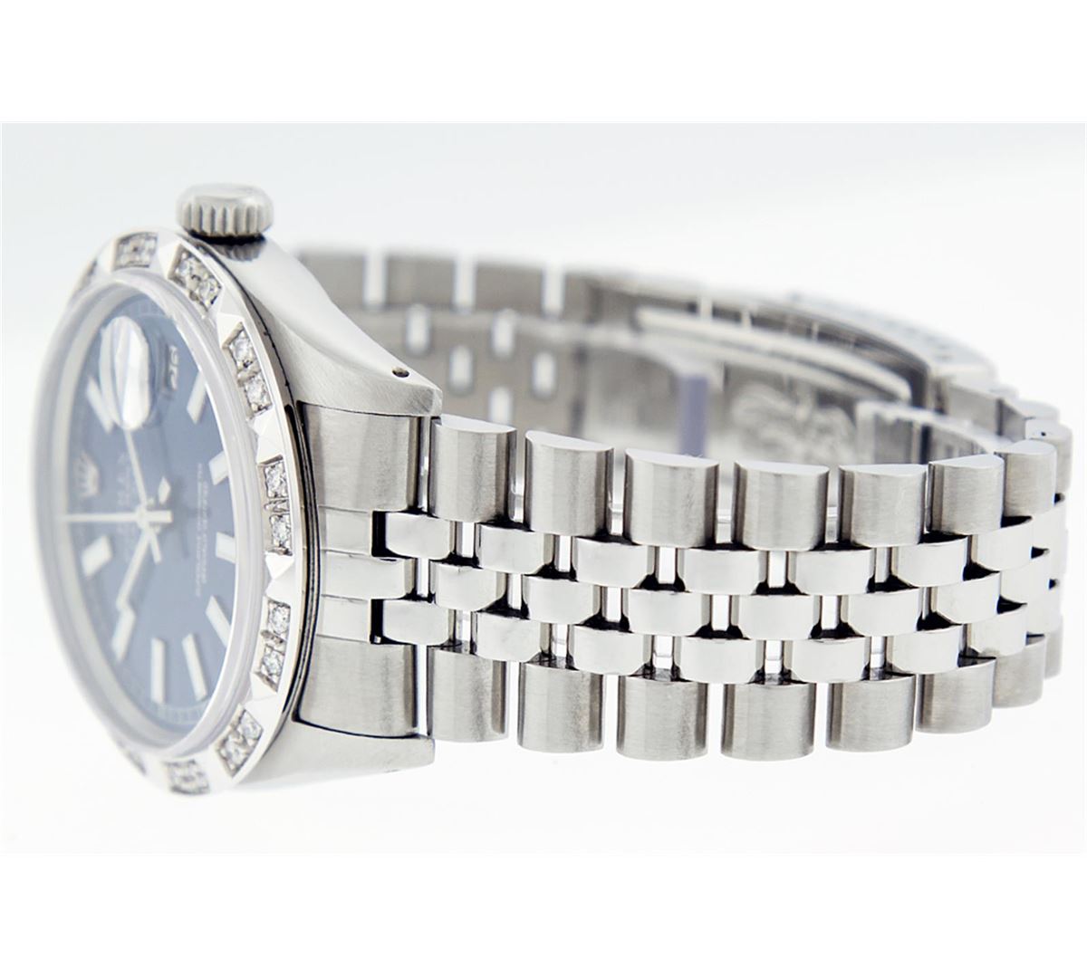 One Mens Rolex Datejust Polished Bright with Satin Finish, Serviced & Electronically Tested, Stainless Steel Case:36mm, Stainless Steel Crown, Custom Bezel: 18K White Gold Pyramid Diamond Bezel, Diamond Count: 24 Diamonds Total Weight .70 Carat, Clarity: SI-VS, Color: G to H. Crystal: Synthetic Sapphire Cyclops Lens. Movement: Automatic Winding Movement Caliber 3135. Custom Dial: Blue Index Dial. Date Window: 3 O'Clock Position Date Display, Quickset, Model: 16234 Condition: G-6 Extra Fine. Bracelet: Stainless Steel Jubilee. Bright Polish & Satin Finish. 6.5 Inch Length, Adjustable. Standard Clasp, With Rolex Logo.