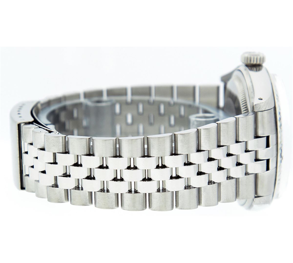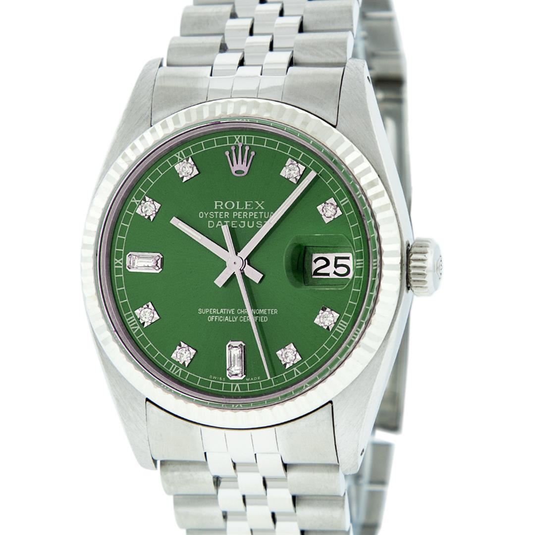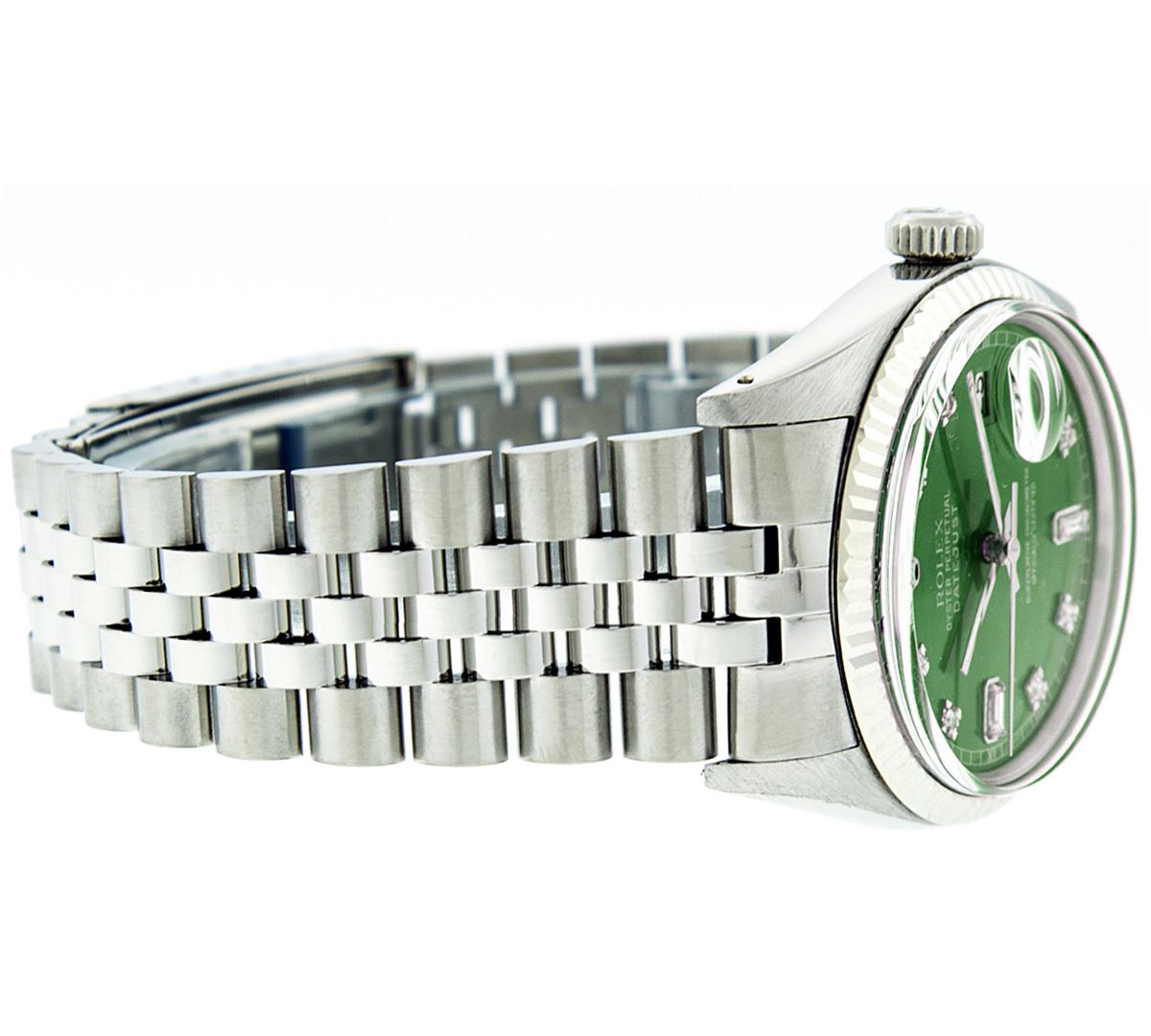 One Gents Rolex Datejust Polished, Serviced & Electronically Tested, Stainless Steel Case:36mm, Stainless Steel Crown, Bezel: 18K White Gold Fluted Bezel. Custom Crystal: Acrylic Cyclops Lens. Movement: Automatic Winding Movement Caliber 3035. Custom Dial: Green With Diamond Hour Markers And Square Roman Track Square Setting, Diamond Count: 8 Diamonds + 2 Baguettes, Clarity: SI-VS, Color: G to H. Date Window: 3 O'Clock Position Date Display, Quickset, Model: Datejust Condition: G-6 Extra Fine. Bracelet: Stainless Steel Jubilee. Bright Polish & Satin Finish. 7.0 Inch Length, Adjustable. Standard Clasp, With Rolex Logo. Comes with 6 month warranty.