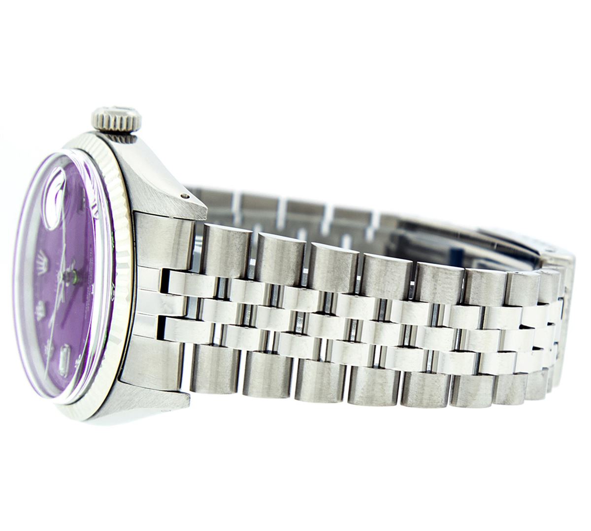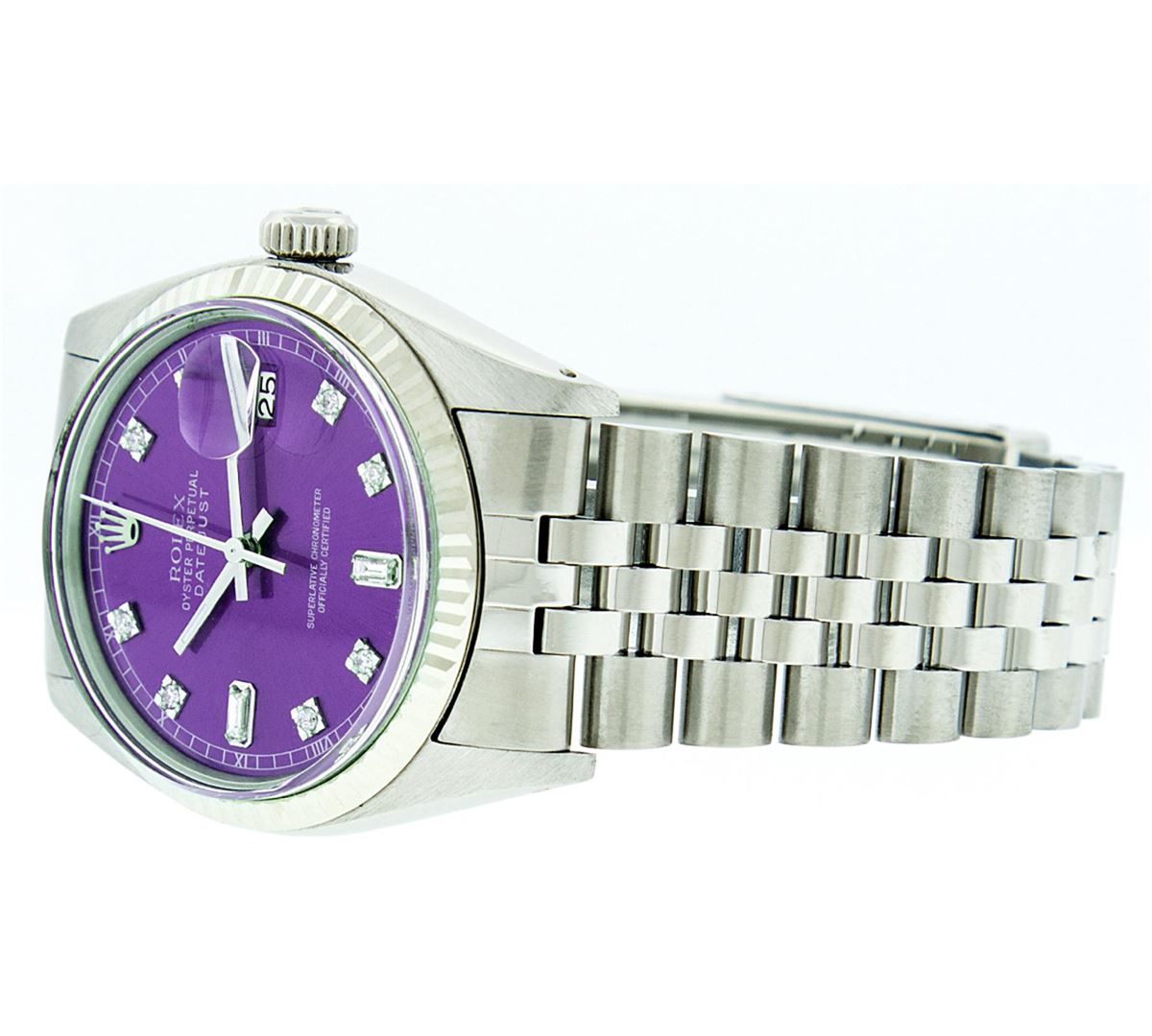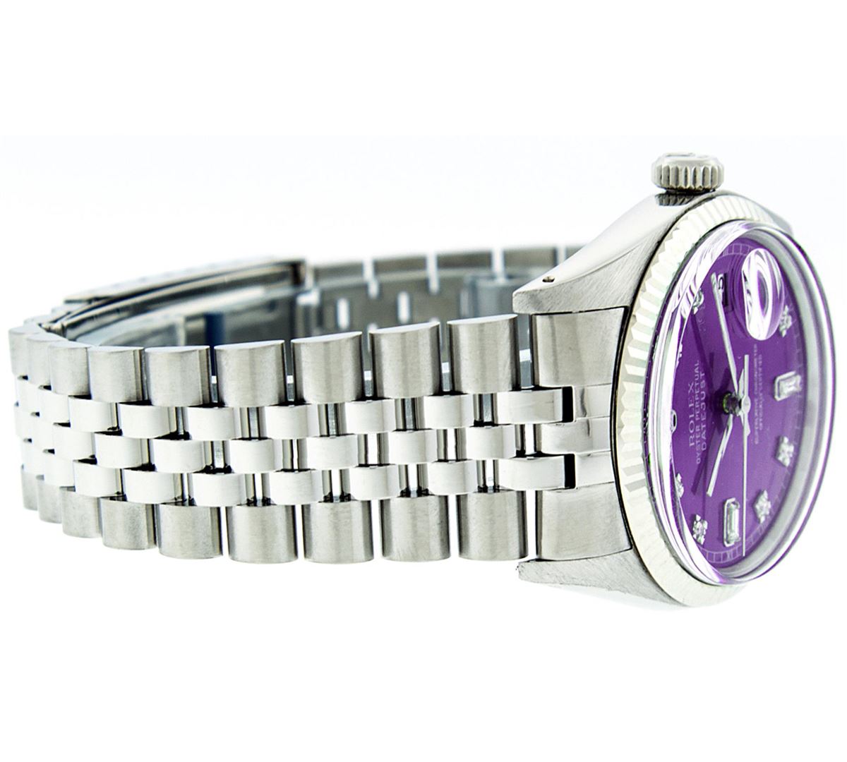 One Gents Rolex Datejust Polished, Serviced & Electronically Tested, Stainless Steel Case:36mm, Stainless Steel Crown, Bezel: 18K White Gold Fluted Bezel. Custom Crystal: Acrylic Cyclops Lens. Movement: Automatic Winding Movement Caliber 3035. Custom Dial: Purple With Diamond Hour Markers And Square Roman Track Square Setting, Diamond Count: 8 Diamonds + 2 Baguettes, Clarity: SI-VS, Color: G to H. Date Window: 3 O'Clock Position Date Display, Quickset, Model: Datejust Condition: G-6 Extra Fine. Bracelet: Stainless Steel Jubilee. Bright Polish & Satin Finish. 7.0 Inch Length, Adjustable. Standard Clasp, With Rolex Logo. Comes with 6 month warranty.
