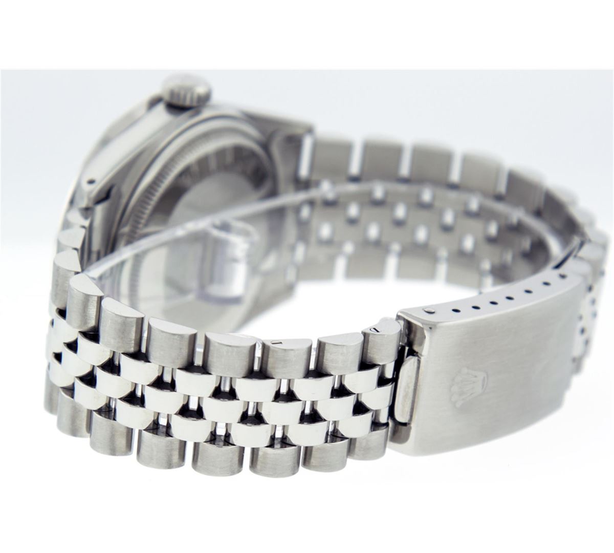 One Mens Rolex Datejust Polished Bright with Satin Finish, Serviced & Electronically Tested, Stainless Steel Case:36mm, Stainless Steel Crown, Custom Bezel: 18K White Gold Pyramid Diamond Bezel, Diamond Count: 24 Diamonds Total Weight .70 Carat, Clarity: SI-VS, Color: G to H. Crystal: Synthetic Sapphire Cyclops Lens. Movement: Automatic Winding Movement Caliber 3135. Custom Dial: Blue Index Dial. Date Window: 3 O'Clock Position Date Display, Quickset, Model: 16234 Condition: G-6 Extra Fine. Bracelet: Stainless Steel Jubilee. Bright Polish & Satin Finish. 6.5 Inch Length, Adjustable. Standard Clasp, With Rolex Logo.