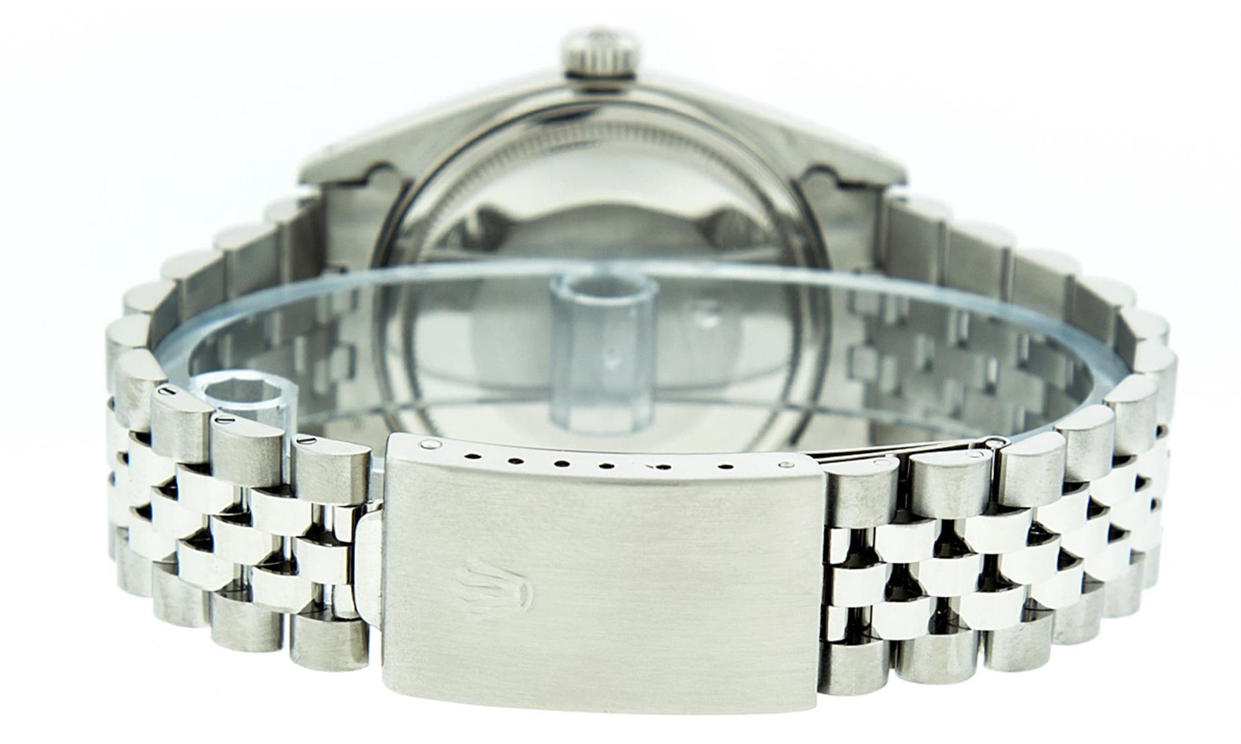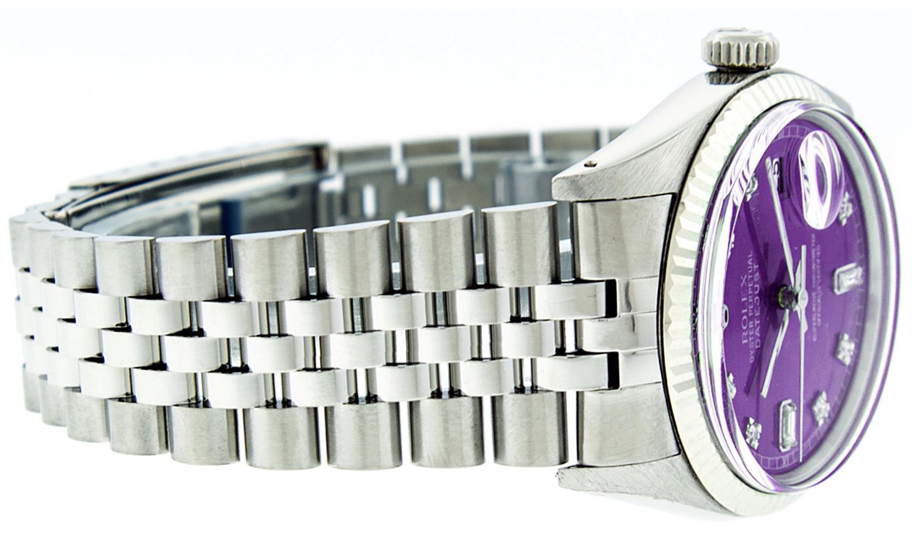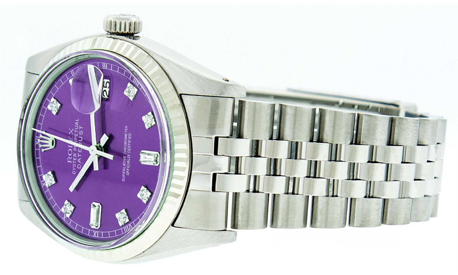 One Gents Rolex Datejust Polished, Serviced & Electronically Tested, Stainless Steel Case:36mm, Stainless Steel Crown, Bezel: 18K White Gold Fluted Bezel. Custom Crystal: Acrylic Cyclops Lens. Movement: Automatic Winding Movement Caliber 3035. Custom Dial: Purple With Diamond Hour Markers And Square Roman Track Square Setting, Diamond Count: 8 Diamonds + 2 Baguettes, Clarity: SI-VS, Color: G to H. Date Window: 3 O'Clock Position Date Display, Quickset, Model: Datejust Condition: G-6 Extra Fine. Bracelet: Stainless Steel Jubilee. Bright Polish & Satin Finish. 7.0 Inch Length, Adjustable. Standard Clasp, With Rolex Logo. Comes with 6 month warranty.
