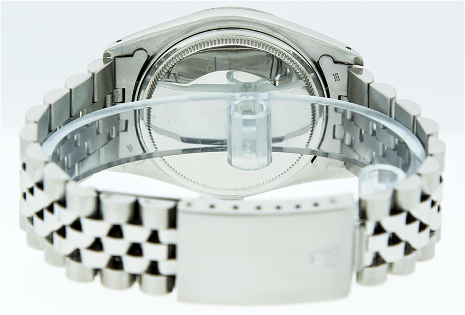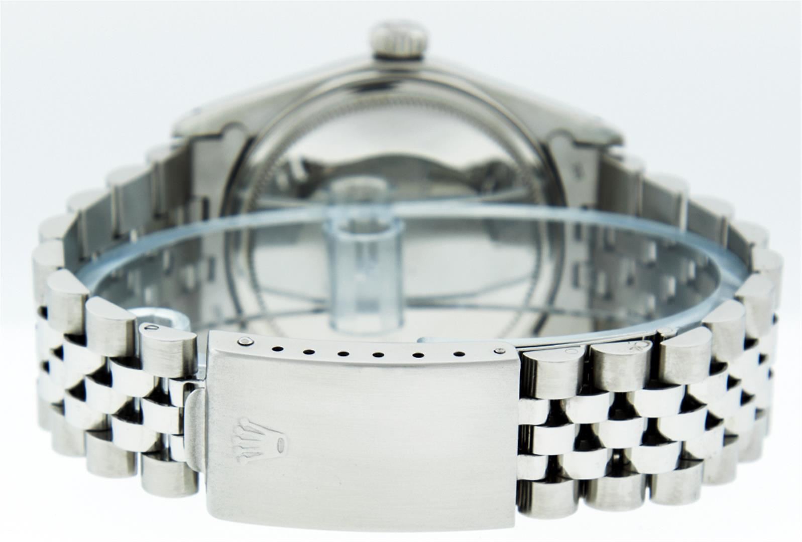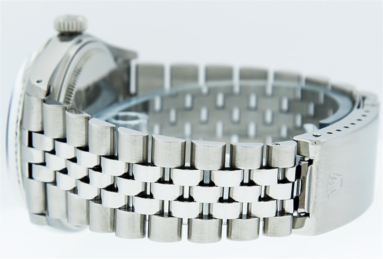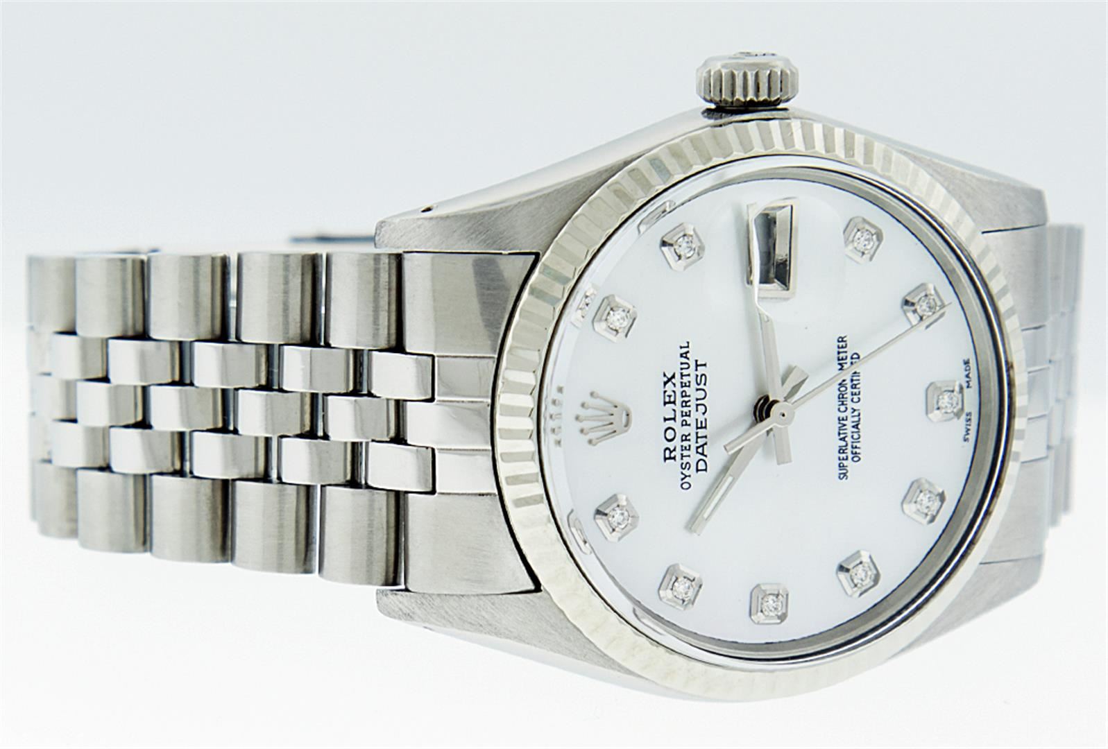 One Gents Rolex Datejust Polished, Serviced & Electronically Tested, Stainless Steel Case:36mm, Stainless Steel Crown, Custom Bezel: 18K White Gold Fluted Bezel. Custom Crystal: Acrylic Cyclops Lens. Movement: Automatic Winding Movement Caliber 3035. Custom Dial: Mother Of Pearl With Diamond Hour Markers, Diamond Count: 10 Diamonds In Dial, Clarity: SI-VS, Color: G to H. Date Window: 3 O'Clock Position Date Display, Quickset, Model: 16014 Condition: G-6 Extra Fine. Bracelet: Stainless Steel Jubilee. Bright Polish & Satin Finish. 6.5 Inch Length, Adjustable. Standard Clasp, With Rolex Logo.