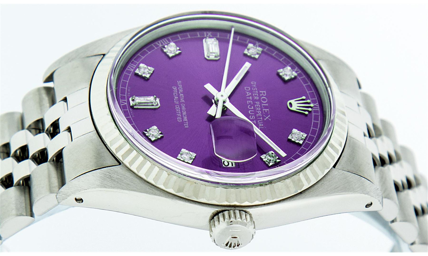 One Gents Rolex Datejust Polished, Serviced & Electronically Tested, Stainless Steel Case:36mm, Stainless Steel Crown, Bezel: 18K White Gold Fluted Bezel. Custom Crystal: Acrylic Cyclops Lens. Movement: Automatic Winding Movement Caliber 3035. Custom Dial: Purple With Diamond Hour Markers And Square Roman Track Square Setting, Diamond Count: 8 Diamonds + 2 Baguettes, Clarity: SI-VS, Color: G to H. Date Window: 3 O'Clock Position Date Display, Quickset, Model: Datejust Condition: G-6 Extra Fine. Bracelet: Stainless Steel Jubilee. Bright Polish & Satin Finish. 7.0 Inch Length, Adjustable. Standard Clasp, With Rolex Logo. Comes with 6 month warranty.