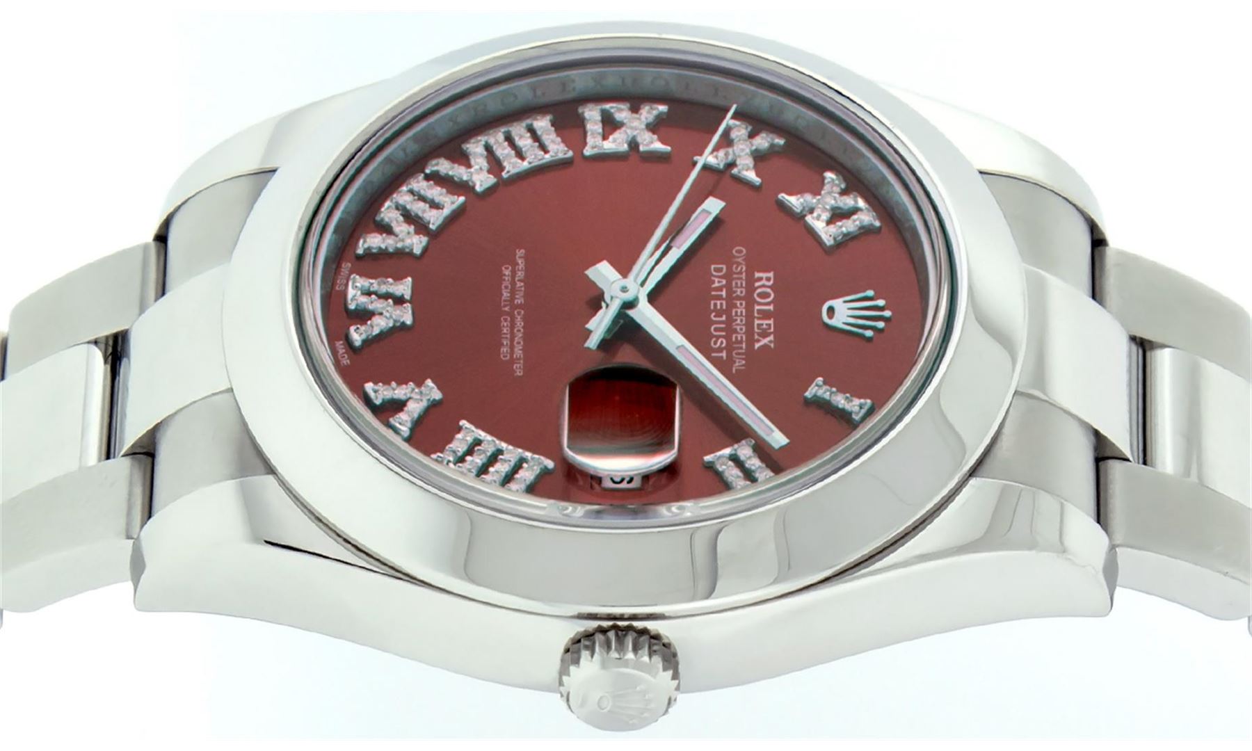 One Mens Rolex Datejust 2 Polished Bright with Shiny Finish, Serviced & Electronically Tested, Stainless Steel Case:41mm, Stainless Steel Crown, Bezel: Stainless Steel Smooth Bezel, . Crystal: Synthetic Sapphire Cyclops Lens. Movement: Automatic Winding Movement Caliber 3136. Custom Dial: Red Roman Diamond Dial, Diamond Color: G To H, Clarity: SI-VS. Date Window: 3 O'Clock Position Date Display, Quickset, Model: 116300 Datejust 2. Condition: G-6 Extra Fine The Watch Is In Very Good Condition Free Of All Scratches And Dents. Bracelet: Stainless Steel Oyster Band. Bright Polish & Satin Finish. 7.5 Inch Length, Adjustable. Standard Clasp, With Rolex Logo. Comes with 6 month warranty.