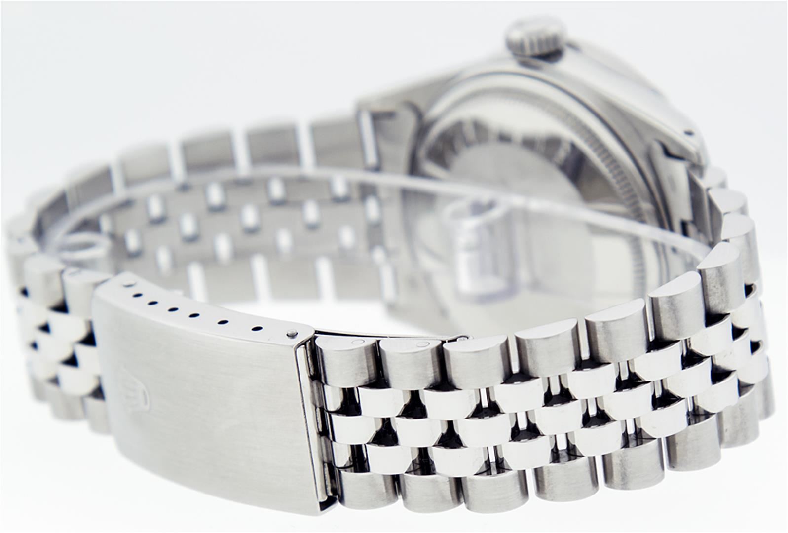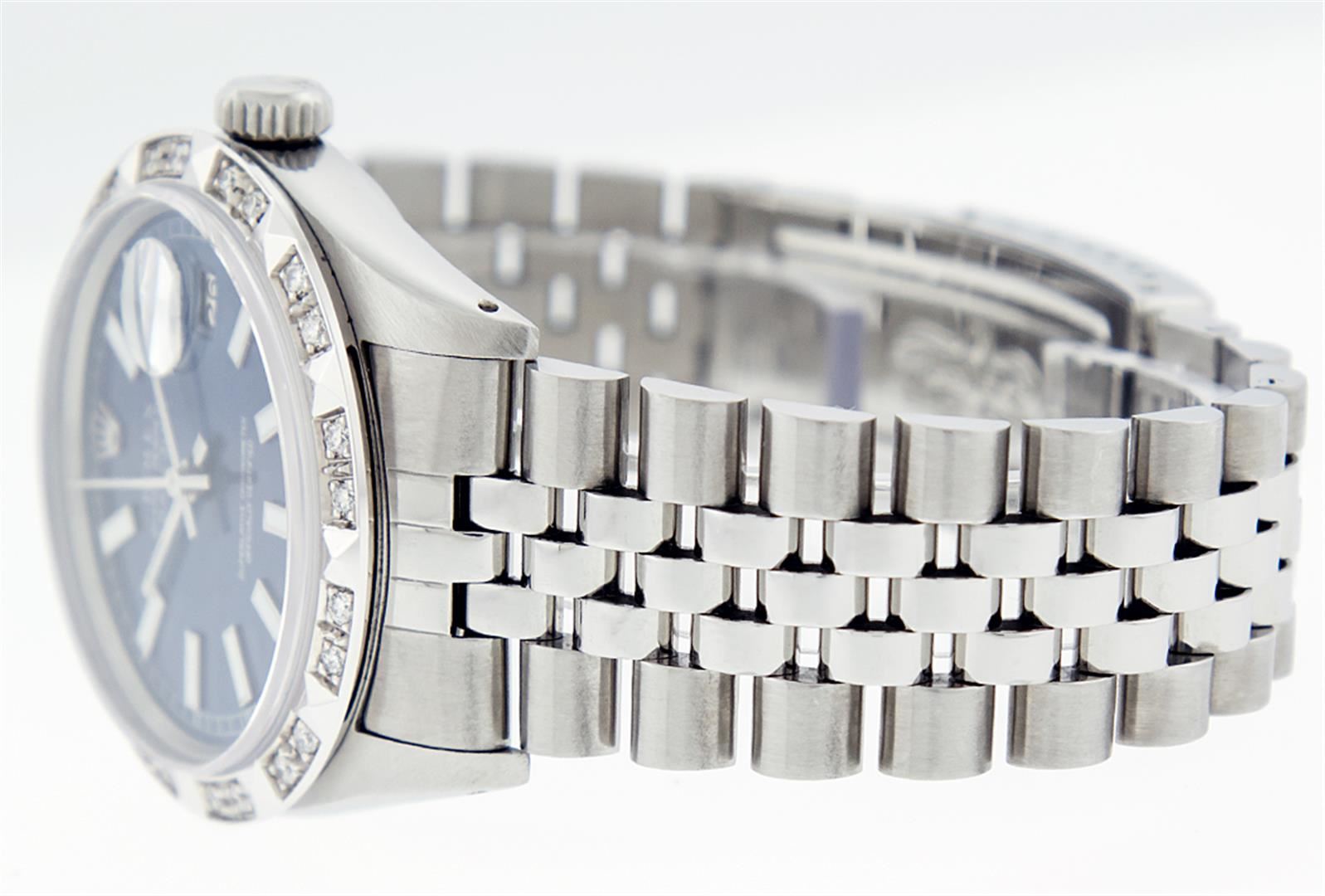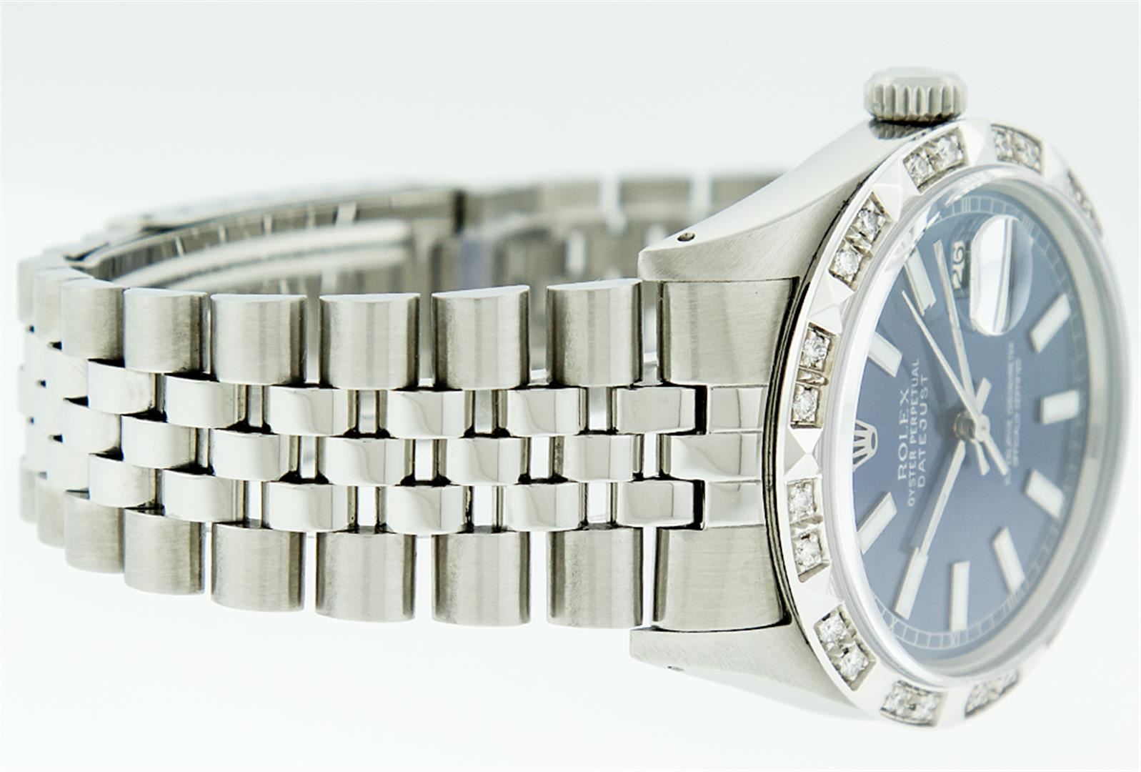One Mens Rolex Datejust Polished Bright with Satin Finish, Serviced & Electronically Tested, Stainless Steel Case:36mm, Stainless Steel Crown, Custom Bezel: 18K White Gold Pyramid Diamond Bezel, Diamond Count: 24 Diamonds Total Weight .70 Carat, Clarity: SI-VS, Color: G to H. Crystal: Synthetic Sapphire Cyclops Lens. Movement: Automatic Winding Movement Caliber 3135. Custom Dial: Blue Index Dial. Date Window: 3 O'Clock Position Date Display, Quickset, Model: 16234 Condition: G-6 Extra Fine. Bracelet: Stainless Steel Jubilee. Bright Polish & Satin Finish. 6.5 Inch Length, Adjustable. Standard Clasp, With Rolex Logo.