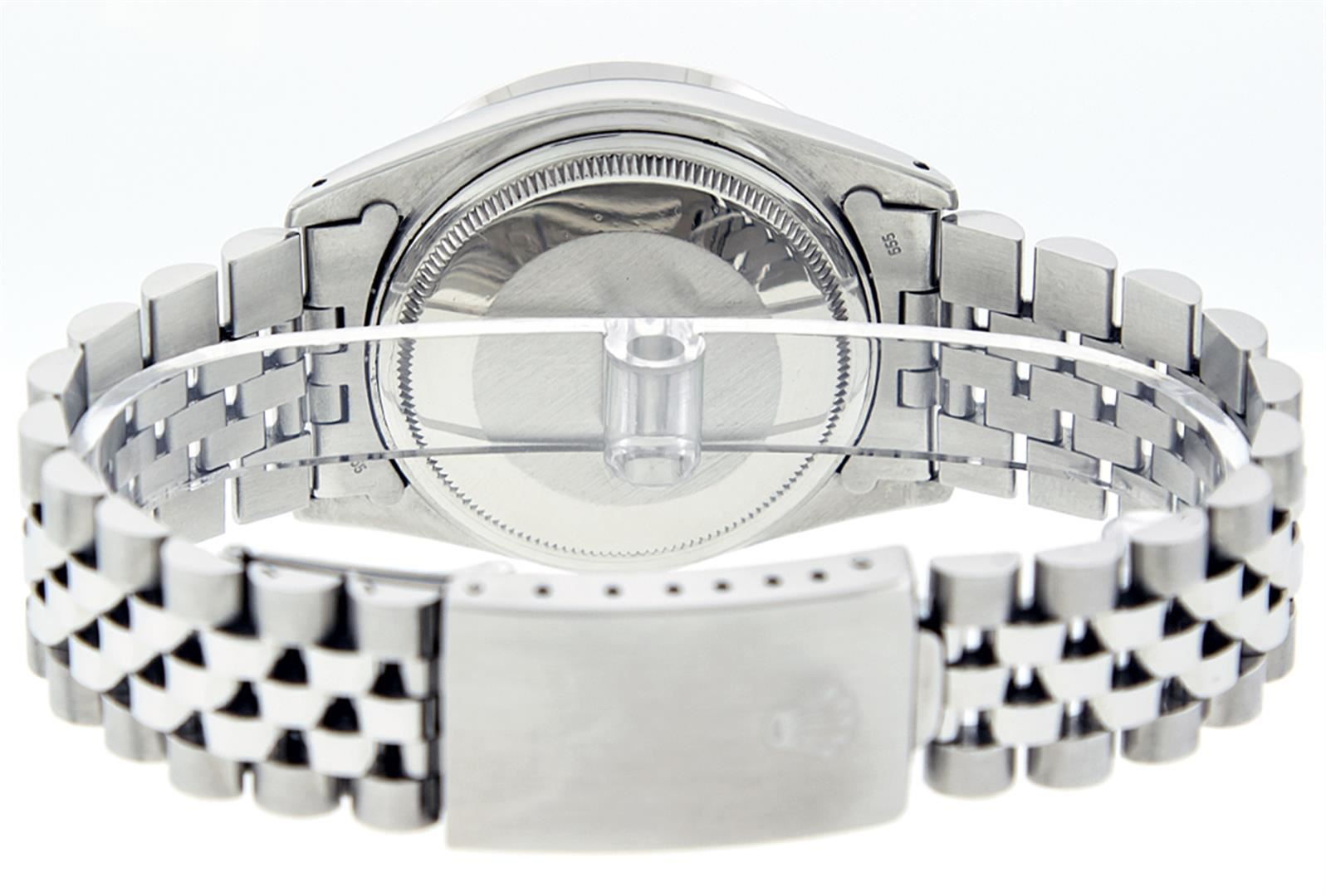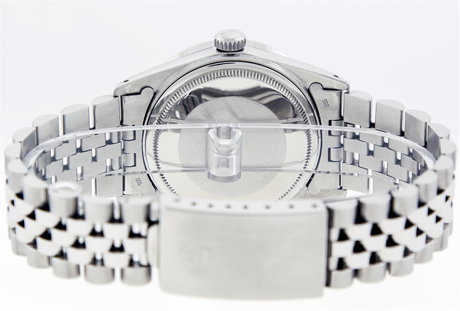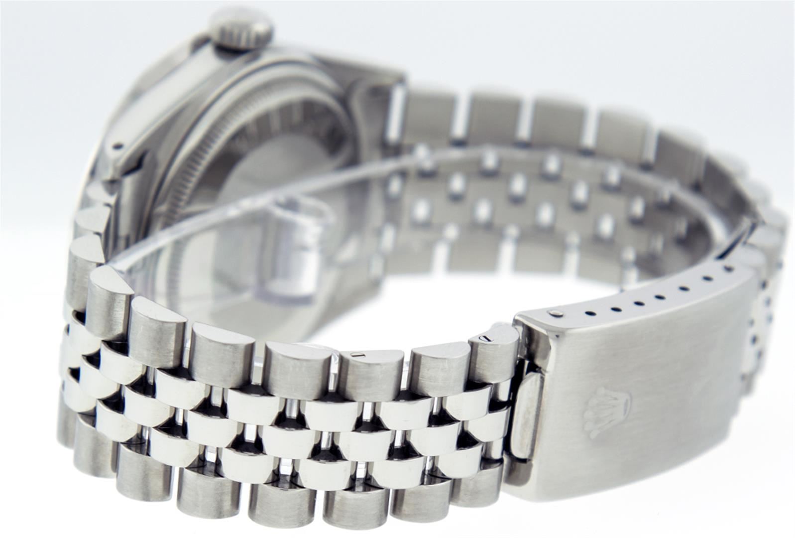 One Mens Rolex Datejust Polished Bright with Satin Finish, Serviced & Electronically Tested, Stainless Steel Case:36mm, Stainless Steel Crown, Custom Bezel: 18K White Gold Pyramid Diamond Bezel, Diamond Count: 24 Diamonds Total Weight .70 Carat, Clarity: SI-VS, Color: G to H. Crystal: Synthetic Sapphire Cyclops Lens. Movement: Automatic Winding Movement Caliber 3135. Custom Dial: Blue Index Dial. Date Window: 3 O'Clock Position Date Display, Quickset, Model: 16234 Condition: G-6 Extra Fine. Bracelet: Stainless Steel Jubilee. Bright Polish & Satin Finish. 6.5 Inch Length, Adjustable. Standard Clasp, With Rolex Logo.