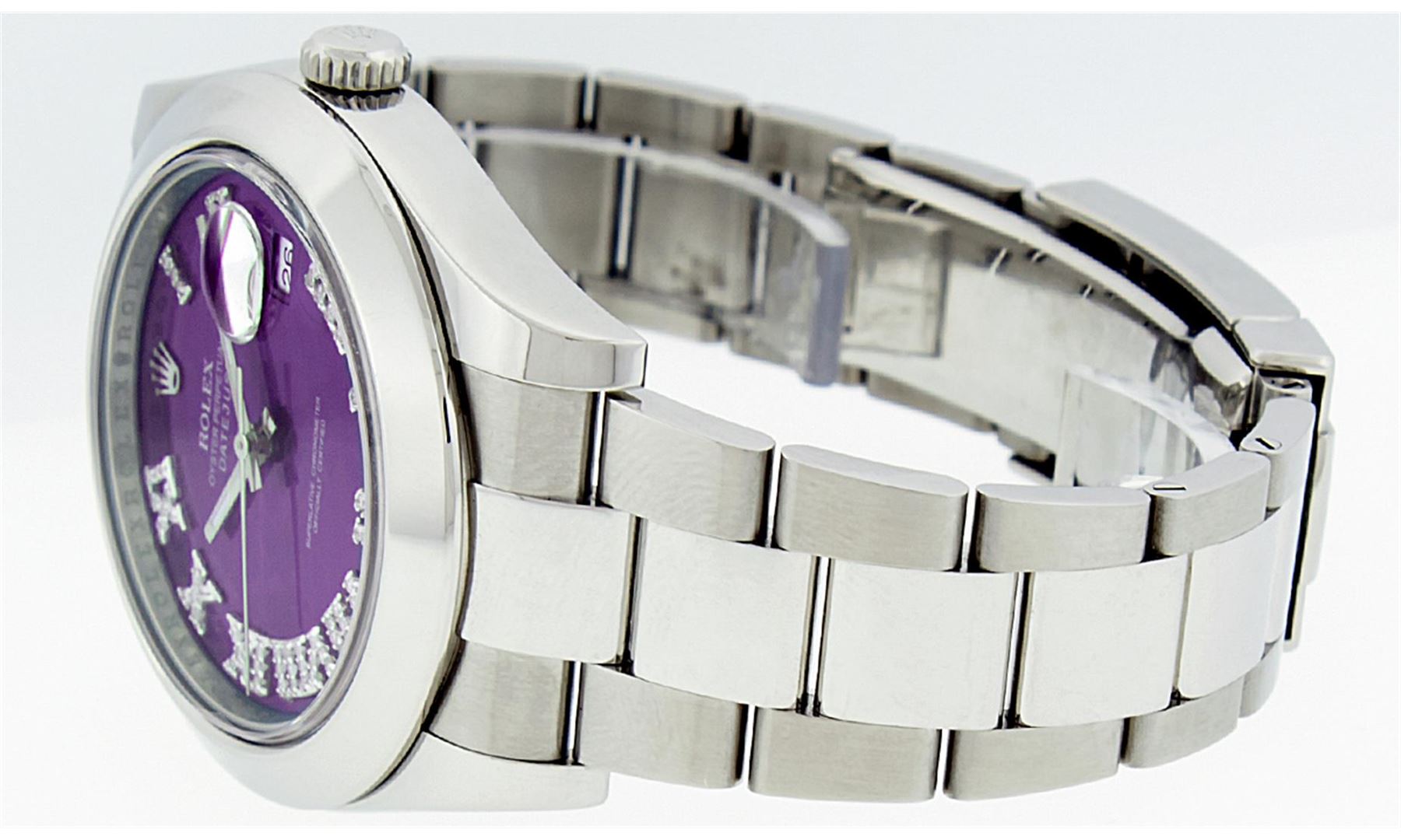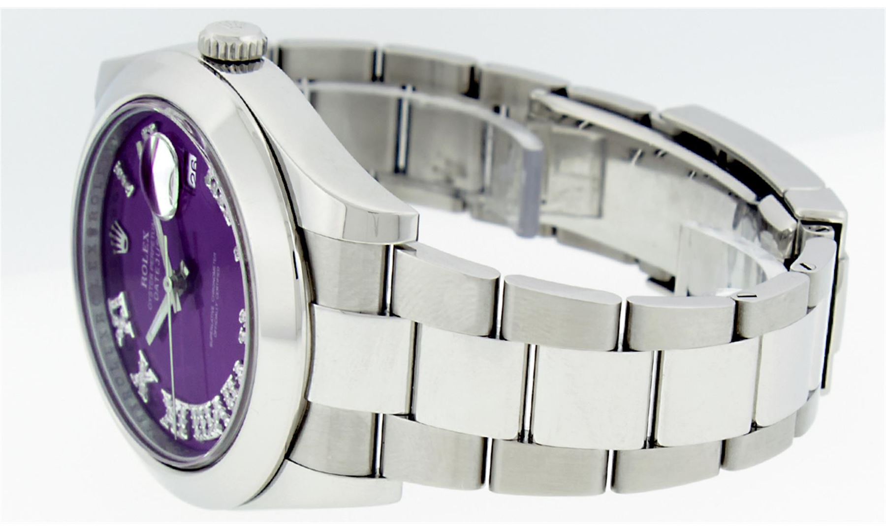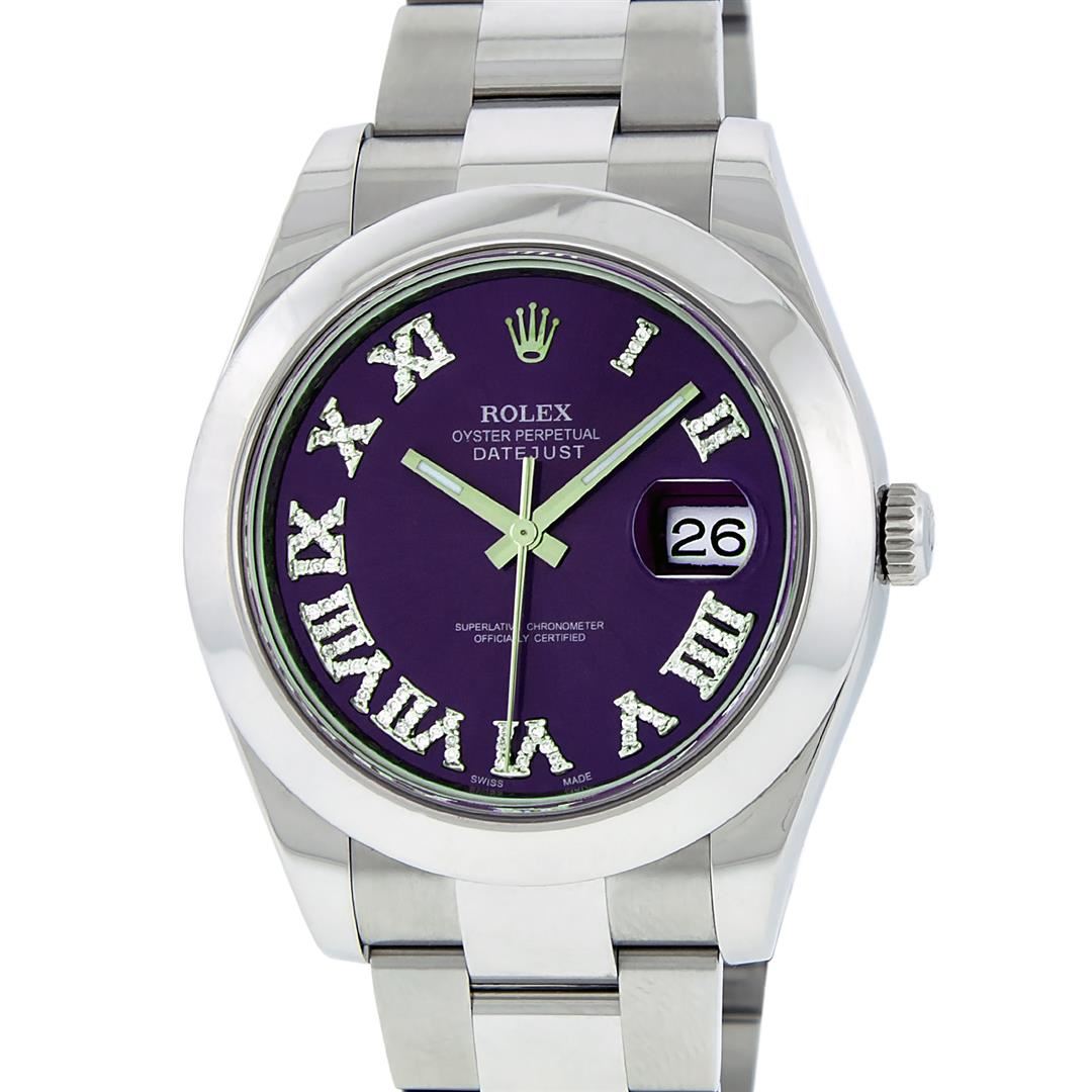 One Mens Rolex Datejust 2 Polished Bright with Shiny Finish, Serviced & Electronically Tested, Stainless Steel Case:41mm, Stainless Steel Crown, Bezel: Stainless Steel Smooth Bezel, . Crystal: Synthetic Sapphire Cyclops Lens. Movement: Automatic Winding Movement Caliber 3136. Custom Dial: Purple Roman Diamond Dial, Diamond Color: G To H, Clarity: SI-VS. Date Window: 3 O'Clock Position Date Display, Quickset, Model: 116300 Datejust 2. Condition: G-6 Extra Fine The Watch Is In Very Good Condition Free Of All Scratches And Dents. Bracelet: Stainless Steel Oyster Band. Bright Polish & Satin Finish. 7.5 Inch Length, Adjustable. Standard Clasp, With Rolex Logo. Comes with 6 month warranty.