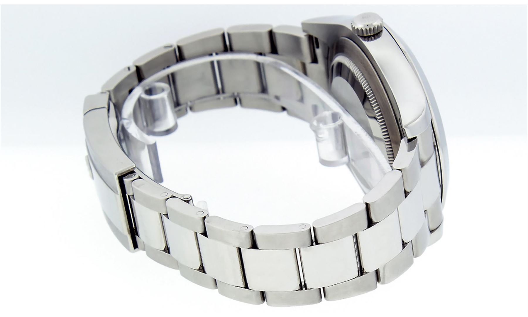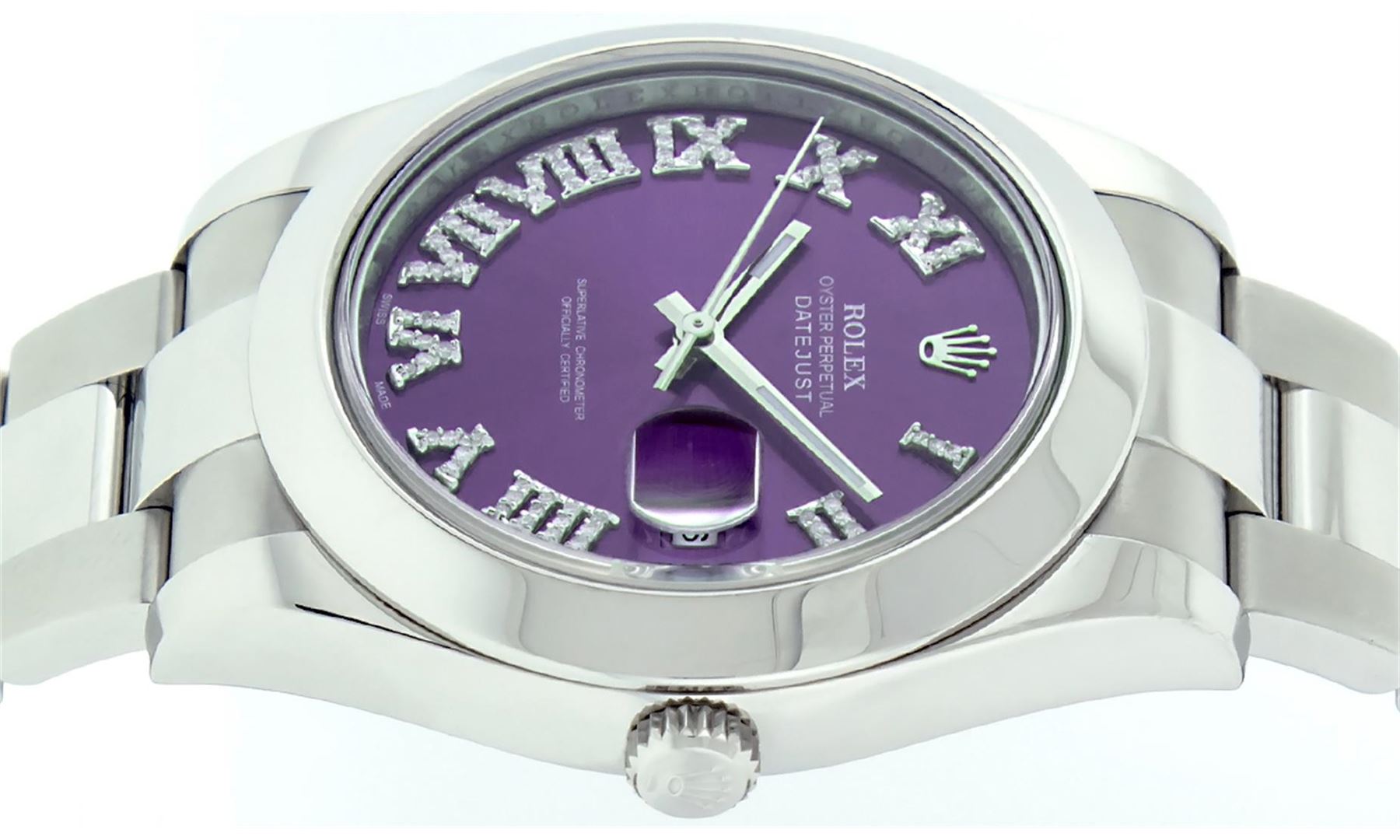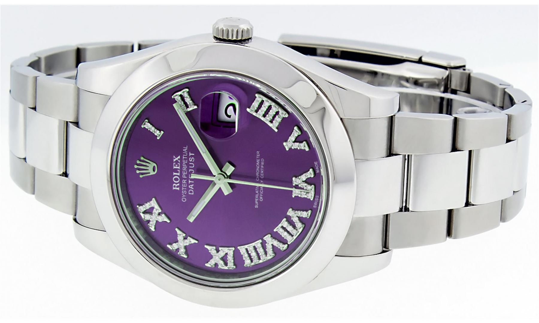 One Mens Rolex Datejust 2 Polished Bright with Shiny Finish, Serviced & Electronically Tested, Stainless Steel Case:41mm, Stainless Steel Crown, Bezel: Stainless Steel Smooth Bezel, . Crystal: Synthetic Sapphire Cyclops Lens. Movement: Automatic Winding Movement Caliber 3136. Custom Dial: Purple Roman Diamond Dial, Diamond Color: G To H, Clarity: SI-VS. Date Window: 3 O'Clock Position Date Display, Quickset, Model: 116300 Datejust 2. Condition: G-6 Extra Fine The Watch Is In Very Good Condition Free Of All Scratches And Dents. Bracelet: Stainless Steel Oyster Band. Bright Polish & Satin Finish. 7.5 Inch Length, Adjustable. Standard Clasp, With Rolex Logo. Comes with 6 month warranty.