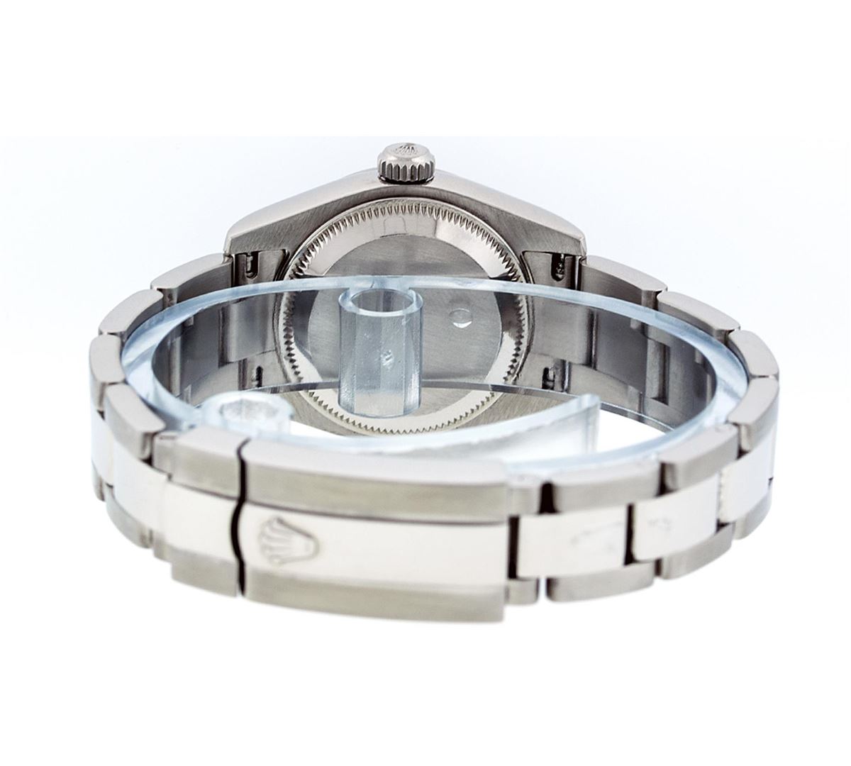 One Ladies Rolex Datejust Polished Bright with Satin Finish, Serviced & Electronically Tested, Stainless Steel Case:26mm, Stainless Steel Crown, Bezel: Stainless Steel Smooth Bezel. Custom Crystal: Synthetic Sapphire Cyclops Lens. Movement: Automatic Winding Movement Caliber 2235. Custom Dial: Refinished Red Vignette Diamond VVS, Diamond Count: 10 Diamonds in Dial G To H In Color, Clarity: VVS. Date Window: 3 O'Clock Position Date Display, Model: Quickset No Hole Datejust 179160. Condition: G-6 Extra Fine. Bracelet: Stainless Steel Oyster. Bright Polish & Satin Finish. 6.0 Inch Length, Adjustable. Standard Clasp, With Rolex Logo.