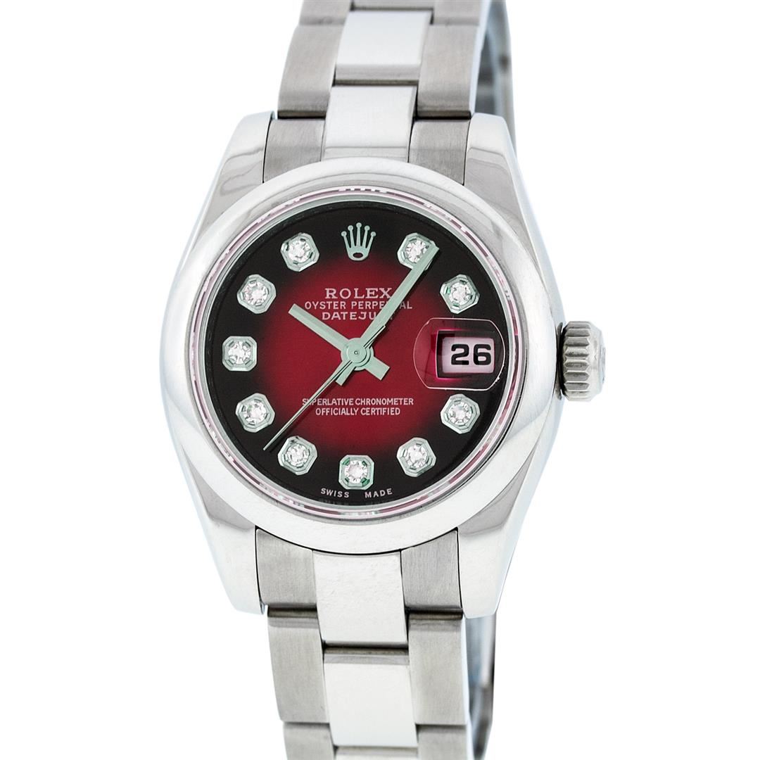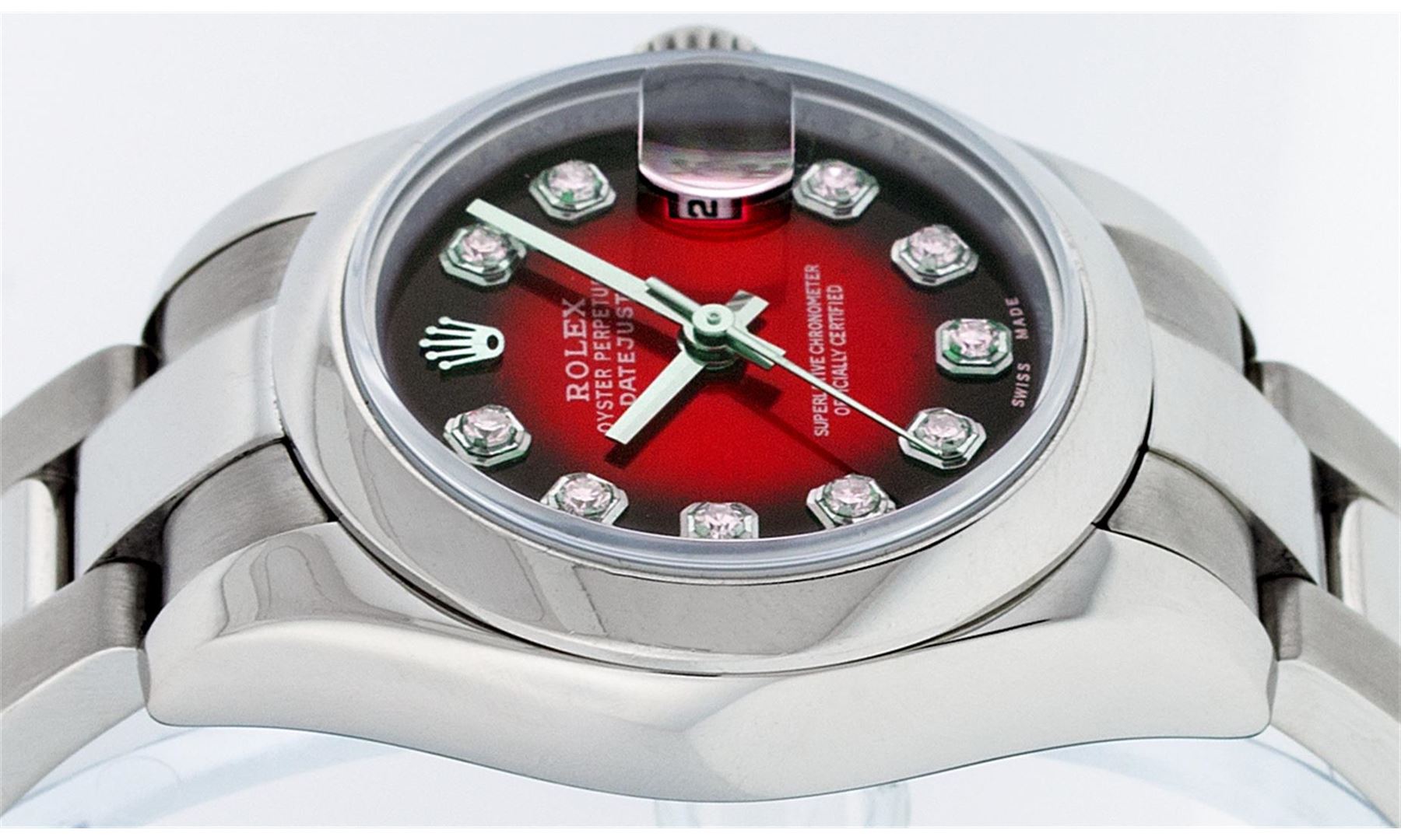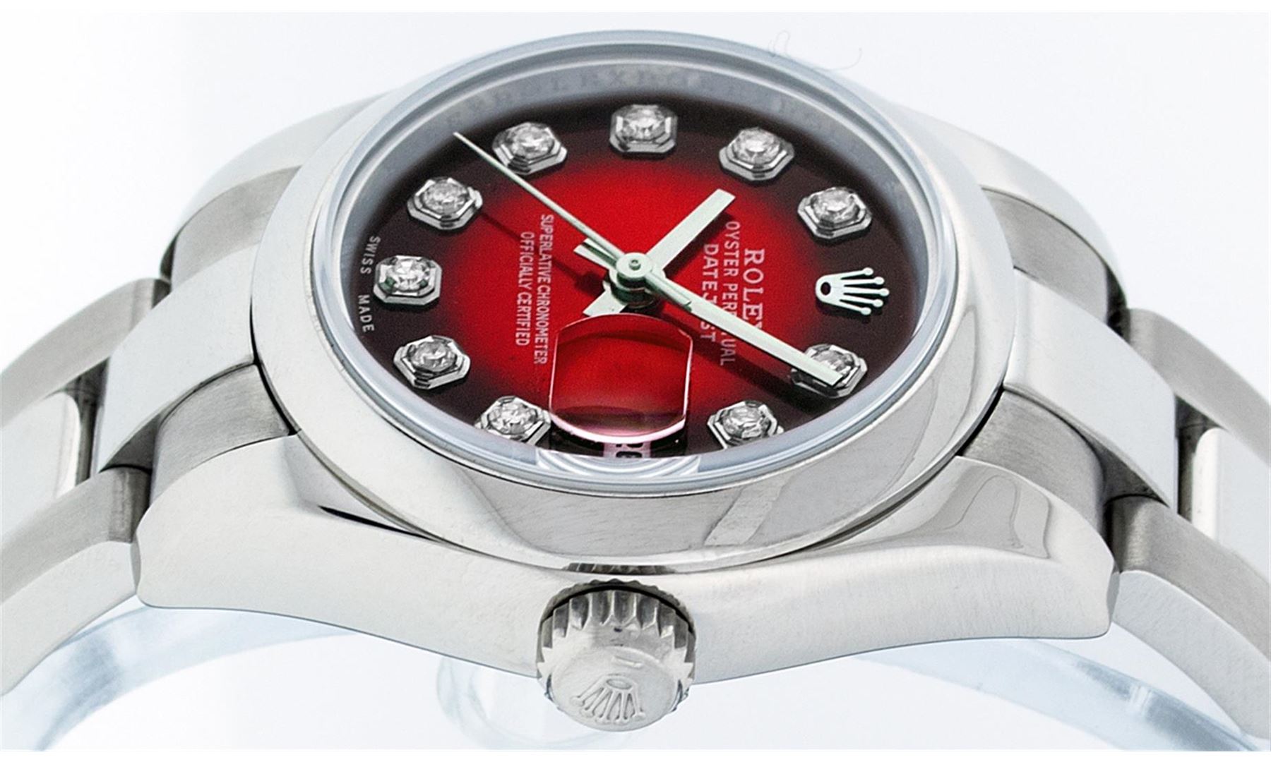 One Ladies Rolex Datejust Polished Bright with Satin Finish, Serviced & Electronically Tested, Stainless Steel Case:26mm, Stainless Steel Crown, Bezel: Stainless Steel Smooth Bezel. Custom Crystal: Synthetic Sapphire Cyclops Lens. Movement: Automatic Winding Movement Caliber 2235. Custom Dial: Refinished Red Vignette Diamond VVS, Diamond Count: 10 Diamonds in Dial G To H In Color, Clarity: VVS. Date Window: 3 O'Clock Position Date Display, Model: Quickset No Hole Datejust 179160. Condition: G-6 Extra Fine. Bracelet: Stainless Steel Oyster. Bright Polish & Satin Finish. 6.0 Inch Length, Adjustable. Standard Clasp, With Rolex Logo.