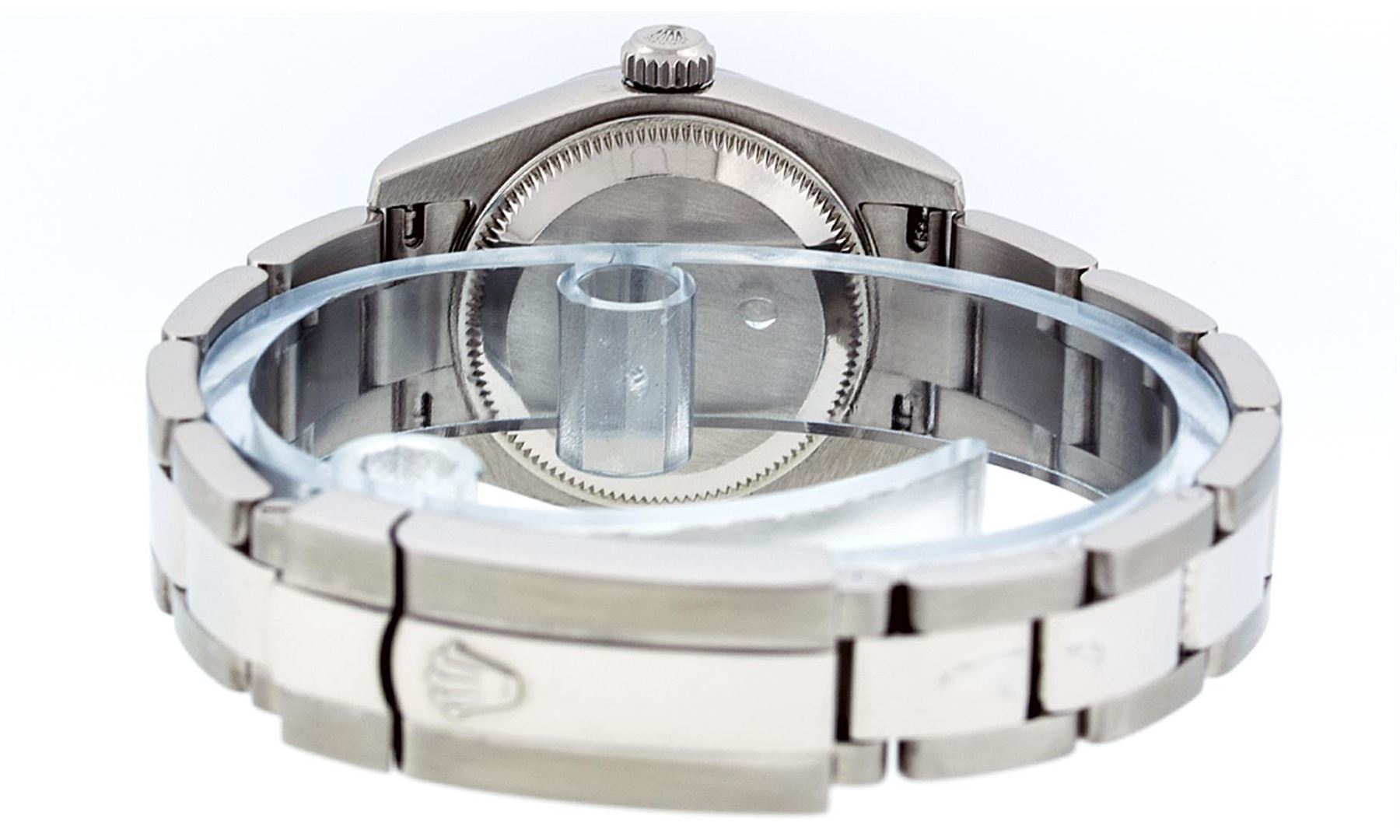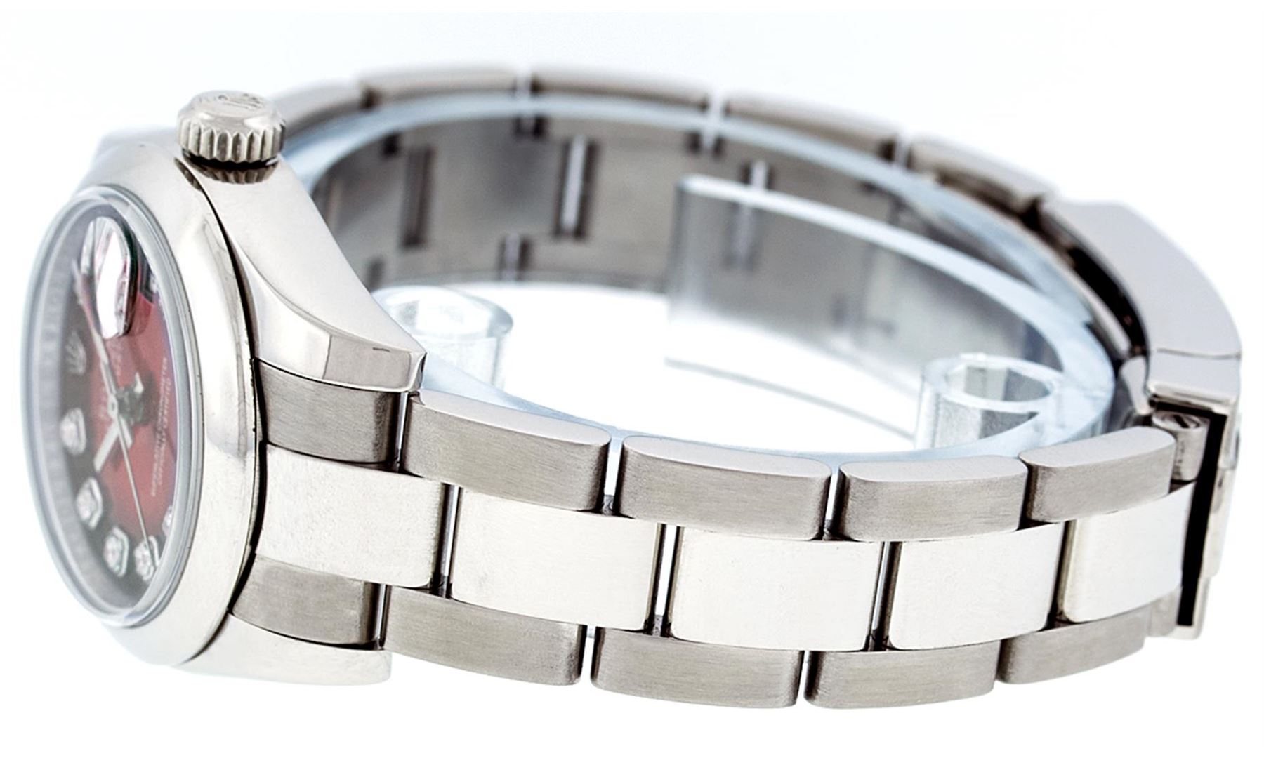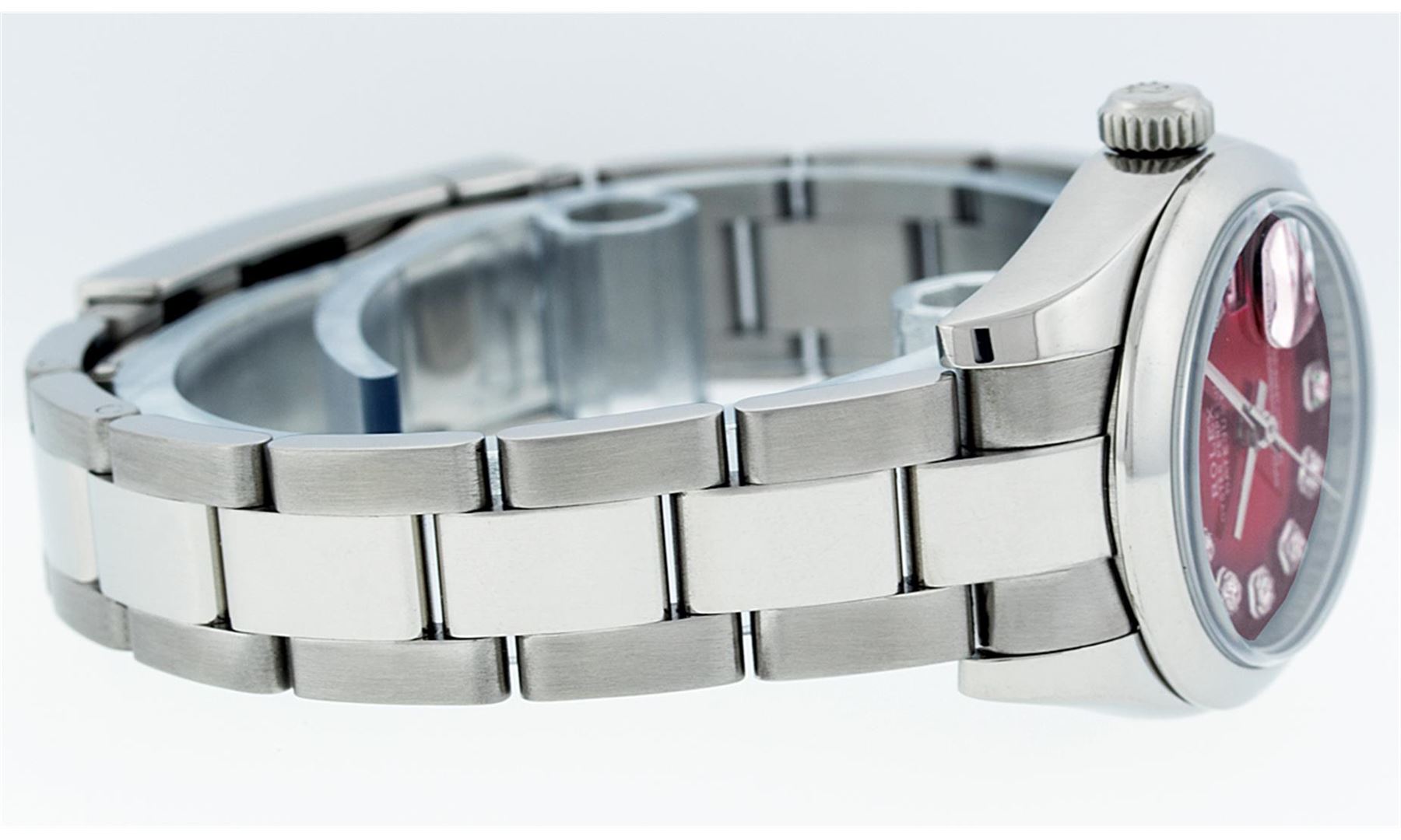 One Ladies Rolex Datejust Polished Bright with Satin Finish, Serviced & Electronically Tested, Stainless Steel Case:26mm, Stainless Steel Crown, Bezel: Stainless Steel Smooth Bezel. Custom Crystal: Synthetic Sapphire Cyclops Lens. Movement: Automatic Winding Movement Caliber 2235. Custom Dial: Refinished Red Vignette Diamond VVS, Diamond Count: 10 Diamonds in Dial G To H In Color, Clarity: VVS. Date Window: 3 O'Clock Position Date Display, Model: Quickset No Hole Datejust 179160. Condition: G-6 Extra Fine. Bracelet: Stainless Steel Oyster. Bright Polish & Satin Finish. 6.0 Inch Length, Adjustable. Standard Clasp, With Rolex Logo.