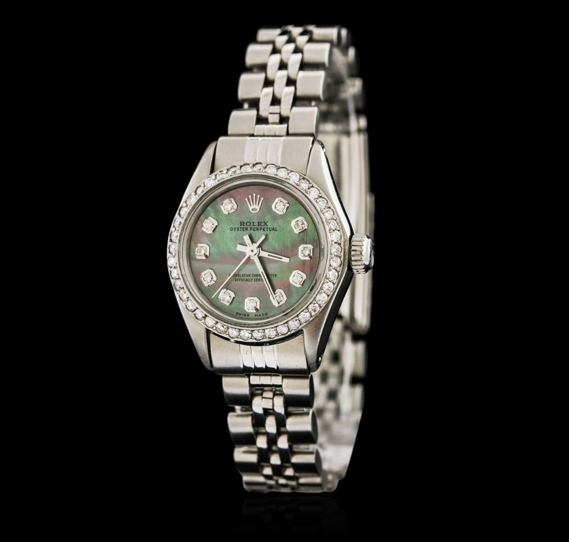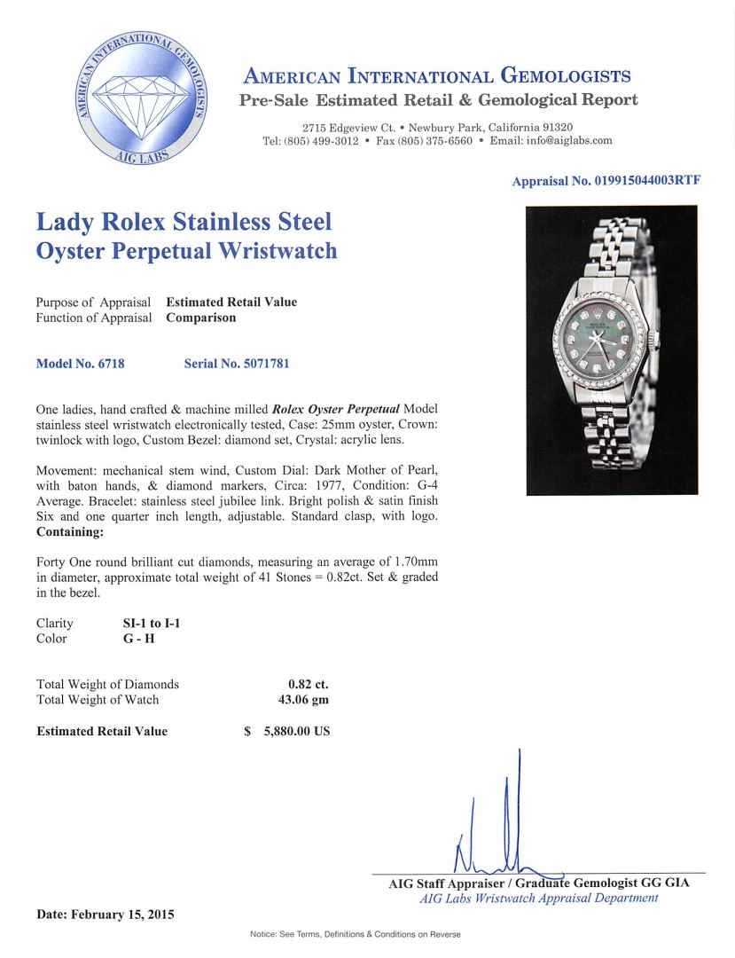 One ladies, hand crafted & machine milled Rolex Oyster Perpetual Model stainless steel wristwatch electronically tested, Case: 25mm oyster, Crown: twinlock with logo, Custom Bezel: diamond set, Crystal: acrylic lens. Movement: mechanical stem wind, Custom Dial: Dark Mother of Pearl, with baton hands, & diamond markers, Circa: 1977, Condition: G-4 Average. Bracelet: stainless steel jubilee link. Bright polish & satin finish Six and one quarter inch length, adjustable. Standard clasp, with logo. Containing: Forty One round brilliant cut diamonds, measuring an average of 1.70mm in diameter, approximate. Total Weight of 41 Stones = 0.82ct. Set & graded in the bezel. Clarity: SI-1 to I-1. Color: G - H. Total Weight of Diamonds 0.82ct. Total Weight of Watch 43.06 grams. AIG Appraised at $5,880.00.