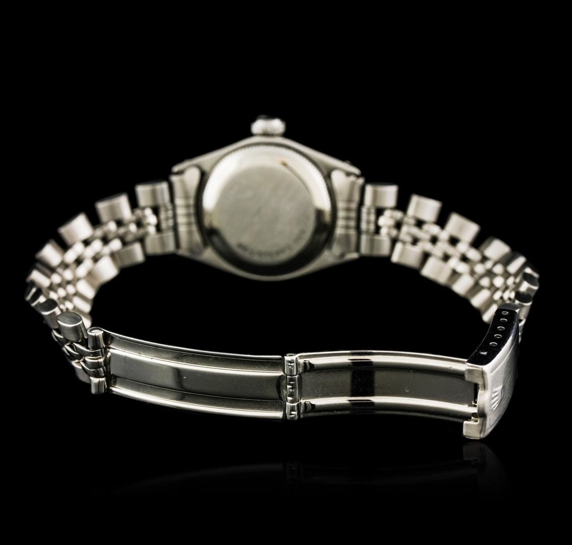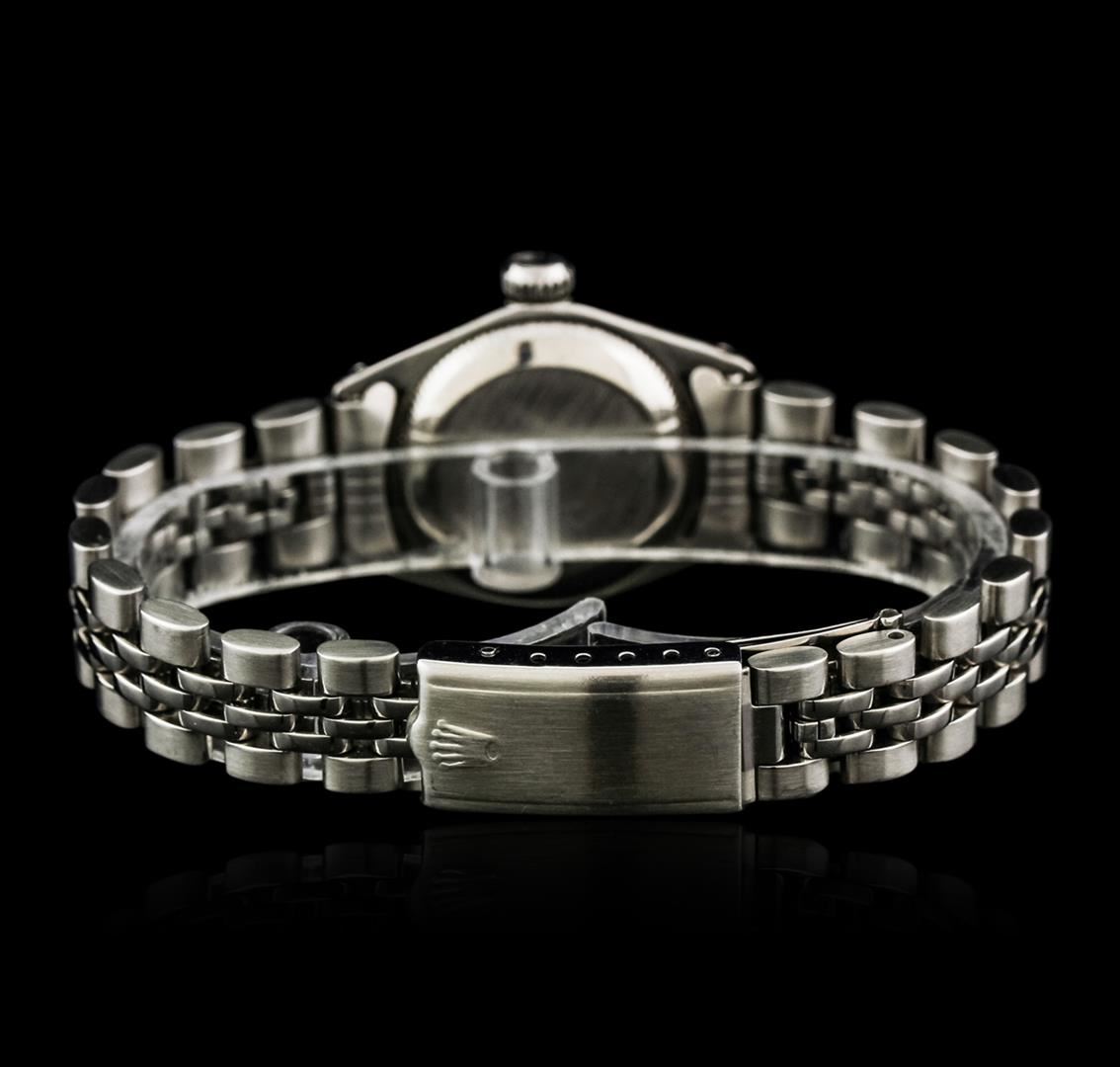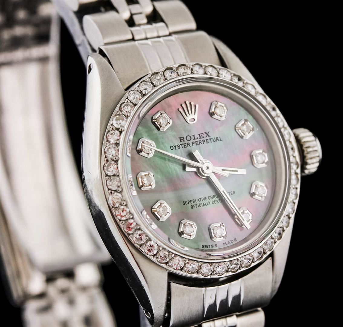 One ladies, hand crafted & machine milled Rolex Oyster Perpetual Model stainless steel wristwatch electronically tested, Case: 25mm oyster, Crown: twinlock with logo, Custom Bezel: diamond set, Crystal: acrylic lens. Movement: mechanical stem wind, Custom Dial: Dark Mother of Pearl, with baton hands, & diamond markers, Circa: 1977, Condition: G-4 Average. Bracelet: stainless steel jubilee link. Bright polish & satin finish Six and one quarter inch length, adjustable. Standard clasp, with logo. Containing: Forty One round brilliant cut diamonds, measuring an average of 1.70mm in diameter, approximate. Total Weight of 41 Stones = 0.82ct. Set & graded in the bezel. Clarity: SI-1 to I-1. Color: G - H. Total Weight of Diamonds 0.82ct. Total Weight of Watch 43.06 grams. AIG Appraised at $5,880.00.