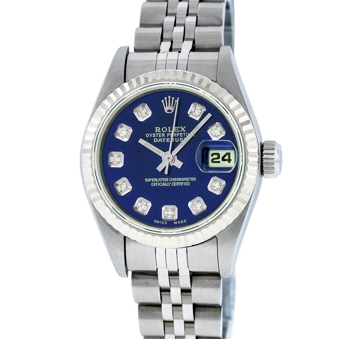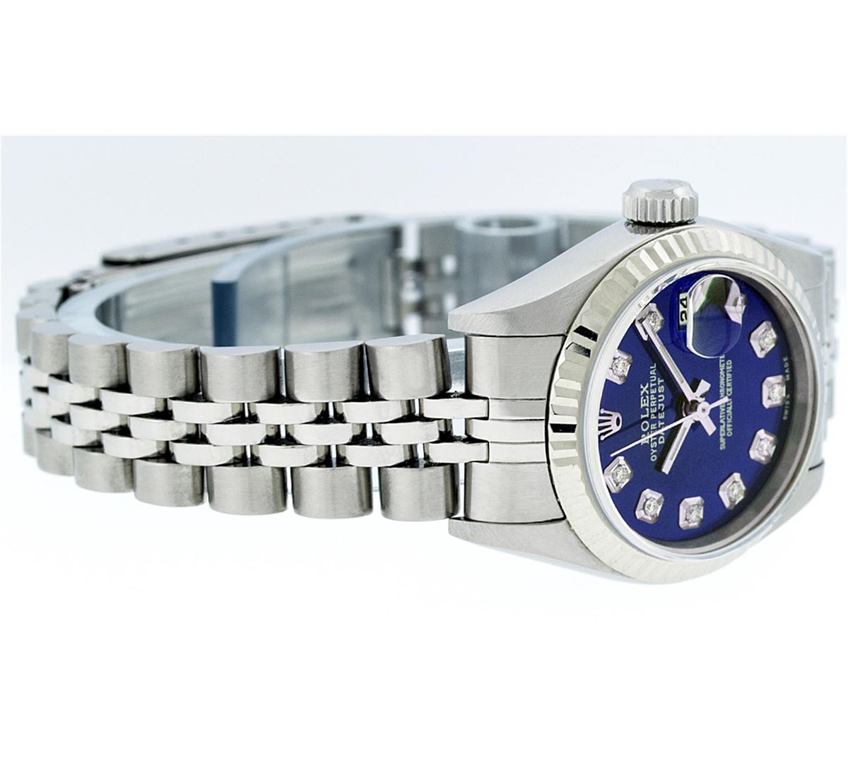 One Ladies Rolex Datejust Polished Bright with Satin Finish, Serviced & Electronically Tested, Stainless Steel Case:26mm, Stainless Steel Crown, Bezel:18K White Gold Fluted Bezel, Custom Crystal: Synthetic Sapphire Cyclops Lens. Movement: Automatic Winding Movement Caliber 2235. Custom Dial: Refinished Blue Diamond Dial, 10 Diamonds in Dial G To H In Color, Clarity: SI-VS. Date Window: 3 O'clock Position Date Display, Model: No Hole Datejust Quickset. Condition: G-6 Extra Fine. Bracelet: Stainless Steel Jubilee Band. Bright Polish & Satin Finish. 6.0 Inch Length, Adjustable. Standard Clasp, With Rolex Logo. Comes with 6 month warranty.