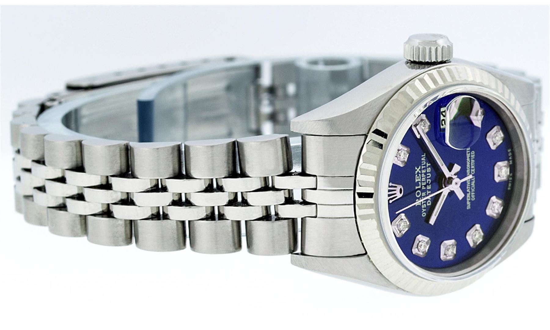 One Ladies Rolex Datejust Polished Bright with Satin Finish, Serviced & Electronically Tested, Stainless Steel Case:26mm, Stainless Steel Crown, Bezel:18K White Gold Fluted Bezel, Custom Crystal: Synthetic Sapphire Cyclops Lens. Movement: Automatic Winding Movement Caliber 2235. Custom Dial: Refinished Blue Diamond Dial, 10 Diamonds in Dial G To H In Color, Clarity: SI-VS. Date Window: 3 O'clock Position Date Display, Model: No Hole Datejust Quickset. Condition: G-6 Extra Fine. Bracelet: Stainless Steel Jubilee Band. Bright Polish & Satin Finish. 6.0 Inch Length, Adjustable. Standard Clasp, With Rolex Logo. Comes with 6 month warranty.