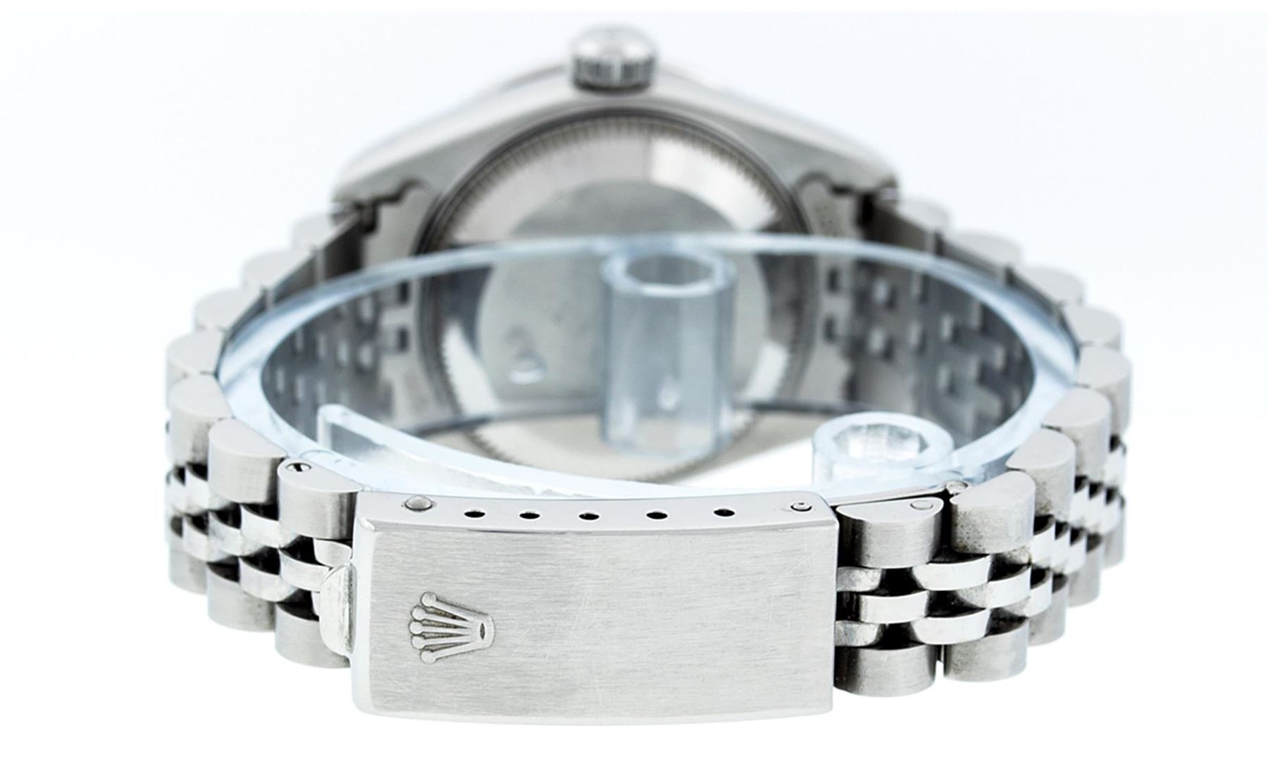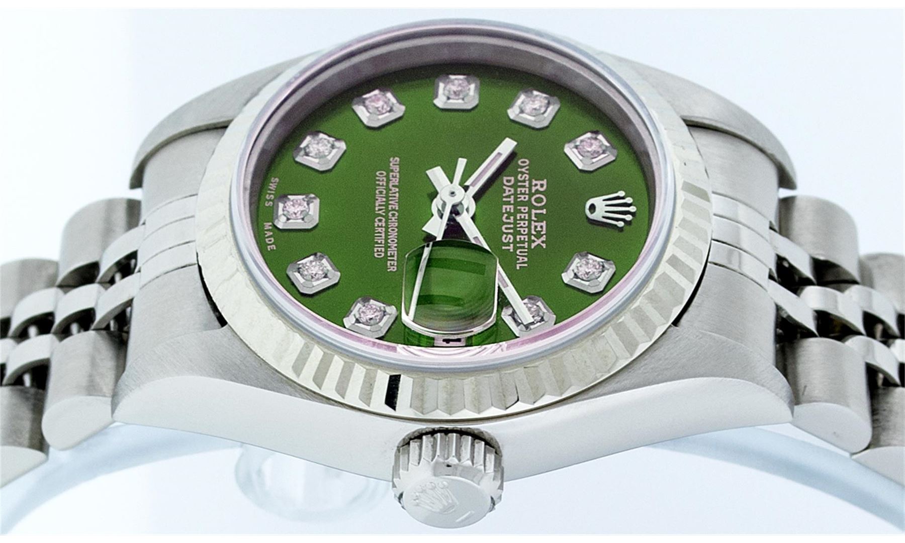 One Ladies Rolex Datejust Polished Bright with Satin Finish, Serviced & Electronically Tested, Stainless Steel Case:26mm, Stainless Steel Crown, Bezel: 18K White Gold Fluted Bezel, Custom Crystal: Synthetic Sapphire Cyclops Lens. Movement: Automatic Winding Movement Caliber 2235. Custom Dial: Refinished Green Diamond Dial, 10 Diamonds in Dial G To H In Color, Clarity: SI-VS. Date Window: 3 O'clock Position Date Display, Model: No Hole Datejust Quickset. Condition: G-6 Extra Fine. Bracelet: Stainless Steel Jubilee Band. Bright Polish & Satin Finish. 6.0 Inch Length, Adjustable. Standard Clasp, With Rolex Logo. Comes with 6 month warranty.