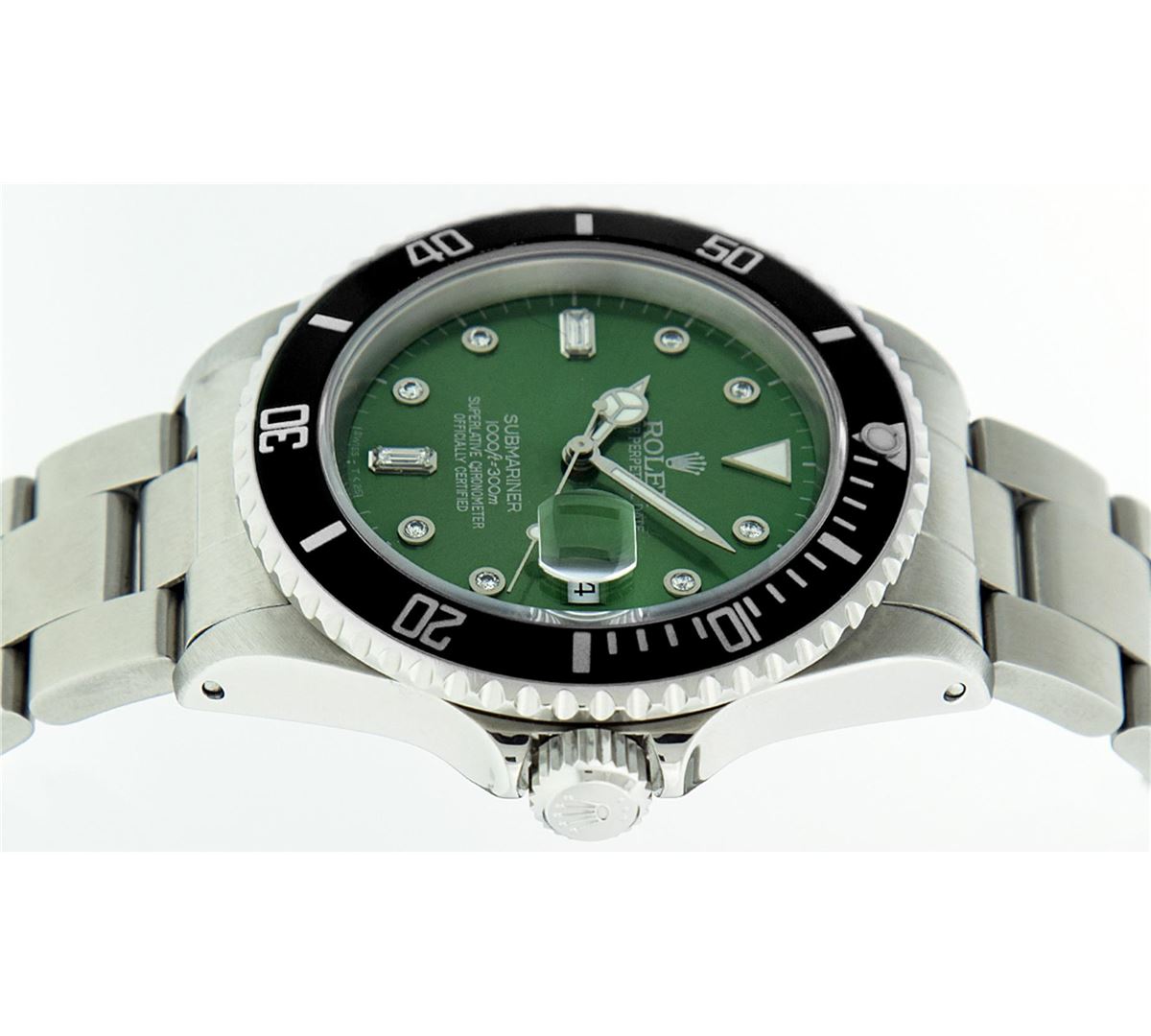 One Mens Rolex Submariner With Date Polished, Serviced & Electronically Tested, Stainless Steel Case:41mm, Stainless Steel Crown, Bezel: Stainless Steel Rotatable Bezel With Black Insert. Crystal: Synthetic Sapphire Cyclops Lens. Movement: Automatic Winding Movement Caliber 3135. Custom Dial: Green Diamond And Baguette Dial, Diamond Count: 8 Diamonds + 2 Baguette, Color: G To H, Clarity: SI-VS. Date Window: 3 O'Clock Position Date Display, Model: Submariner 16610, Quickset, Condition: G-6 Extra Fine. Bracelet: Stainless Steel Oyster. Bright Polish & Satin Finish. 7.0 Inch Length, Adjustable. Standard Clasp, With Rolex Logo. Comes with 6 month warranty.