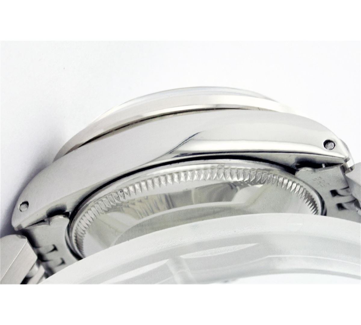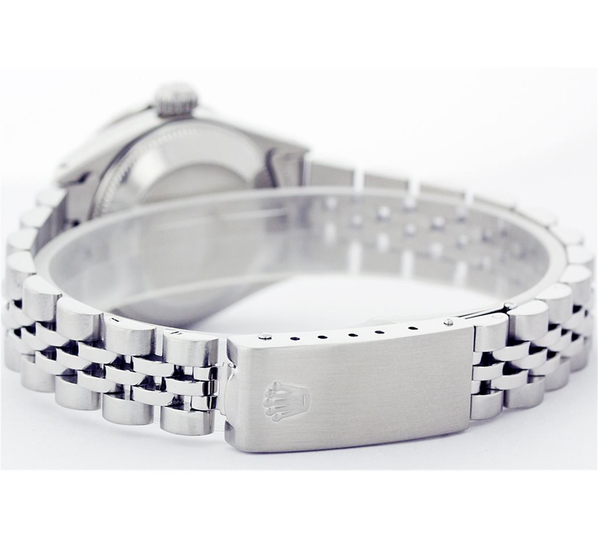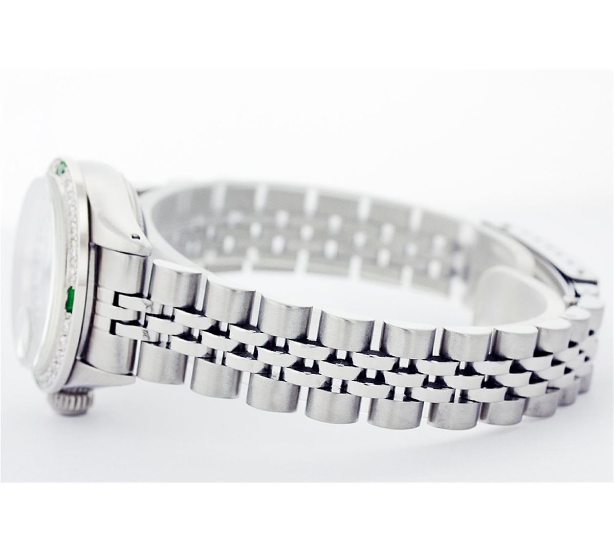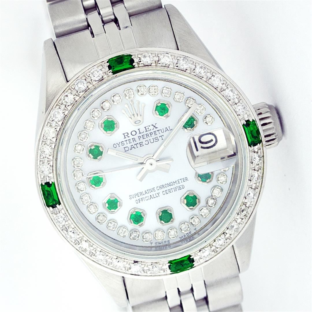 One Ladies Rolex Datejust Polished Bright with Satin Finish, Serviced & Electronically Tested, Stainless Steel Case:26mm, Stainless Steel Crown, Custom Bezel: 18K White Gold Emerald Beadset Diamond Bezel, Diamond + Gem Count: 28 Diamonds + 4 Emeralds Total Weight .70 Carat, Clarity: SI-VS, Color: G to H. Custom Crystal: Synthetic Sapphire Cyclops Lens. Movement: Automatic Winding Movement Caliber 2030. Custom Dial: Refinished Mother Of Pearl With String Diamond Hour Markers, Diamond Count+Gem Count: 10 Emeralds + 33 Diamonds, Clarity: SI-VS, to H. Date Window: 3 O'Clock Position Date Display, Non Quickset, Model: 6917 Condition: G-6 Extra Fine. Bracelet: Stainless Steel Jubilee. Bright Polish & Satin Finish. 5.5 Inch Length, Adjustable. Standard Clasp, With Rolex Logo.
