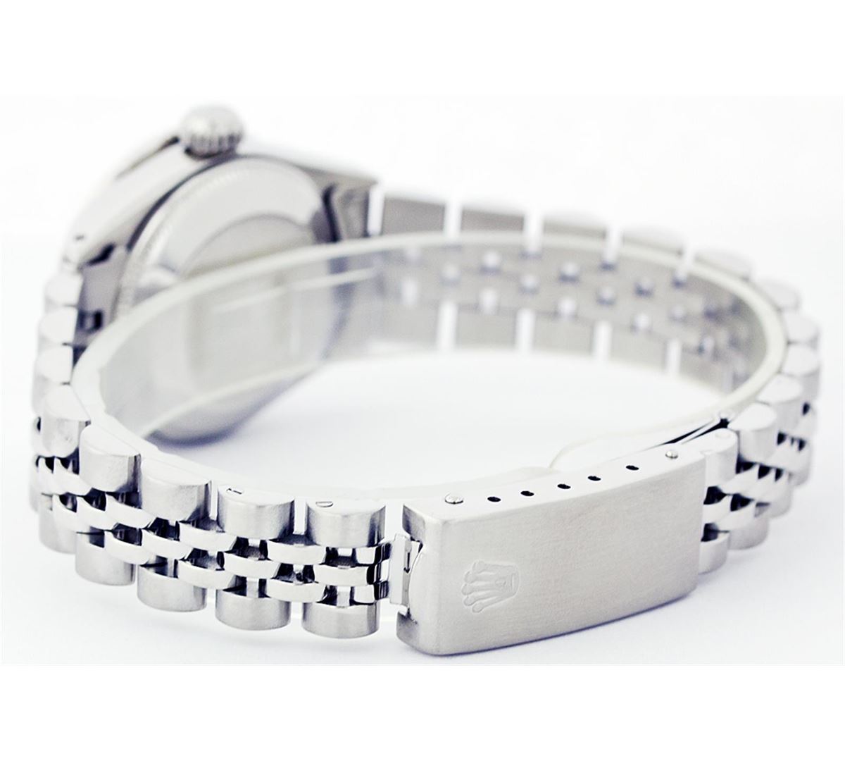 One Ladies Rolex Datejust Polished Bright with Satin Finish, Serviced & Electronically Tested, Stainless Steel Case:26mm, Stainless Steel Crown, Custom Bezel: 18K White Gold Emerald Beadset Diamond Bezel, Diamond + Gem Count: 28 Diamonds + 4 Emeralds Total Weight .70 Carat, Clarity: SI-VS, Color: G to H. Custom Crystal: Synthetic Sapphire Cyclops Lens. Movement: Automatic Winding Movement Caliber 2030. Custom Dial: Refinished Mother Of Pearl With Diamond Hour Markers, Diamond Count: 10 Diamonds, Clarity: SI-VS, Color: G to H. Date Window: 3 O'Clock Position Date Display, Non Quickset, Model: 6917 Condition: G-6 Extra Fine. Bracelet: Stainless Steel Jubilee. Bright Polish & Satin Finish. 5.5 Inch Length, Adjustable. Standard Clasp, With Rolex Logo.