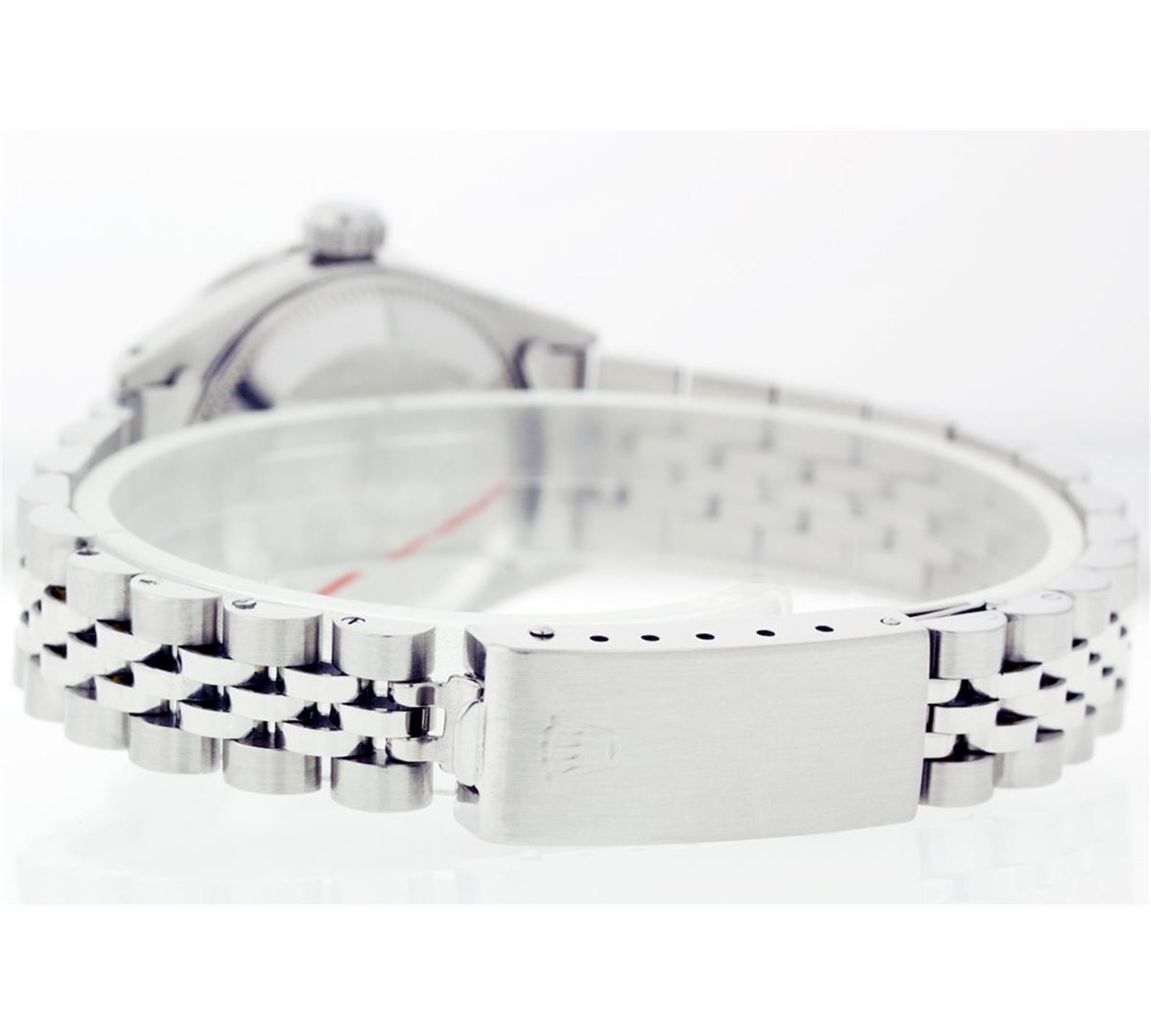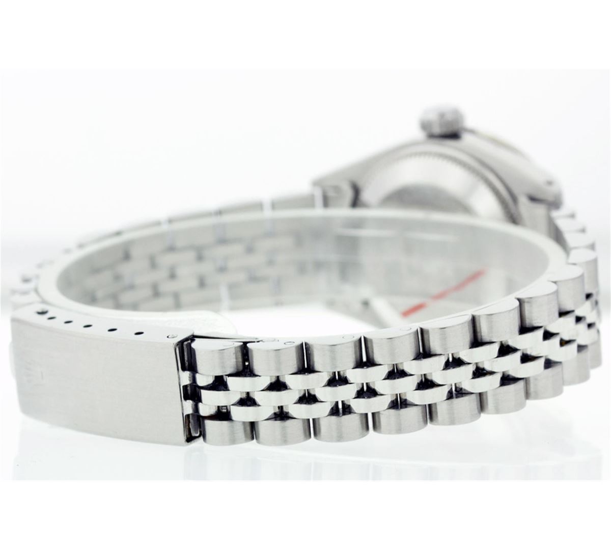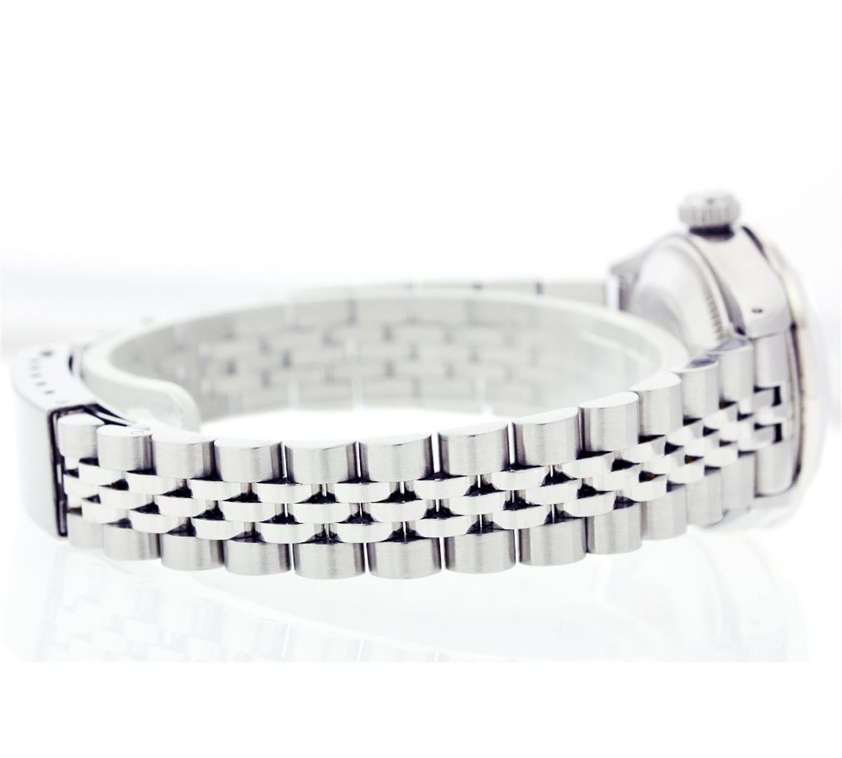 One Ladies Rolex Datejust Polished Bright with Satin Finish, Serviced & Electronically Tested, Stainless Steel Case:26mm, Stainless Steel Crown, Custom Bezel: 18K White Gold Emerald Beadset Diamond Bezel, Diamond + Gem Count: 28 Diamonds + 4 Emeralds Total Weight .70 Carat, Clarity: SI-VS, Color: G to H. Custom Crystal: Synthetic Sapphire Cyclops Lens. Movement: Automatic Winding Movement Caliber 2030. Custom Dial: Refinished Green Vignette With Diamond Hour Markers. Date Window: 3 O'Clock Position Date Display, Non Quickset, Model: 6917 Condition: G-6 Extra Fine. Bracelet: Stainless Steel Jubilee. Bright Polish & Satin Finish. 5.5 Inch Length, Adjustable. Standard Clasp, With Rolex Logo.