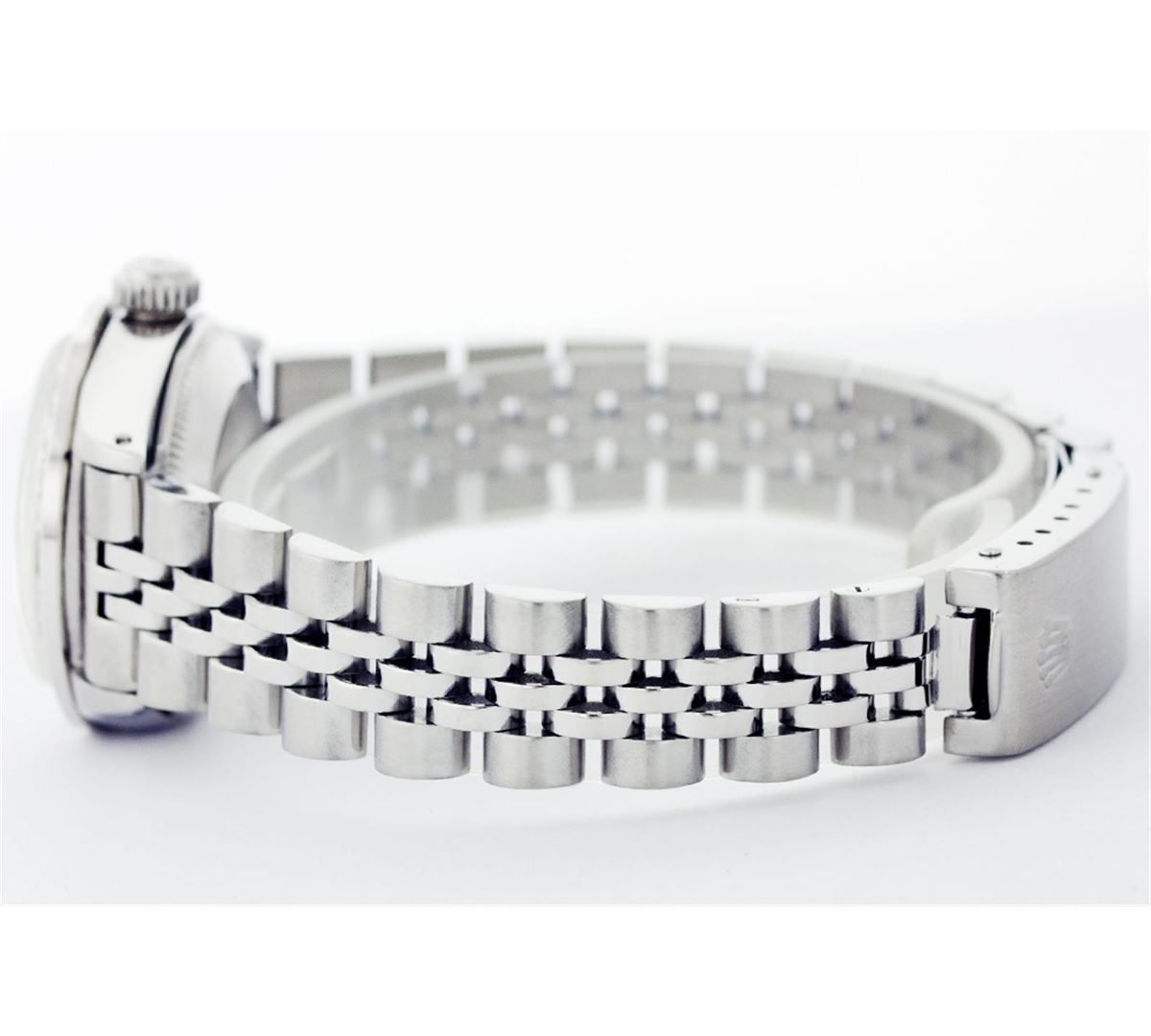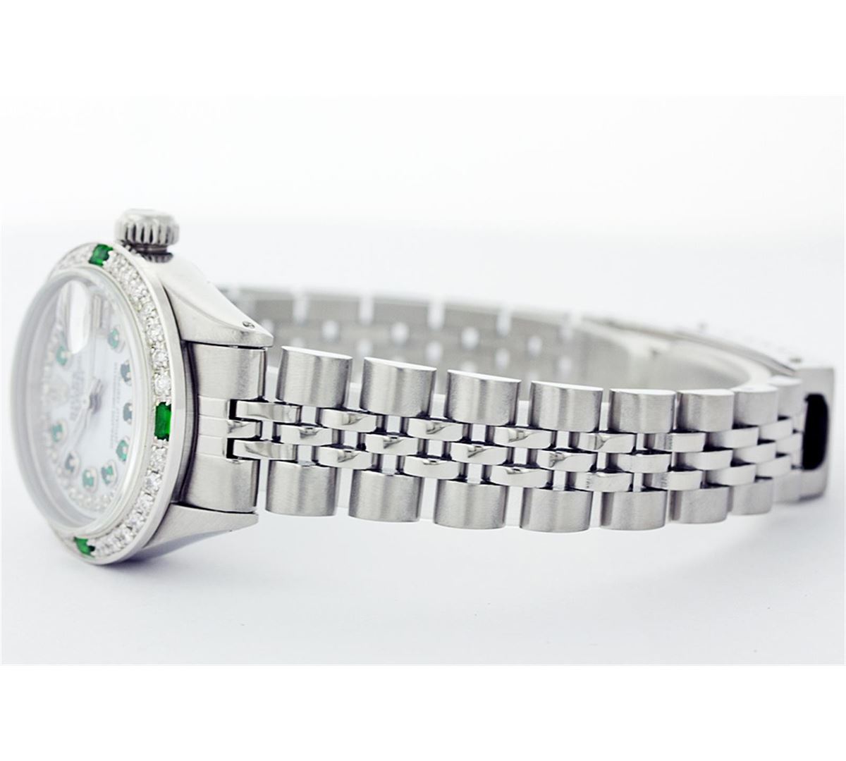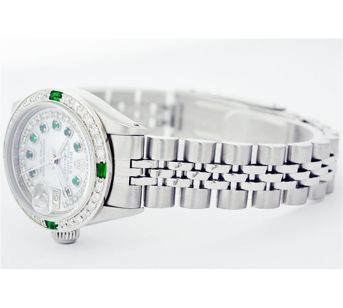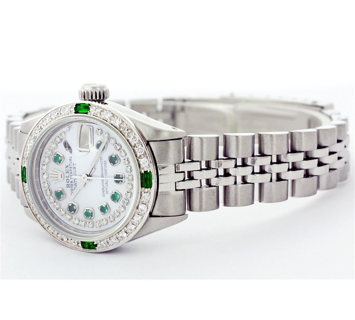 One Ladies Rolex Datejust Polished Bright with Satin Finish, Serviced & Electronically Tested, Stainless Steel Case:26mm, Stainless Steel Crown, Custom Bezel: 18K White Gold Emerald Beadset Diamond Bezel, Diamond + Gem Count: 28 Diamonds + 4 Emeralds Total Weight .70 Carat, Clarity: SI-VS, Color: G to H. Custom Crystal: Synthetic Sapphire Cyclops Lens. Movement: Automatic Winding Movement Caliber 2030. Custom Dial: Refinished Mother Of Pearl With String Diamond Hour Markers, Diamond Count+Gem Count: 10 Emeralds + 33 Diamonds, Clarity: SI-VS, to H. Date Window: 3 O'Clock Position Date Display, Non Quickset, Model: 6917 Condition: G-6 Extra Fine. Bracelet: Stainless Steel Jubilee. Bright Polish & Satin Finish. 5.5 Inch Length, Adjustable. Standard Clasp, With Rolex Logo.
