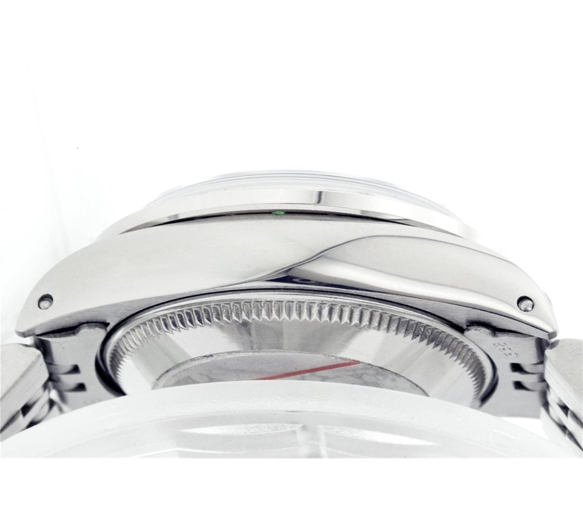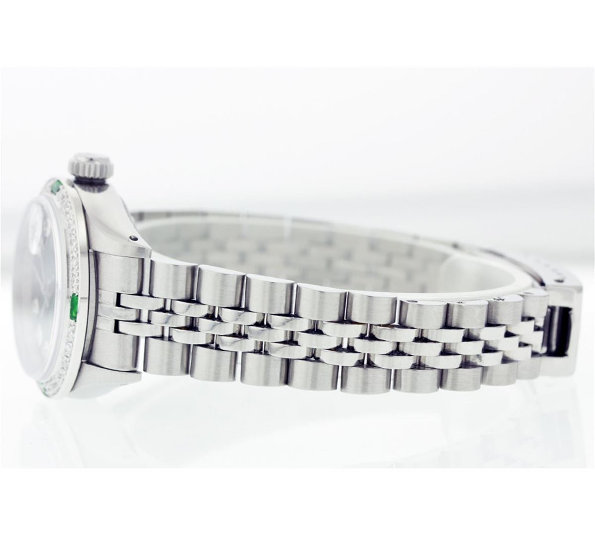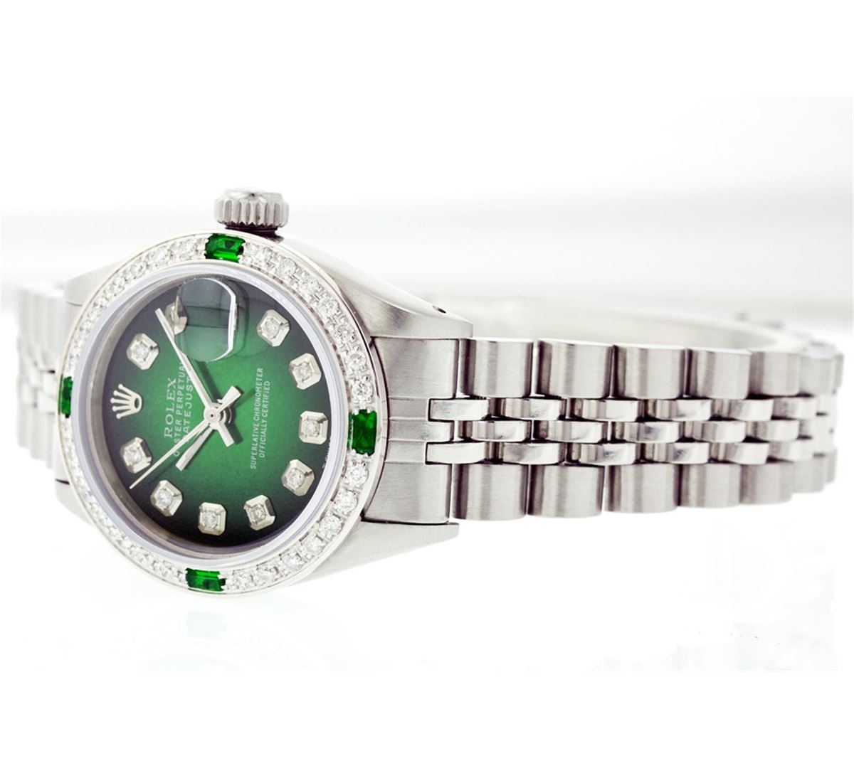 One Ladies Rolex Datejust Polished Bright with Satin Finish, Serviced & Electronically Tested, Stainless Steel Case:26mm, Stainless Steel Crown, Custom Bezel: 18K White Gold Emerald Beadset Diamond Bezel, Diamond + Gem Count: 28 Diamonds + 4 Emeralds Total Weight .70 Carat, Clarity: SI-VS, Color: G to H. Custom Crystal: Synthetic Sapphire Cyclops Lens. Movement: Automatic Winding Movement Caliber 2030. Custom Dial: Refinished Green Vignette With Diamond Hour Markers. Date Window: 3 O'Clock Position Date Display, Non Quickset, Model: 6917 Condition: G-6 Extra Fine. Bracelet: Stainless Steel Jubilee. Bright Polish & Satin Finish. 5.5 Inch Length, Adjustable. Standard Clasp, With Rolex Logo.