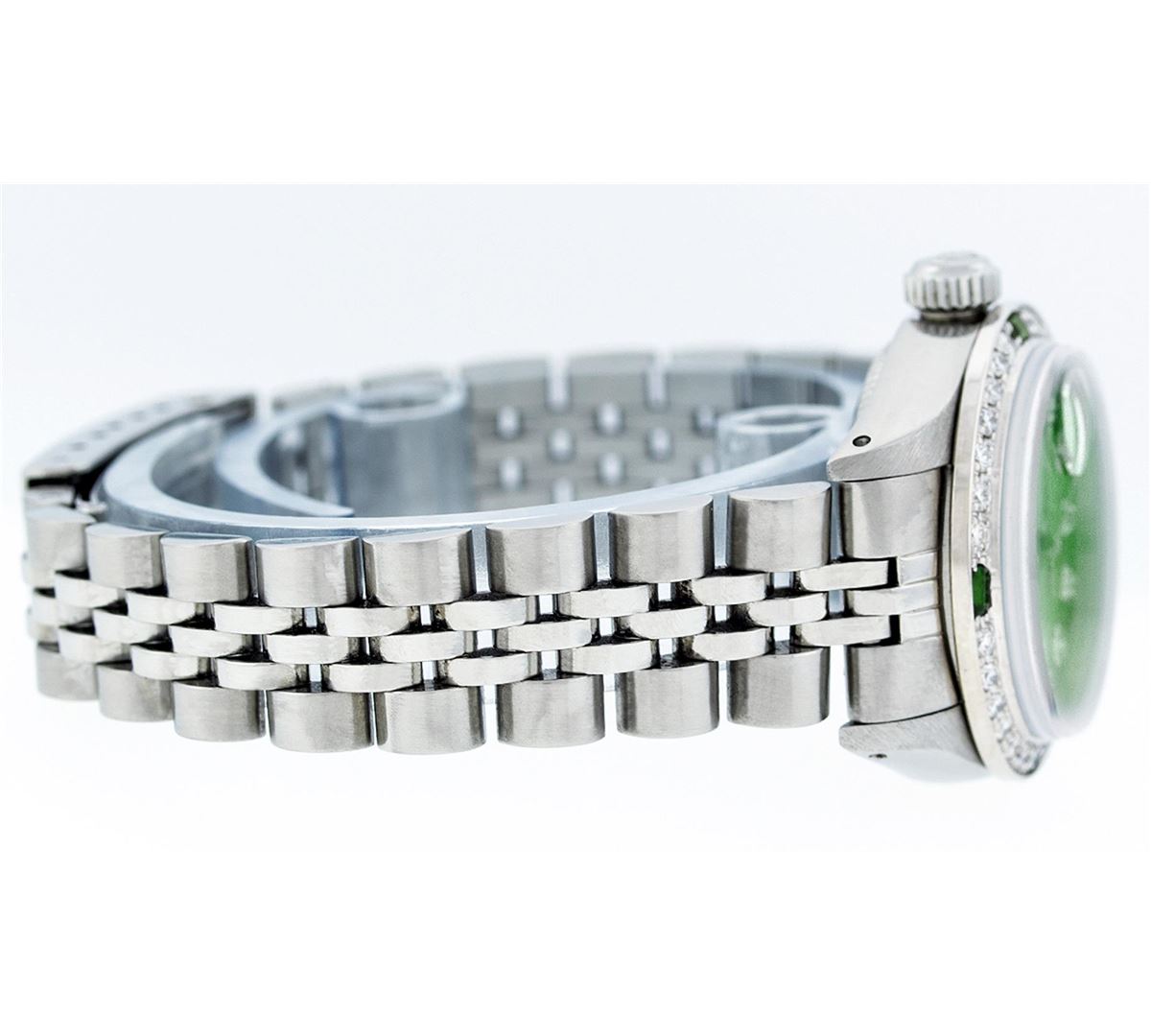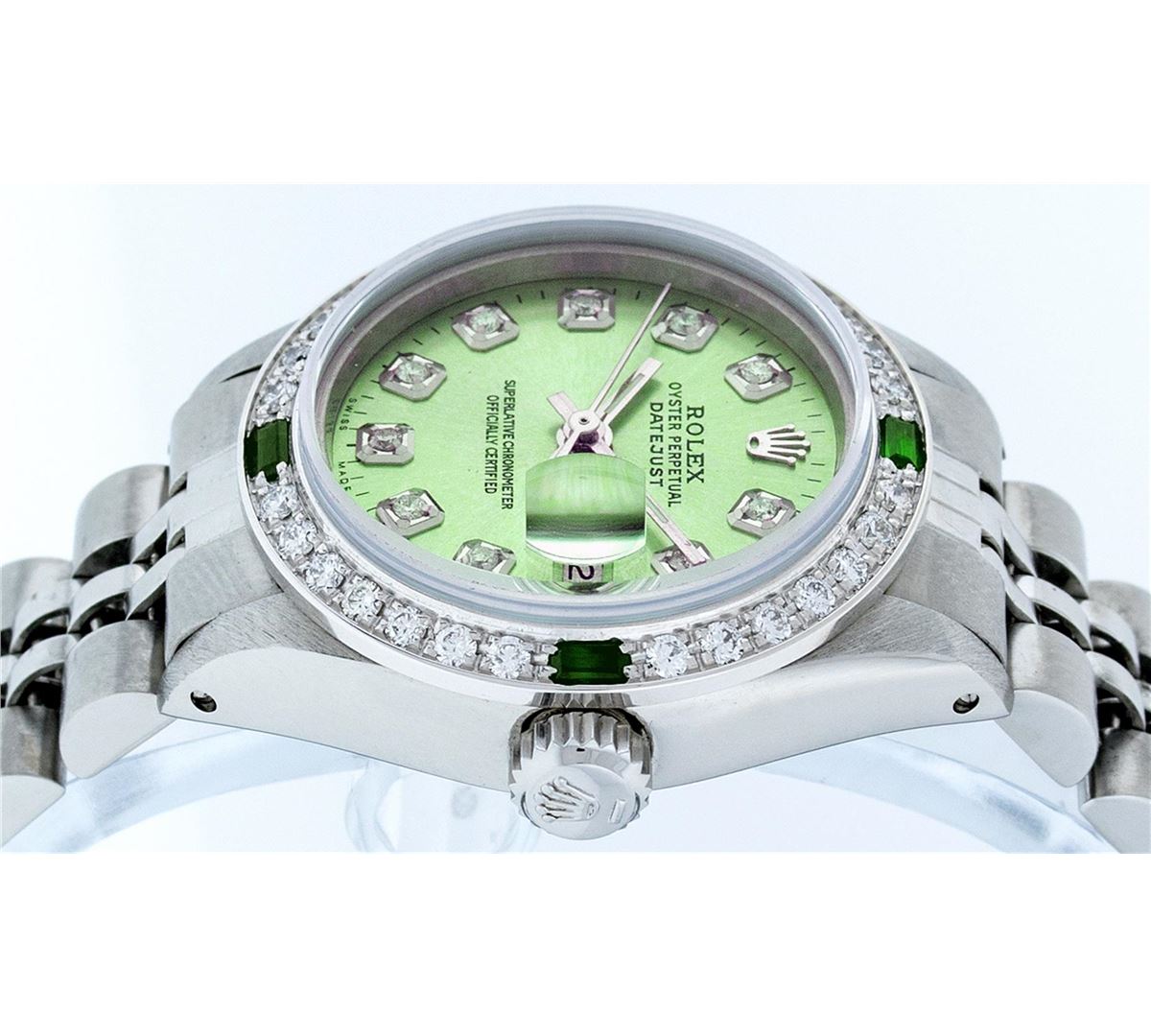 Ladies Rolex Datejust Polished Bright with Satin Finish, Serviced & Electronically Tested, Stainless Steel Case:26mm, Stainless Steel Crown, Custom Bezel: 18K White Gold Emerald Beadset Diamond Bezel, Diamond + Gem Count: 28 Diamonds + 4 Emerald. Total Weight .70 Carat, Clarity: SI-VS, Color: G to H. Custom Crystal: Synthetic Sapphire Cyclops Lens. Movement: Automatic Winding Movement Caliber 2030. Custom Dial: Refinished Ice Green With Diamond Hour Markers. Diamond Count: 10 Diamonds, Color: G To H, Clarity: SI-VS. Date Window: 3 O'Clock Position Date Display, Model: Datejust. Condition: G-6 Extra Fine. Bracelet: Stainless Steel Jubilee. Bright Polish & Satin Finish. 6.0 Inch Length, Adjustable. Standard Clasp, With Rolex Logo. Comes with 6 month warranty.