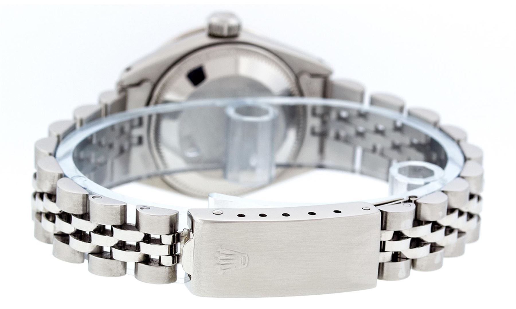 Ladies Rolex Datejust Polished Bright with Satin Finish, Serviced & Electronically Tested, Stainless Steel Case:26mm, Stainless Steel Crown, Custom Bezel: 18K White Gold Emerald Beadset Diamond Bezel, Diamond + Gem Count: 28 Diamonds + 4 Emeralds. Total Weight .70 Carat, Clarity: SI-VS, Color: G to H. Custom Crystal: Synthetic Sapphire Cyclops Lens. Movement: Automatic Winding Movement Caliber 2030. Custom Dial: Refinished Sky Blue With Diamond Hour Markers. Diamond Count: 10 Diamonds, Color: G To H, Clarity: SI-VS. Date Window: 3 O'Clock Position Date Display, Model: Datejust. Condition: G-6 Extra Fine. Bracelet: Stainless Steel Jubilee. Bright Polish & Satin Finish. 6.0 Inch Length, Adjustable. Standard Clasp, With Rolex Logo. Comes with 6 month warranty.