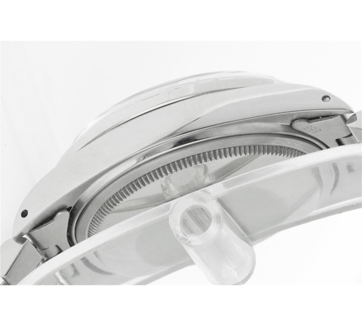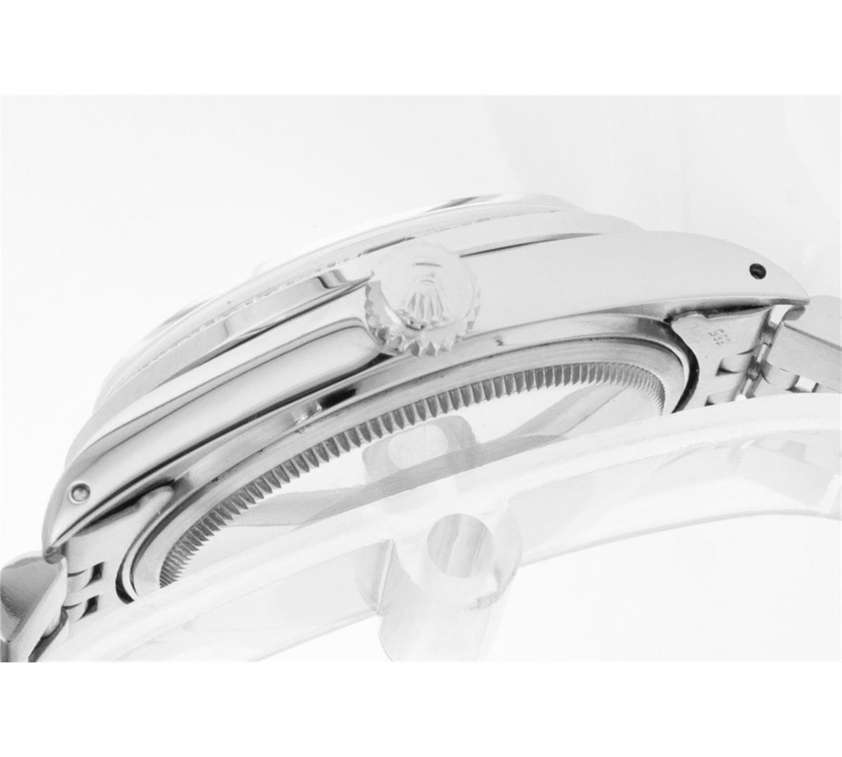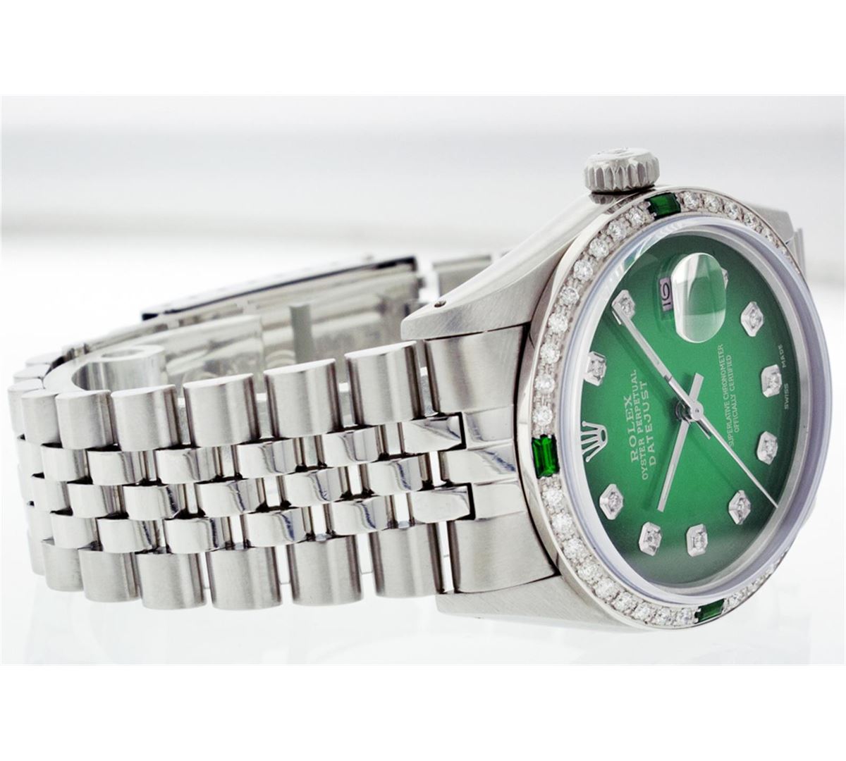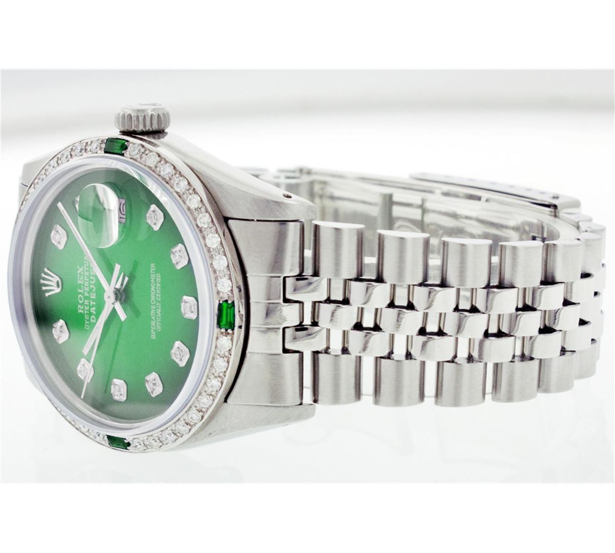 One Gents Rolex Datejust Polished, Serviced & Electronically Tested, Stainless Steel Case:36mm, Stainless Steel Crown, Custom Bezel: 18K White Gold Emerald Beadset Diamond Bezel, Diamond + Gem Count: 36 Diamonds + 4 Emeralds Total Weight 1.00 Carat, Clarity: SI-VS, Color: G to H. Custom Crystal: Synthetic Sapphire Cyclops Lens. Movement: Automatic Winding Movement Caliber 3035. Custom Dial: Green Vignette With Diamond Hour Markers, 10 Diamond Dial G To H In Color, Clarity: SI-VS. Date Window: 3 O'Clock Position Date Display, Quickset, Model: 16014 Condition: G-6 Extra Fine. Bracelet: Stainless Steel Jubilee. Bright Polish & Satin Finish. 6.5 Inch Length, Adjustable. Standard Clasp, With Rolex Logo.
