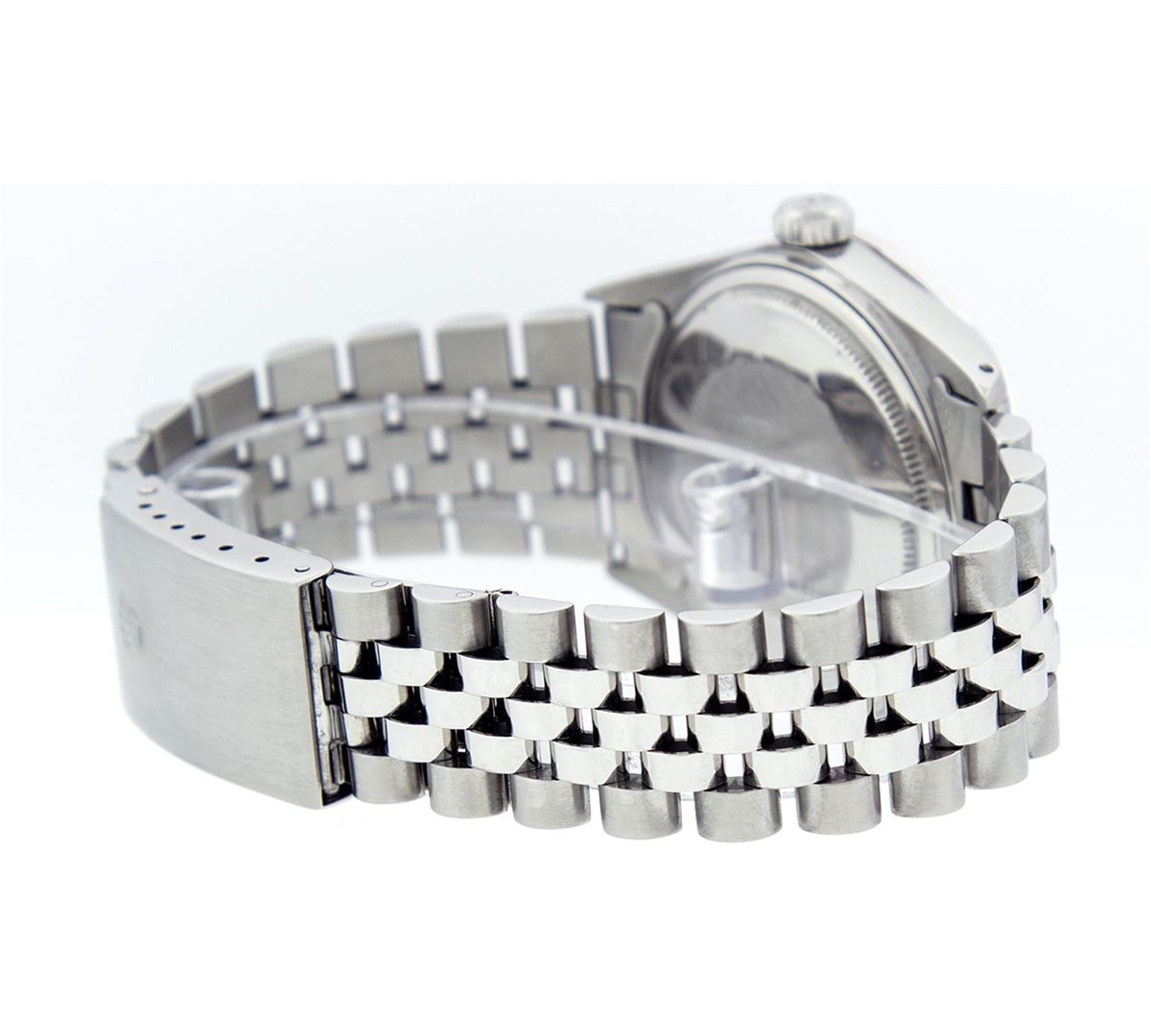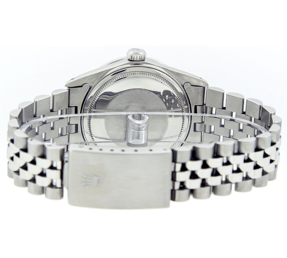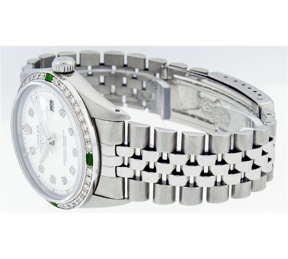 One Mens Rolex Datejust Polished Bright with Satin Finish, Serviced & Electronically Tested, Stainless Steel Case:36mm, Stainless Steel Crown, Custom Bezel: 18K White Gold Emerald Beadset Diamond Bezel, Diamond + Gem Count: 36 Diamonds + 4 Emeralds. Total Weight 1.00 Carat, Clarity: Si-VS, Color: G to H. Custom Crystal: Synthetic Sapphire Cyclops Lens. Movement: Automatic Winding Movement Caliber 3035. Custom Dial: White Diamond Dial With Square Roman Track, Diamond Count: 10 Diamonds Square Setting, Color: G to H, Clarity: SI-VS.. Date Window: 3 O'Clock Position Date Display, Quickset, Model: Datejust. Condition: G-6 Extra Fine. Bracelet: Stainless Steel Jubilee. Bright Polish & Satin Finish. 7.0 Inch Length, Adjustable. Standard Clasp, With Rolex Logo. Comes with 6 month warranty.