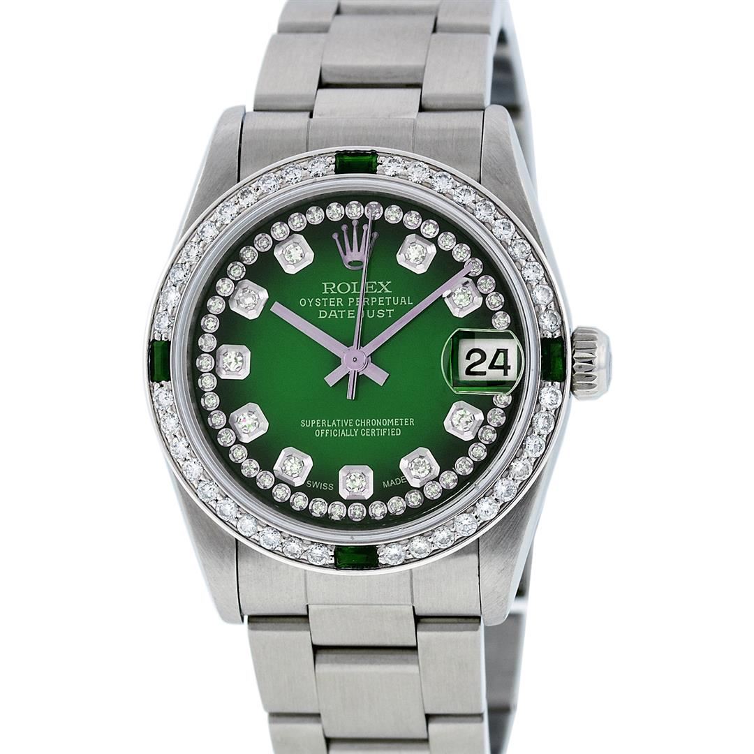 One Midsize Stainless Steel Rolex Datejust Polished, Serviced & Electronically Tested, Stainless Steel Case Case:31mm, Stainless Steel Crown, Custom Bezel: 18K White Gold Emerald Beadset Bezel, Diamond Count: 40 Diamonds + 4 Emeralds, Total Weight: 1 Carat, Color: G To H, Clarity: VS2-SI1. Custom Crystal: Synthetic Sapphire Cyclops Lens. Movement: Automatic Winding Movement Caliber 2235. Custom Dial: Green Vignette Diamond Dial VVS. Color: G to H, Clarity: VVS, Date Window: 3 O'Clock Position Date Display, Quickset, Model: Midsize Datejust. Condition: G-6 Extra Fine The Watch Is In Very Good Condition Free Of All Scratches And Dents. Bracelet: Stainless Steel Oyster Band. Bright Polish. 6.0 Inch Length, Adjustable. Standard Clasp, With Rolex Logo. Comes with 6 month warranty.